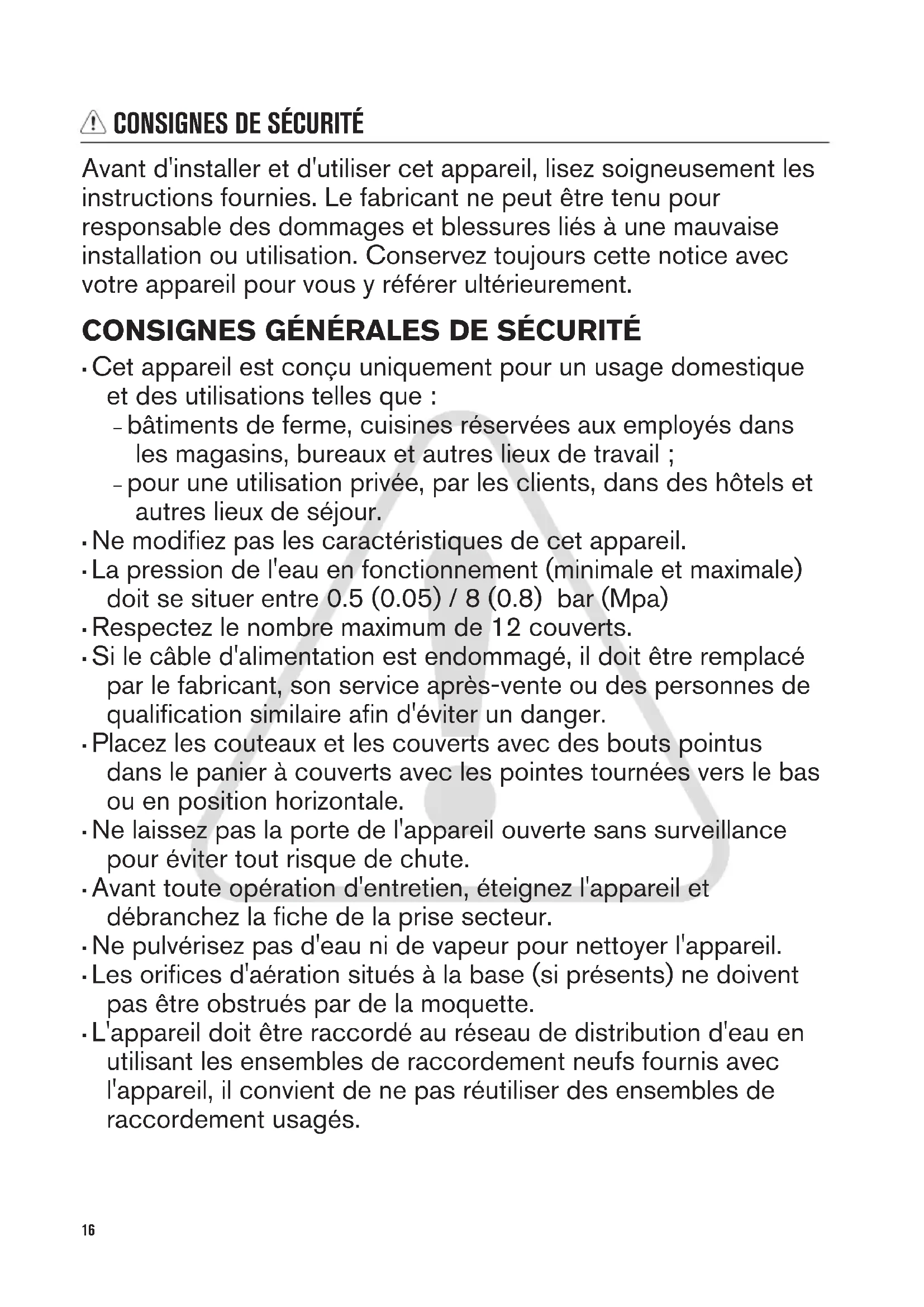 - L'appareil doit être raccordé au réseau de distribution d'eau en utilisant les ensembles de raccordement neufs fournis avec l'appareil, il convient de ne pas réutiliser des ensembles de raccordement usagés. 16SÉCURITÉ DES ENFANTS ET DES PERSONNES VULNÉRABLES