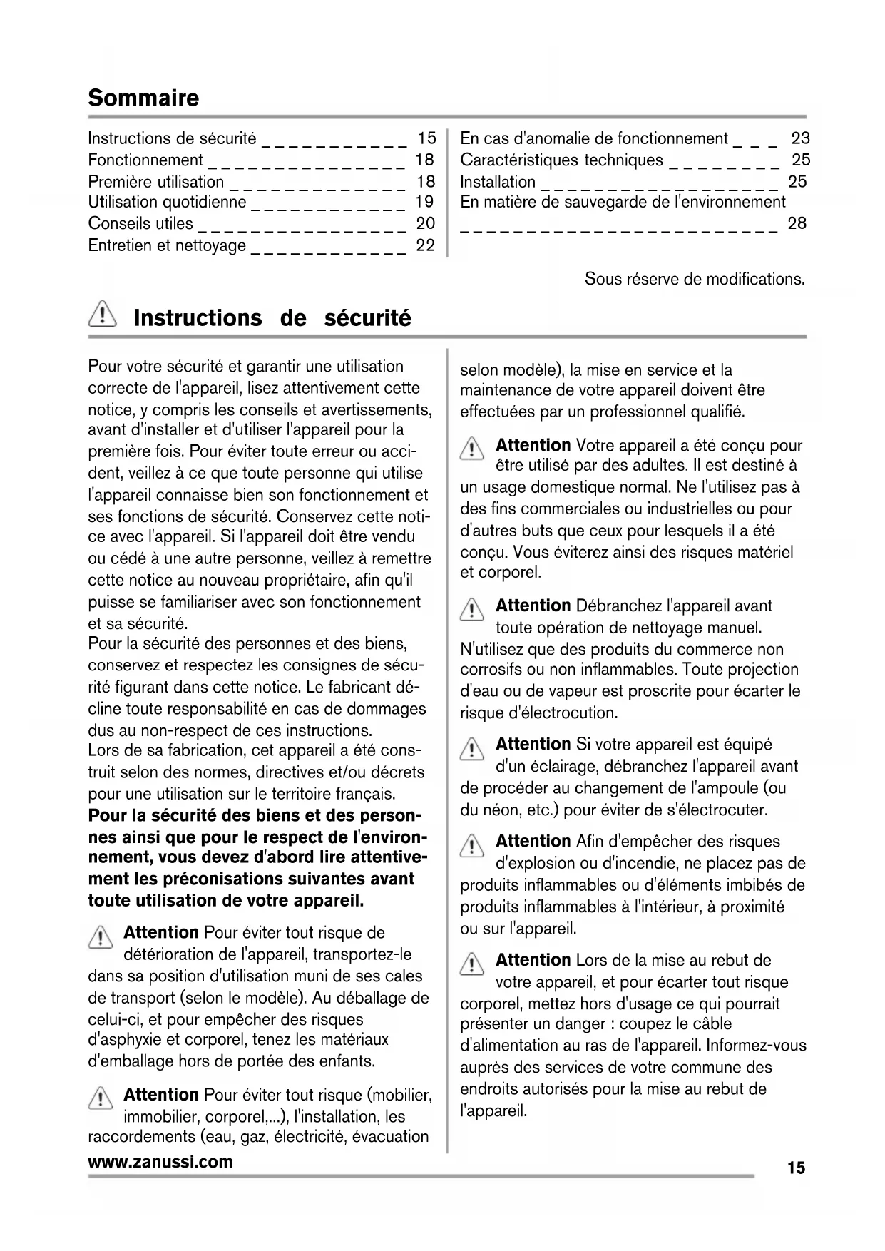www.zanussi.comSommaire Instructions de sécurité _ _ _ _ _ _ _ _ _ _ _ 15 Fonctionnement _ _ _ _ _ _ _ _ _ _ _ _ _ _ _ 18 Première utilisation _ _ _ _ _ _ _ _ _ _ _ _ _ 18 Utilisation quotidienne _ _ _ _ _ _ _ _ _ _ _ _ 19 Conseils utiles _ _ _ _ _ _ _ _ _ _ _ _ _ _ _ _ 20 Entretien et nettoyage _ _ _ _ _ _ _ _ _ _ _ _ 22 En cas d'anomalie de fonctionnement _ _ _ 23 Caractéristiques techniques _ _ _ _ _ _ _ _ 25 Installation _ _ _ _ _ _ _ _ _ _ _ _ _ _ _ _ _ _ 25 En matière de sauvegarde de l'environnement _ _ _ _ _ _ _ _ _ _ _ _ _ _ _ _ _ _ _ _ _ _ _ _ 28 Sous réserve de modifications. Instructions de sécurité Pour votre sécurité et garantir une utilisation correcte de l'appareil, lisez attentivement cette notice, y compris les conseils et avertissements, avant d'installer et d'utiliser l'appareil pour la première fois. Pour éviter toute erreur ou acci- dent, veillez à ce que toute personne qui utilise l'appareil connaisse bien son fonctionnement et ses fonctions de sécurité. Conservez cette noti- ce avec l'appareil. Si l'appareil doit être vendu ou cédé à une autre personne, veillez à remettre cette notice au nouveau propriétaire, afin qu'il puisse se familiariser avec son fonctionnement et sa sécurité. Pour la sécurité des personnes et des biens, conservez et respectez les consignes de sécu- rité figurant dans cette notice. Le fabricant dé- cline toute responsabilité en cas de dommages dus au non-respect de ces instructions. Lors de sa fabrication, cet appareil a été cons- truit selon des normes, directives et/ou décrets pour une utilisation sur le territoire français. Pour la sécurité des biens et des person- nes ainsi que pour le respect de l'environ- nement, vous devez d'abord lire attentive- ment les préconisations suivantes avant toute utilisation de votre appareil. Attention Pour éviter tout risque de détérioration de l'appareil, transportez-le dans sa position d'utilisation muni de ses cales de transport (selon le modèle). Au déballage de celui-ci, et pour empêcher des risques d'asphyxie et corporel, tenez les matériaux d'emballage hors de portée des enfants. Attention Pour éviter tout risque (mobilier, immobilier, corporel,...), l'installation, les raccordements (eau, gaz, électricité, évacuation selon modèle), la mise en service et la maintenance de votre appareil doivent être effectuées par un professionnel qualifié. Attention Votre appareil a été conçu pour être utilisé par des adultes. Il est destiné à un usage domestique normal. Ne l'utilisez pas à des fins commerciales ou industrielles ou pour d'autres buts que ceux pour lesquels il a été conçu. Vous éviterez ainsi des risques matériel et corporel. Attention Débranchez l'appareil avant toute opération de nettoyage manuel. N'utilisez que des produits du commerce non corrosifs ou non inflammables. Toute projection d'eau ou de vapeur est proscrite pour écarter le risque d'électrocution. Attention Si votre appareil est équipé d'un éclairage, débranchez l'appareil avant de procéder au changement de l'ampoule (ou du néon, etc.) pour éviter de s'électrocuter. Attention Afin d'empêcher des risques d'explosion ou d'incendie, ne placez pas de produits inflammables ou d'éléments imbibés de produits inflammables à l'intérieur, à proximité ou sur l'appareil. Attention Lors de la mise au rebut de votre appareil, et pour écarter tout risque corporel, mettez hors d'usage ce qui pourrait présenter un danger : coupez le câble d'alimentation au ras de l'appareil. Informez-vous auprès des services de votre commune des endroits autorisés pour la mise au rebut de l'appareil.