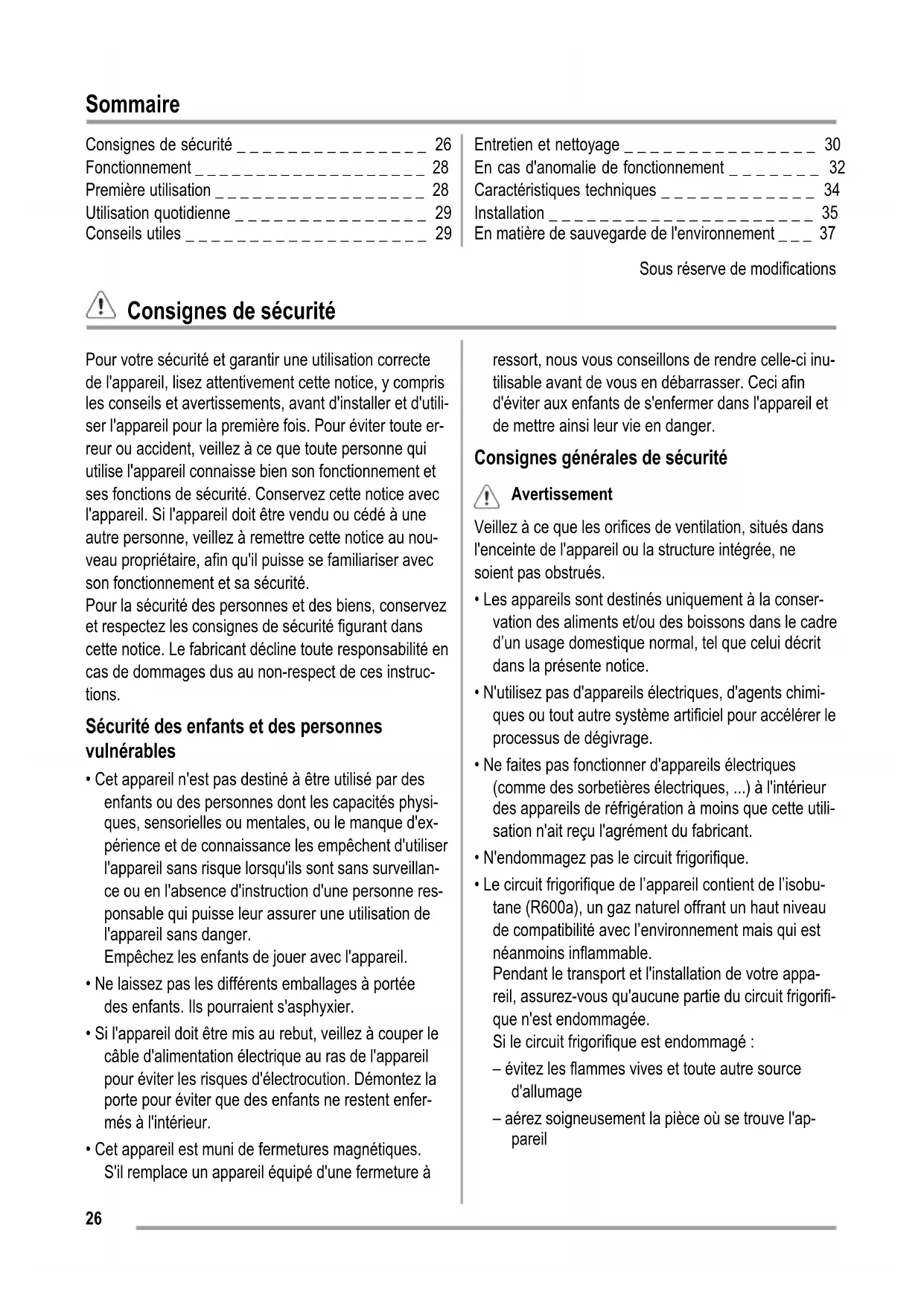- The magnetic sealing strip is attached tightly to the cabinet. 24Important! If the ambient temperature is low (for example, in the Winter), the size of the gasket decreases. The size of the gasket increases when the ambient temperature increases. Environmental concerns The symbol on the product or on its packaging indicates that this product may not be treated as household waste. Instead it should be taken to the appropriate collection point for the recycling of electrical and electronic equipment. By ensuring this product is disposed of correctly, you will help prevent potential negative consequences for the environment and human health, which could otherwise be caused by inappropriate waste handling of this product. For more detailed information about recycling of this product, please contact your local council, your household waste disposal service or the shop where you purchased the product. 25Sommaire Consignes de sécurité _ _ _ _ _ _ _ _ _ _ _ _ _ _ _ 26 Fonctionnement _ _ _ _ _ _ _ _ _ _ _ _ _ _ _ _ _ _ _ 28 Première utilisation _ _ _ _ _ _ _ _ _ _ _ _ _ _ _ _ _ 28 Utilisation quotidienne _ _ _ _ _ _ _ _ _ _ _ _ _ _ _ 29 Conseils utiles _ _ _ _ _ _ _ _ _ _ _ _ _ _ _ _ _ _ _ 29 Entretien et nettoyage _ _ _ _ _ _ _ _ _ _ _ _ _ _ _ 30 En cas d'anomalie de fonctionnement _ _ _ _ _ _ _ 32 Caractéristiques techniques _ _ _ _ _ _ _ _ _ _ _ _ 34 Installation _ _ _ _ _ _ _ _ _ _ _ _ _ _ _ _ _ _ _ _ _ 35 En matière de sauvegarde de l'environnement _ _ _ 37 Sous réserve de modifications Consignes de sécurité Pour votre sécurité et garantir une utilisation correcte de l'appareil, lisez attentivement cette notice, y compris les conseils et avertissements, avant d'installer et d'utili- ser l'appareil pour la première fois. Pour éviter toute er- reur ou accident, veillez à ce que toute personne qui utilise l'appareil connaisse bien son fonctionnement et ses fonctions de sécurité. Conservez cette notice avec l'appareil. Si l'appareil doit être vendu ou cédé à une autre personne, veillez à remettre cette notice au nou- veau propriétaire, afin qu'il puisse se familiariser avec son fonctionnement et sa sécurité. Pour la sécurité des personnes et des biens, conservez et respectez les consignes de sécurité figurant dans cette notice. Le fabricant décline toute responsabilité en cas de dommages dus au non-respect de ces instruc- tions. Sécurité des enfants et des personnes vulnérables