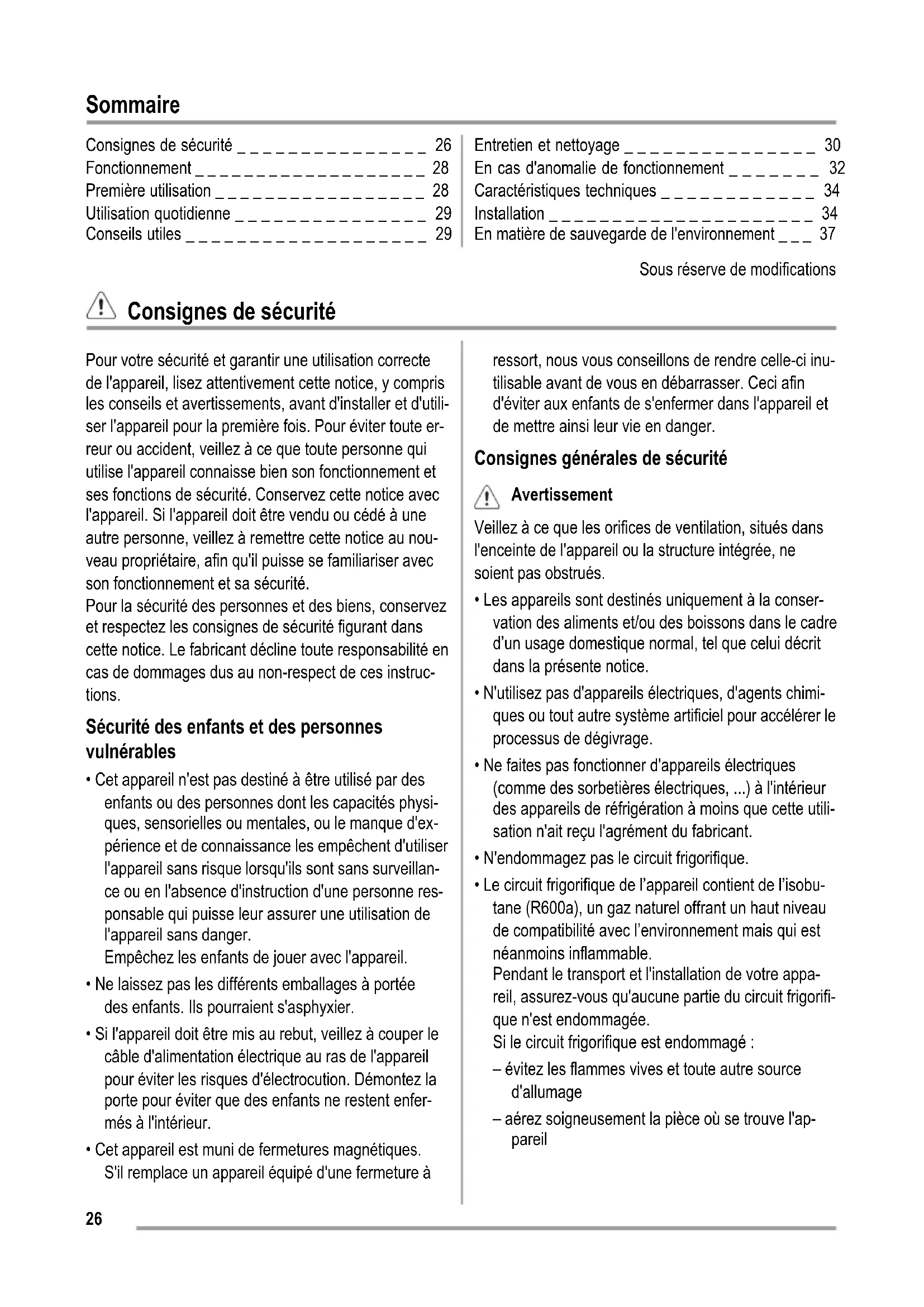 - Le circuit frigorifique de l’appareil contient de l’isobu- tane (R600a), un gaz naturel offrant un haut niveau de compatibilité avec l’environnement mais qui est néanmoins inflammable. Pendant le transport et l'installation de votre appa- reil, assurez-vous qu'aucune partie du circuit frigorifi- que n'est endommagée. Si le circuit frigorifique est endommagé : – évitez les flammes vives et toute autre source d'allumage – aérez soigneusement la pièce où se trouve l'ap- pareil 26• Ne modifiez pas les spécifications de l'appareil. Si le câble d'alimentation est endommagé, il peut causer un court circuit, un incendie et/ou une électrocution. Avertissement Les éventuelles réparations ou in- terventions sur votre appareil, ainsi que le rempla- cement du câble d'alimentation, ne doivent être effec- tuées que par un professionnel qualifié.
