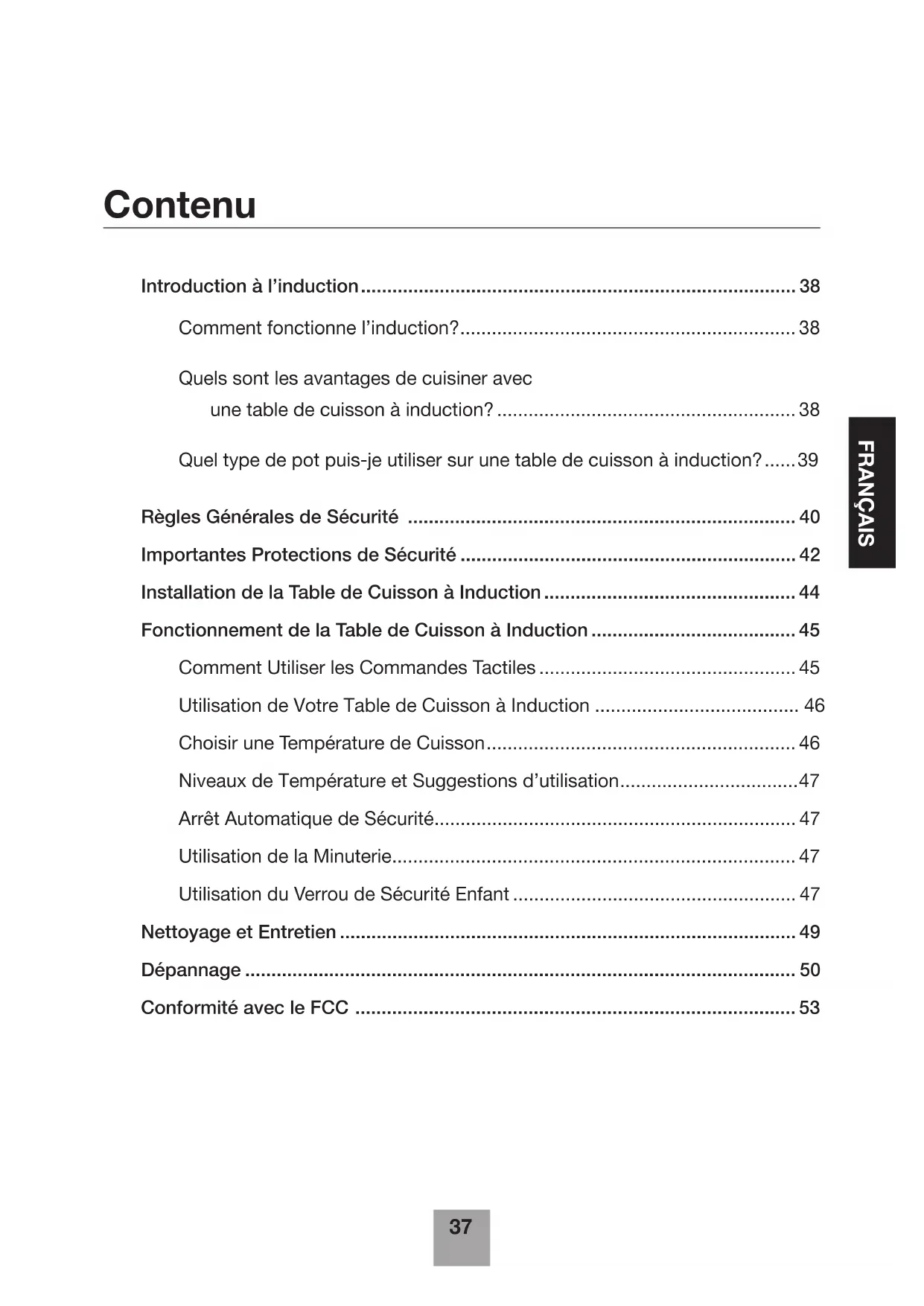 - Lea cuidadosamente por favor su Manual de Usuario antes de utilizar su placa de inducción por primera vez. No seguir las instrucciones dadas en el Manual de Usuario anulará su garantía.37 FRANÇAIS Contenu Introduction à l’induction ................................................................................... 38 Comment fonctionne l’induction? ................................................................ 38 Quels sont les avantages de cuisiner avec une table de cuisson à induction? ......................................................... 38 Quel type de pot puis-je utiliser sur une table de cuisson à induction? ...... 39 Règles Générales de Sécurité .......................................................................... 40 Importantes Protections de Sécurité ................................................................ 42 Installation de la Table de Cuisson à Induction ................................................ 44 Fonctionnement de la Table de Cuisson à Induction ....................................... 45 Comment Utiliser les Commandes Tactiles ................................................. 45 Utilisation de Votre Table de Cuisson à Induction ....................................... 46 Choisir une Température de Cuisson ........................................................... 46 Niveaux de Température et Suggestions d’utilisation .................................. 47 Arrêt Automatique de Sécurité ..................................................................... 47 Utilisation de la Minuterie ............................................................................. 47 Utilisation du Verrou de Sécurité Enfant ...................................................... 47 Nettoyage et Entretien ....................................................................................... 49 Dépannage ......................................................................................................... 50 Conformité avec le FCC .................................................................................... 5338 FRANÇAIS Introduction à l’induction Comment fonctionne l’induction? Une table de cuisson à induction comporte une série de bobines d’induction (Fondé sur des principes de champ magnétiques). Ces bobines génèrent un champ magnétique qui induit une réaction de chaleur dans les chaudrons et poêlons ayant une base en acier ou en fer. Ainsi, ce sont les ustensiles eux-mêmes qui réchauffent les aliments plutôt que la surface de cuisson. Quels sont les avantages de cuisiner avec une table de cuisson à induction? EFFICACITÉ: la cuisson par induction est la cuisson la plus écologique et la plus économe en énergie. Les tables de cuisson à induction utilisent 90% de l’énergie produite, ce qui est beaucoup plus éconergétique que les tables de cuisson à gaz ou à l’électricité. En reconnaissant la base de l’ustensile de cuisson, l’induction ne chauffe que le diamètre du pot. Ainsi, très peu d’énergie est gaspillée. De plus, l’induction n’émet pas de amme, donc moins de chaleur résiduelle est produite dans votre cuisine. SANS DANGER: Il n’y a pas de ammes ni d’émission de gaz et la surface reste tiède au toucher. RAPIDE: les changements de chauffage, ce qui permet une réduction du temps de cuisson pouvant atteindre 50 % par rapport aux méthodes de cuisson à gaz et à l’électricité. RÉPARTITION UNIFORME DE LA CHALEUR: évite la création de points chauds et de ronds de chaleur sur le fond des ustensiles de cuisson puisque la chaleur y est répartie de façon uniforme. FACILE À NETTOYER: la surface est plane et lisse. Les renversements et les débordements ne collent pas à la surface de cuisson et il est donc facile de les essuyer pour les nettoyer. casserole table de cuisson bobines à induction39 FRANÇAIS Quel type d’ustensiles de cuisson puis-je utiliser sur une table de cuisson à induction? Comme l’induction est fondée sur des principes magnétiques, les ustensiles de cuisson utilisés doivent avoir une base ferreuse (à base de fer, magnétique). Certains types d’ustensiles de cuisson sont faits de métaux naturellement magnétiques (tels que le fer pur), tandis que d’autres sont conçus pour être magnétisables par l’incorporation en « sandwich » d’une mince couche d’un métal ferreux dans la base. C’est cette couche de la base qui va être affectée par le champ magnétique de la table de cuisson à induction et qui va distribuer la chaleur. Ustensiles compatibles avec la cuisson par induction: