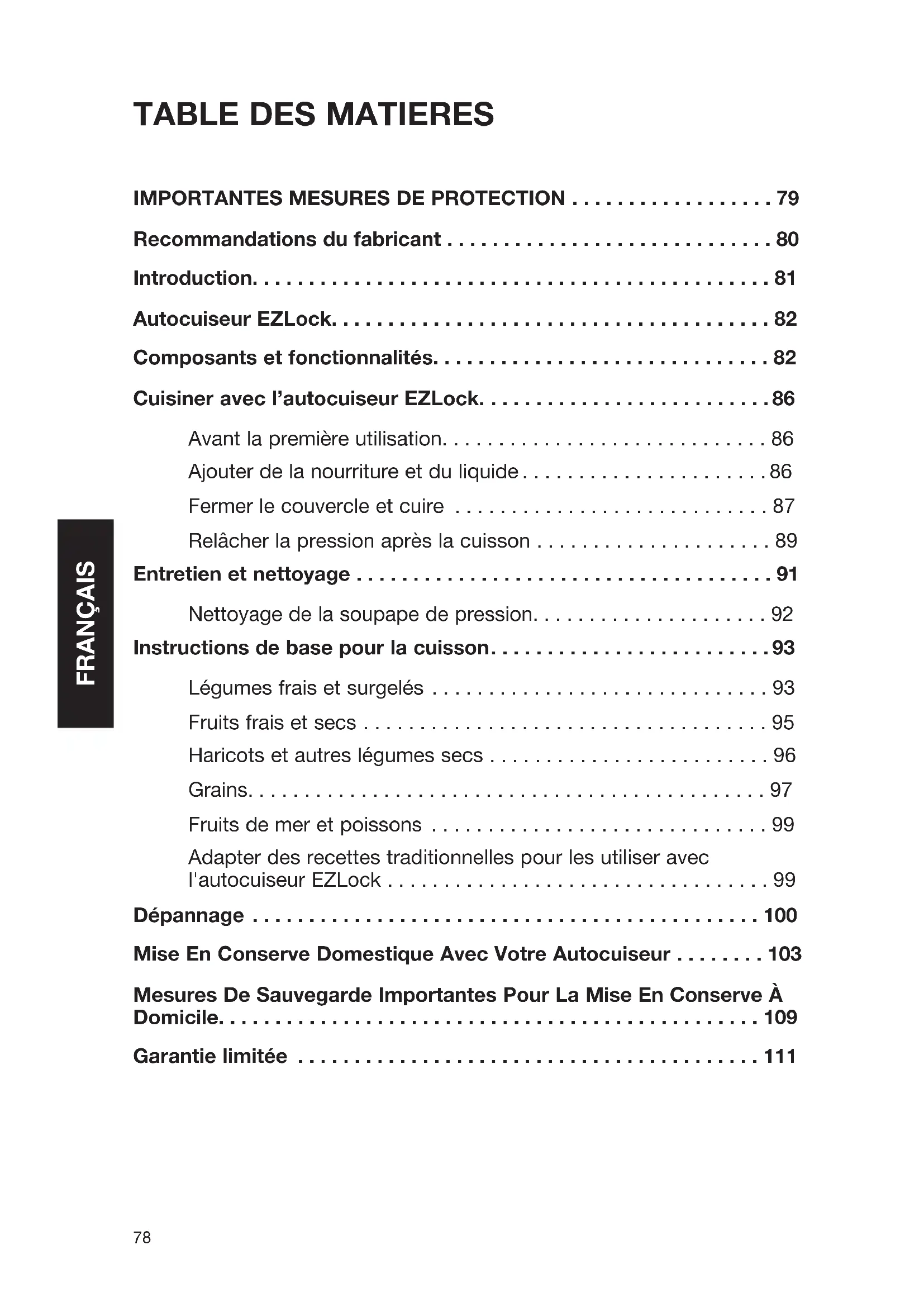 - Adapter des recettes traditionnelles pour les utiliser avec l'autocuiseur EZLock p. 99