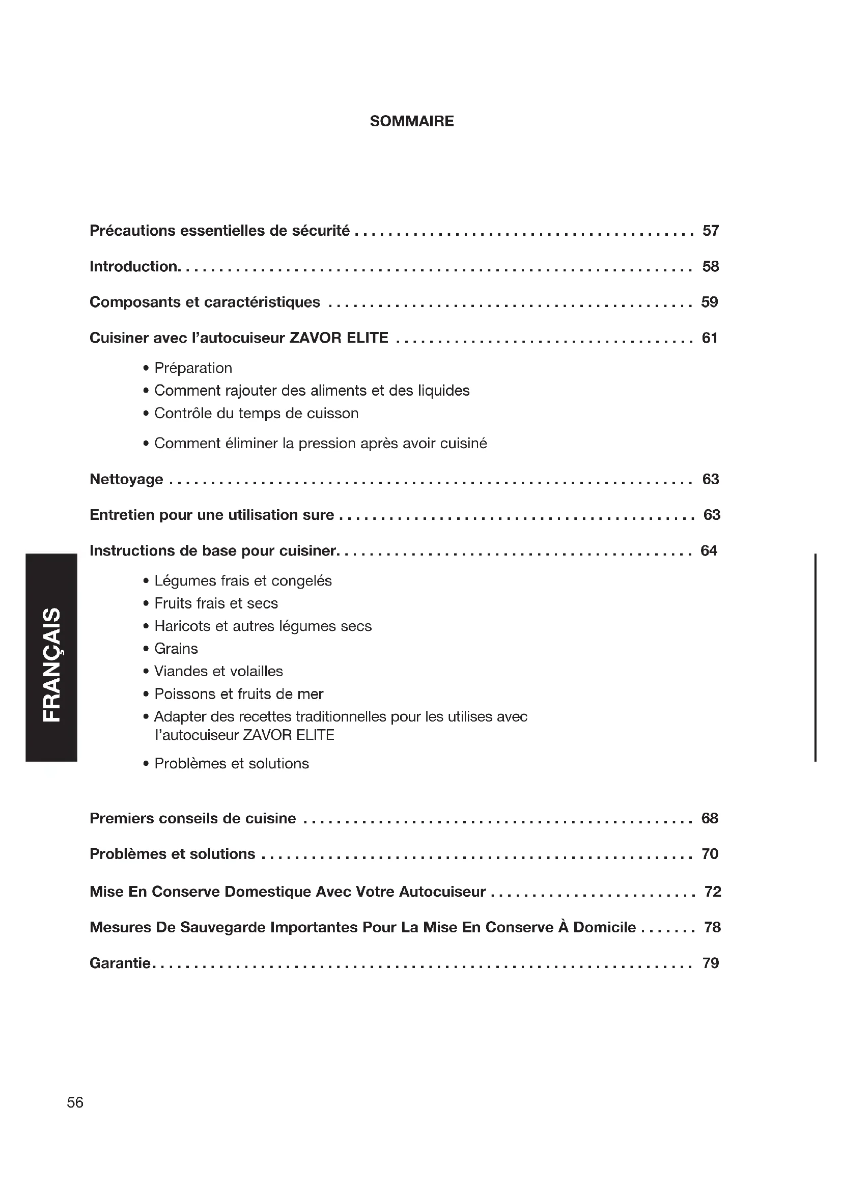 Mesures de sécurité à respecter pour une utilisation sûre de l’auto-cuiseur: FRANÇAIS58 Les autocuiseurs d’aujourd’hui sont, sans aucun doute, très différents de ceux qu’ont utilisé nos mères et nos grands- mères. Lorsqu’ils furent introduits sur le marché, à la fin des années 1930, les autocuiseurs étaient considérés comme l’un des meilleurs alliés des maîtresses de maison car il leur permettait de préparer des repas délicieux, bons pour la santé, économiques et de gagner du temps par rapport aux méthodes traditionnelles. Si les arguments concernant la santé et la cuisson rapide sont encore valables, la conception et l’ingénierie des autocui- seurs ont subi une évolution significative. Comme ils sont entourés d’innombrables mythes, les autocuiseurs sont certaine- ment les ustensiles de cuisine les moins bien compris. Ceci est réellement lamen- table car les autocuiseurs présentent de nombreux avantages par rapport aux méthodes de cuisson traditionnelles. Et l’un des arguments majeurs est que les aliments peuvent être préparés en un tiers du temps normalement requis. Comme les aliments sont cuits sur un laps de temps plus court, ils perdent moins de leur couleur et de leur saveur. Ils retiennent davantage les minéraux et les vitamines qui sont, normalement, lavés par la préparation dans de grandes quantités d’eau, des récipients ouverts et une cuisson longue. Les autocuiseurs ZAVOR, fabriqués en acier inoxydable de haute qualité et gros calibre, sont conçus pour leur fonctionnalité et leur sécurité, car ils rem-plissent toutes les normes internationales de sécurité. Si vous savez ce que signifie cuisiner avec un autocuiseur, vous cons-taterez que la soupape tournante des anciens autocuiseurs a été éliminée. Vous ne devrez plus penser à vérifier si elle fonctionne correctement ou s’il y a trop de pression dans l’autocuiseur puisque quatre soupapes de sortie de pression et un régulateur de pression ont été incor-porées au couvercle. Ce régulateur de pression ZAVOR, simple à utiliser, fait qu’il est plus facile que jamais de déterminer la pression correcte et de la maintenir puisque ces soupapes indiquent quand il faut réduire ou augmenter la source de chaleur pour avoir le niveau de pression souhaité. Avec une utilisation et un entretien appro-priés, votre autocuiseur ZAVOR vous assurera de nombreuses années d’usage sans soucis et de délicieux repas rapides et faciles à préparer. Introduction FRANÇAIS59 Autocuiseur Elite de ZAVOR Composants et caractéristiques