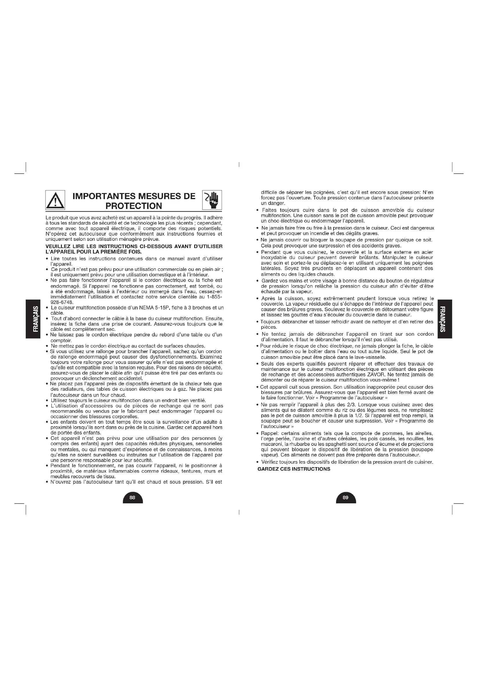 Table des Matières Introduction 87 Importantes Mesures de Protection 88 Caractéristiques et Fonctions 90 Tableau des Icônes Graphiques 93 Avant la Première Utilisation 94 Fonctions de Fonctionnement 95 Fonction de Cuisson à la Pression 95 Tableaux de Cuisson à la Pression 98 Fonction de Cuisson Lente 102 Fonction pour Cuire à la Vapeur 104 Fonction Faire Sauter 105 Fonction Flex 107 Utilisation de la Fonction Flex pour Sous Vide 109 Fonction Faire Mijoter 111 Fonction de Yogourt 112 Fonction Grains 117 Fonction Oeufs 120 Fonction Dessert 122 Fonction de Silence 125 Nettoyage et Entretien 125 Dépannage 127 Introduction Merci d’avoir acheté ce cuiseur multifonction perfectionné Zavor LUX™ LCD! Le Zavor LUX™ LCD peut cuire à la vapeur, faire mijoter, sauté, cuire les grains, les œufs, les desserts, faire du yogourt, cuire à la pression et cuire lentement les aliments à la perfection. Il est équipé d’un nouvel écran LCD convivial qui a facile à naviguer menu avec des paramètres programmés qui vous permettent de préparer vos repas préférés plus facilement. De plus, les paramètres pratiques de TIME DELAY (temporisation) et KEEP WARM (garder au chaud) vous fournissent une souplesse de cuisson qui répond à votre horaire chargé. Ce manuel de l’utilisateur du cuiseur multifonction de Zavor contient tous les renseignements sur l’utilisation et l’entretien de ce produit. Veuillez lire attentivement ce manuel avant d’utiliser le cuiseur multifonction de Zavor LUX™ LCD afin d’en assurer un usage et un entretien adéquat. Les instructions contenues dans ce manuel vous permettront d’optimiser la performance et la durée de vie de l’autocuiseur. Remarque: Ce manuel est valable pour toutes les couleurs et les tailles du cuiseur multifonction LUX™ LCD.FRANÇAIS FRANÇAIS
