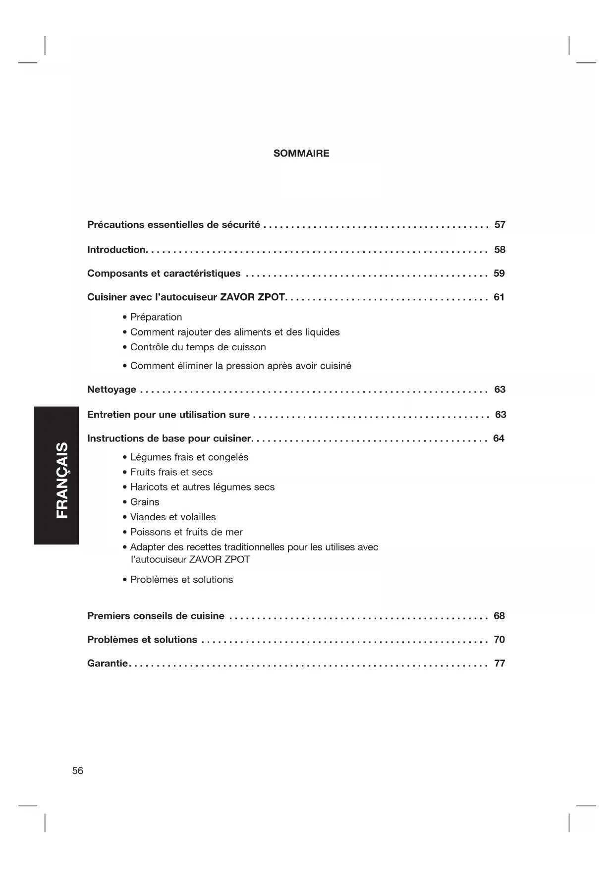 Mesures de sécurité à respecter pour une utilisation sûre de l’auto-cuiseur: FRANÇAIS58 Les autocuiseurs d’aujourd’hui sont, sans aucun doute, très différents de ceux qu’ont utilisé nos mères et nos grands- mères. Lorsqu’ils furent introduits sur le marché, à la fin des années 1930, les autocuiseurs étaient considérés comme l’un des meilleurs alliés des maîtresses de maison car il leur permettait de préparer des repas délicieux, bons pour la santé, économiques et de gagner du temps par rapport aux méthodes traditionnelles. Si les arguments concernant la santé et la cuisson rapide sont encore valables, la conception et l’ingénierie des autocui- seurs ont subi une évolution significative. Comme ils sont entourés d’innombrables mythes, les autocuiseurs sont certaine- ment les ustensiles de cuisine les moins bien compris. Ceci est réellement lamen- table car les autocuiseurs présentent de nombreux avantages par rapport aux méthodes de cuisson traditionnelles. Et l’un des arguments majeurs est que les aliments peuvent être préparés en un tiers du temps normalement requis. Comme les aliments sont cuits sur un laps de temps plus court, ils perdent moins de leur couleur et de leur saveur. Ils retiennent davantage les minéraux et les vitamines qui sont, normalement, lavés par la préparation dans de grandes quantités d’eau, des récipients ouverts et une cuisson longue. Les autocuiseurs ZAVOR, fabriqués en acier inoxydable 18/10 de haute qualité et gros calibre, sont conçus pour leur fonctionnalité et leur sécurité, car ils rem- plissent toutes les normes internationales de sécurité. Si vous savez ce que signifie cuisiner avec un autocuiseur, vous cons- taterez que la soupape tournante des anciens autocuiseurs a été éliminée. Vous ne devrez plus penser à vérifier si elle fonctionne correctement ou s’il y a trop de pression dans l’autocuiseur puisque quatre soupapes de sortie de pression et un régulateur de pression ont été incor- porées au couvercle. Ce régulateur de pression ZAVOR, simple à utiliser, fait qu’il est plus facile que jamais de déterminer la pression correcte et de la maintenir puisque ces soupapes indiquent quand il faut réduire ou augmenter la source de chaleur pour avoir le niveau de pression souhaité. Avec une utilisation et un entretien appro- priés, votre autocuiseur ZAVOR vous assurera de nombreuses années d’usage sans soucis et de délicieux repas rapides et faciles à préparer. Introduction FRANÇAIS59 Autocuiseur RAPID EXPRESS de ZAVOR Composants et caractéristiques