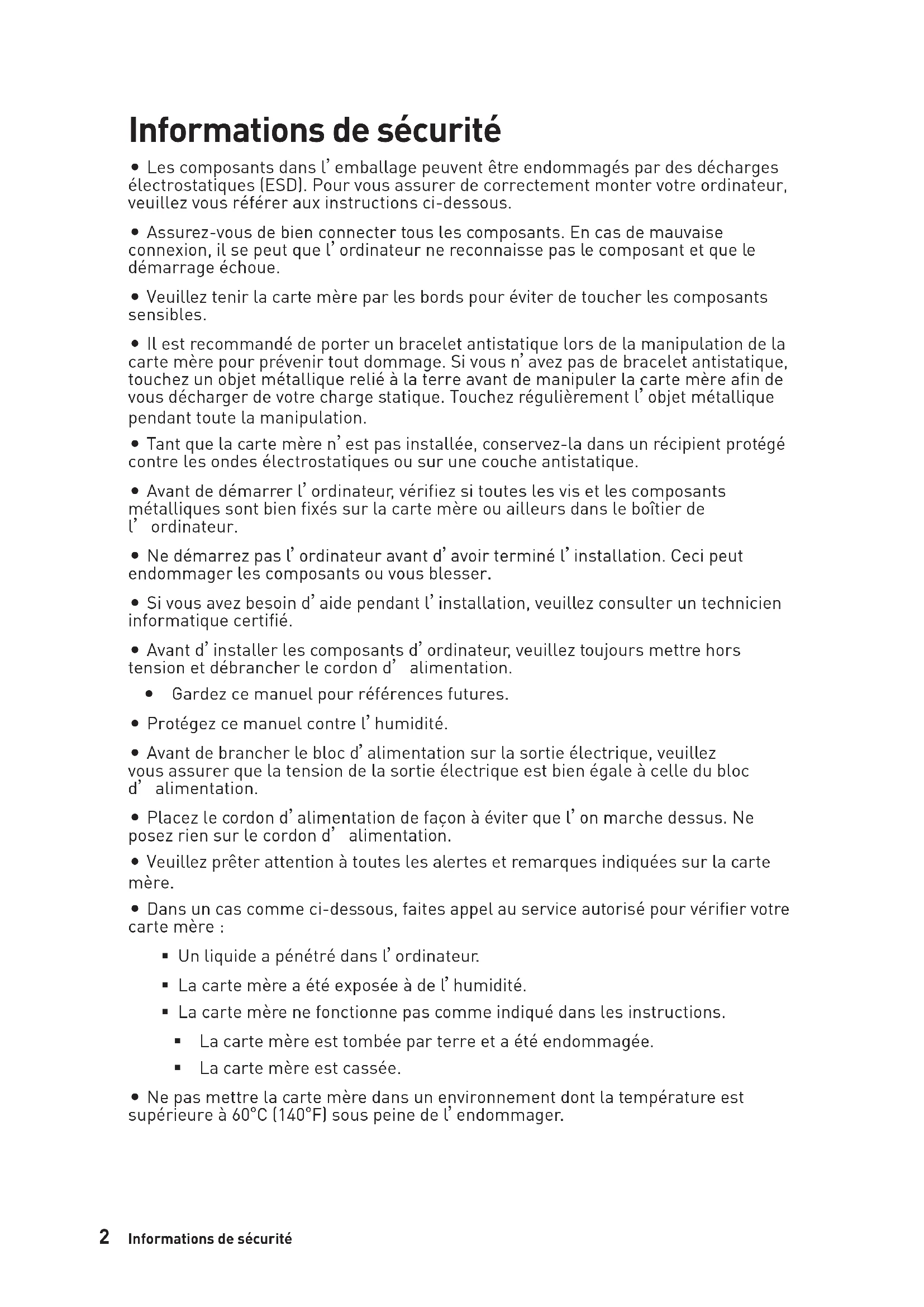 La surchauffe peut facilement endommager le processeur et la carte mère. Assurez-vous toujours que le système de refroidissement fonctionne correctement pour protéger le processeur de la surchauffe. Assurez-vous d’appliquer une couche de pâte thermique (ou adhésif thermique) entre le processeur et le système de refroidissement afin d’améliorer la dissipation de la chaleur.
