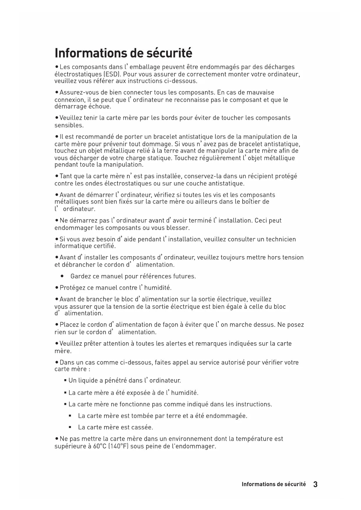 - OC Menu (menu overclocking) Informations de sécurité Informations de sécurité y Les composants dans l’emballage peuvent être endommagés par des décharges électrostatiques (ESD). Pour vous assurer de correctement monter votre ordinateur, veuillez vous référer aux instructions ci-dessous. y Assurez-vous de bien connecter tous les composants. En cas de mauvaise connexion, il se peut que l’ordinateur ne reconnaisse pas le composant et que le démarrage échoue. y Veuillez tenir la carte mère par les bords pour éviter de toucher les composants sensibles. y Il est recommandé de porter un bracelet antistatique lors de la manipulation de la carte mère pour prévenir tout dommage. Si vous n’avez pas de bracelet antistatique, touchez un objet métallique relié à la terre avant de manipuler la carte mère afin de vous décharger de votre charge statique. Touchez régulièrement l’objet métallique pendant toute la manipulation. y Tant que la carte mère n’est pas installée, conservez-la dans un récipient protégé contre les ondes électrostatiques ou sur une couche antistatique. y Avant de démarrer l’ordinateur, vérifiez si toutes les vis et les composants métalliques sont bien fixés sur la carte mère ou ailleurs dans le boîtier de l’ordinateur. y Ne démarrez pas l’ordinateur avant d’avoir terminé l’installation. Ceci peut endommager les composants ou vous blesser. y Si vous avez besoin d’aide pendant l’installation, veuillez consulter un technicien informatique certifié. y Avant d’installer les composants d’ordinateur, veuillez toujours mettre hors tension et débrancher le cordon d’alimentation. y Gardez ce manuel pour références futures. y Protégez ce manuel contre l’humidité. y Avant de brancher le bloc d’alimentation sur la sortie électrique, veuillez vous assurer que la tension de la sortie électrique est bien égale à celle du bloc d’alimentation. y Placez le cordon d’alimentation de façon à éviter que l’on marche dessus. Ne posez rien sur le cordon d’alimentation. y Veuillez prêter attention à toutes les alertes et remarques indiquées sur la carte mère. y Dans un cas comme ci-dessous, faites appel au service autorisé pour vérifier votre carte mère : Un liquide a pénétré dans l’ordinateur. La carte mère a été exposée à de l’humidité. La carte mère ne fonctionne pas comme indiqué dans les instructions. La carte mère est tombée par terre et a été endommagée. La carte mère est cassée. y Ne pas mettre la carte mère dans un environnement dont la température est supérieure à 60°C (140°F) sous peine de l'endommager.4 Spécifications Spécifications CPU Socket AM4 pour processeurs AMD Ryzen™ de 2ème et 3ème génération/ Ryzen™ avec cœurs graphiques Radeon™ Vega/ AMD Ryzen™ avec cœurs graphiques Radeon™ de 2ème génération Chipset Chipset AMD p. 483