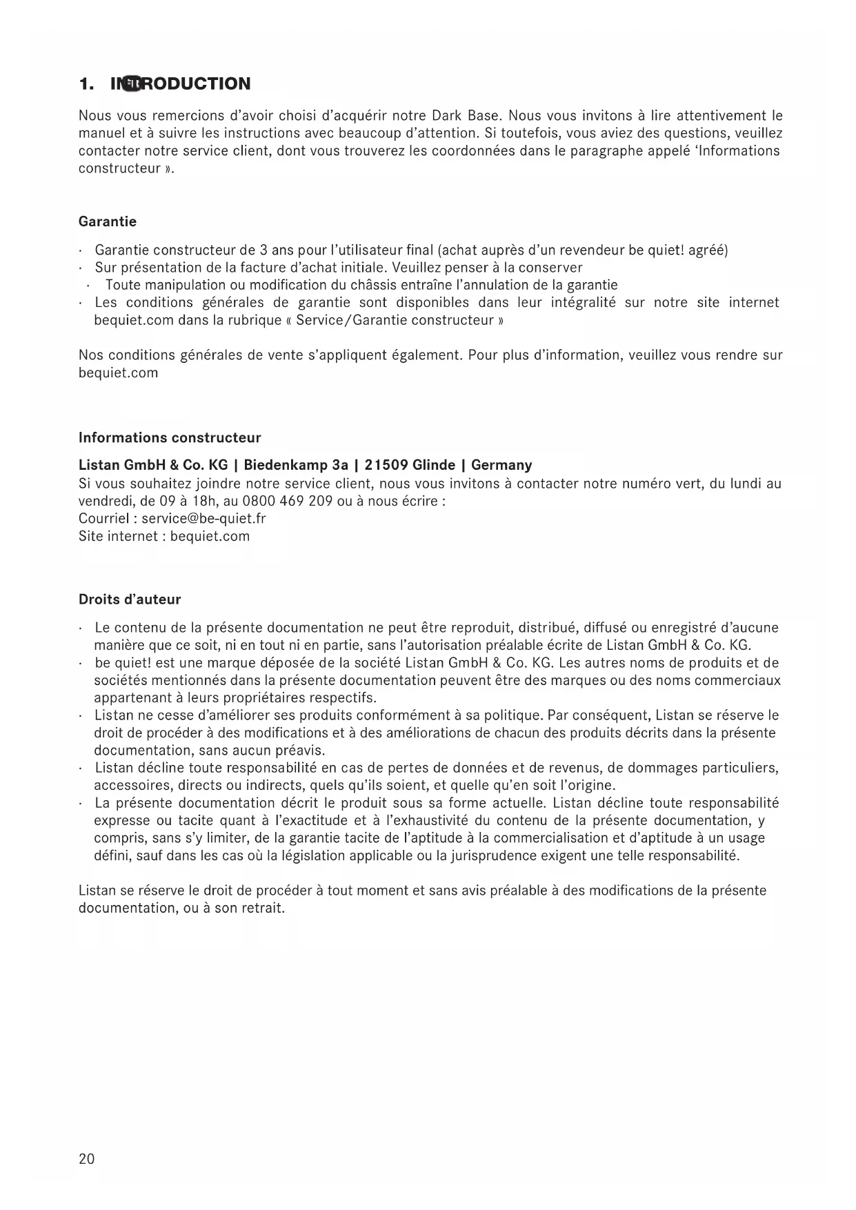 Nous vous remercions d’avoir choisi d’acquérir notre Dark Base. Nous vous invitons à lire attentivement le manuel et à suivre les instructions avec beaucoup d’attention. Si toutefois, vous aviez des questions, veuillez contacter notre service client, dont vous trouverez les coordonnées dans le paragraphe appelé ‘Informations constructeur ». Garantie ∙ Garantieconstructeurde3anspourl’utilisateurnal(achatauprèsd’unrevendeurbequiet!agréé) ∙ Sur présentation de la facture d’achat initiale. Veuillez penser à la conserver ∙ Toutemanipulationoumodicationduchâssisentraînel’annulationdelagarantie ∙ Les conditions générales de garantie sont disponibles dans leur intégralité sur notre site internet bequiet.com dans la rubrique « Service/Garantie constructeur » Nos conditions générales de vente s’appliquent également. Pour plus d’information, veuillez vous rendre sur bequiet.com Informations constructeur Listan GmbH & Co. KG | Biedenkamp 3a | 21509 Glinde | Germany Si vous souhaitez joindre notre service client, nous vous invitons à contacter notre numéro vert, du lundi au vendredi, de 09 à 18h, au 0800 469 209 ou à nous écrire : Courriel : service@be-quiet.fr Site internet : bequiet.com Droits d’auteur ∙ Lecontenudelaprésentedocumentationnepeutêtrereproduit,distribué,diuséouenregistréd’aucune manièrequecesoit,nientoutnienpartie,sansl’autorisationpréalableécritedeListanGmbH&Co.KG. ∙ be quiet! est une marque déposée de la société Listan GmbH & Co. KG. Les autres noms de produits et de sociétés mentionnés dans la présente documentation peuvent être des marques ou des noms commerciaux appartenant à leurs propriétaires respectifs. ∙ Listan ne cesse d’améliorer ses produits conformément à sa politique. Par conséquent, Listan se réserve le droitdeprocéderàdesmodicationsetàdesaméliorationsdechacundesproduitsdécritsdanslaprésente documentation, sans aucun préavis. ∙ Listan décline toute responsabilité en cas de pertes de données et de revenus, de dommages particuliers, accessoires, directs ou indirects, quels qu’ils soient, et quelle qu’en soit l’origine. ∙ La présente documentation décrit le produit sous sa forme actuelle. Listan décline toute responsabilité expresse ou tacite quant à l’exactitude et à l’exhaustivité du contenu de la présente documentation, y compris, sans s’y limiter, de la garantie tacite de l’aptitude à la commercialisation et d’aptitude à un usage déni,saufdanslescasoùlalégislationapplicableoulajurisprudenceexigentunetelleresponsabilité. Listanseréserveledroitdeprocéderàtoutmomentetsansavispréalableàdesmodicationsdelaprésente documentation, ou à son retrait.20 21