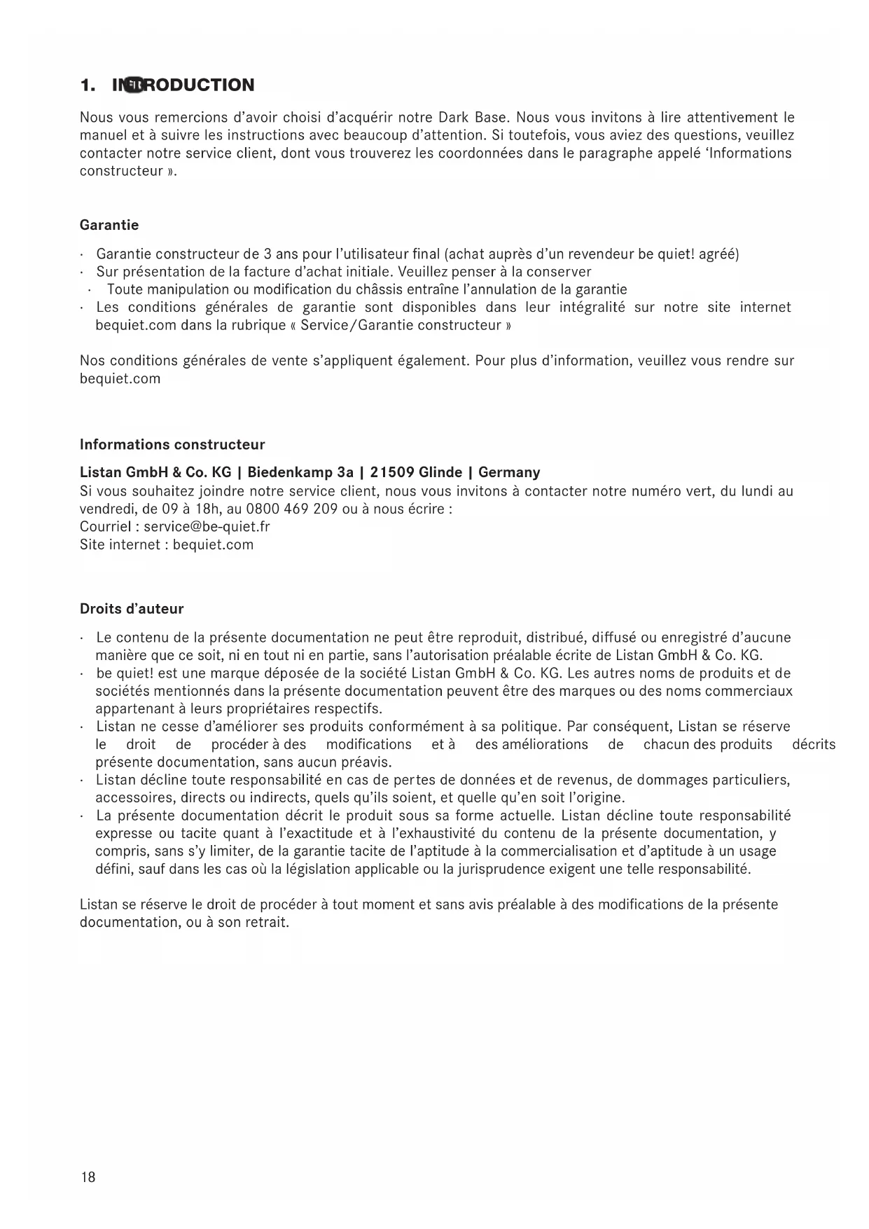 Nous vous remercions d’avoir choisi d’acquérir notre Dark Base. Nous vous invitons à lire attentivement le manuel et à suivre les instructions avec beaucoup d’attention. Si toutefois, vous aviez des questions, veuillez contacter notre service client, dont vous trouverez les coordonnées dans le paragraphe appelé ‘Informations constructeur ». Garantie ∙ Garantieconstructeurde3anspourl’utilisateurnal(achatauprèsd’unrevendeurbequiet!agréé) ∙ Sur présentation de la facture d’achat initiale. Veuillez penser à la conserver ∙ Toutemanipulationoumodicationduchâssisentraînel’annulationdelagarantie ∙ Les conditions générales de garantie sont disponibles dans leur intégralité sur notre site internet bequiet.com dans la rubrique « Service/Garantie constructeur » Nos conditions générales de vente s’appliquent également. Pour plus d’information, veuillez vous rendre sur bequiet.com Informations constructeur Listan GmbH & Co. KG | Biedenkamp 3a | 21509 Glinde | Germany Si vous souhaitez joindre notre service client, nous vous invitons à contacter notre numéro vert, du lundi au vendredi, de 09 à 18h, au 0800 469 209 ou à nous écrire : Courriel : service@be-quiet.fr Site internet : bequiet.com Droits d’auteur ∙ Lecontenudelaprésentedocumentationnepeutêtrereproduit,distribué,diuséouenregistréd’aucune manièrequecesoit,nientoutnienpartie,sansl’autorisationpréalableécritedeListanGmbH&Co.KG. ∙ be quiet! est une marque déposée de la société Listan GmbH & Co. KG. Les autres noms de produits et de sociétés mentionnés dans la présente documentation peuvent être des marques ou des noms commerciaux appartenant à leurs propriétaires respectifs. ∙ Listan ne cesse d’améliorer ses produits conformément à sa politique. Par conséquent, Listan se réserve le droit de procéderàdes modications età desaméliorations de chacundesproduits décrits dansla présente documentation, sans aucun préavis. ∙ Listan décline toute responsabilité en cas de pertes de données et de revenus, de dommages particuliers, accessoires, directs ou indirects, quels qu’ils soient, et quelle qu’en soit l’origine. ∙ La présente documentation décrit le produit sous sa forme actuelle. Listan décline toute responsabilité expresse ou tacite quant à l’exactitude et à l’exhaustivité du contenu de la présente documentation, y compris, sans s’y limiter, de la garantie tacite de l’aptitude à la commercialisation et d’aptitude à un usage déni,saufdanslescasoùlalégislationapplicableoulajurisprudenceexigentunetelleresponsabilité. Listanseréserveledroitdeprocéderàtoutmomentetsansavispréalableàdesmodicationsdelaprésente documentation, ou à son retrait.18 19
