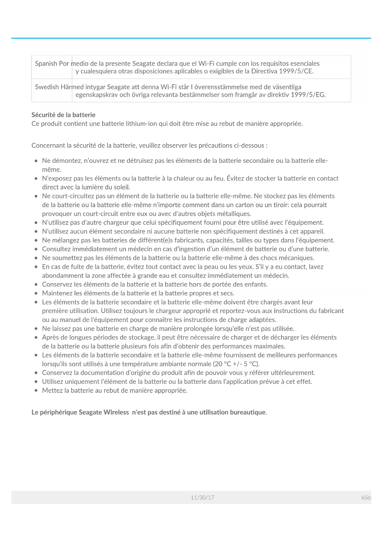 17Conformité aux réglementaons Informations sur le règlement FCC, classe B Cet équipement a été testé et déclaré conforme aux limites imposées aux périphériques numériques de classe B stipulées au chapitre 15 du règlement FCC. Ces limites sont conçues pour fournir une protection raisonnable contre les interférences nuisibles lorsque l’équipement est utilisé dans un environnement résidentiel. Cet équipement génère, utilise et peut émettre des fréquences radio et, s’il n’est pas installé et utilisé conformément aux instructions, peut créer des interférences nuisibles perturbant les communications radio. Toutefois, rien ne permet de garantir l’absence totale d’interférence dans une installation donnée. Si l’équipement perturbe la réception de radios ou de télévisions, ce qui peut être vérifié en éteignant et en rallumant l’équipement, l’utilisateur est invité à tenter de faire disparaître ces interférences en recourant à l’une des mesures suivantes: réorienter ou déplacer l’antenne de réception ; augmenter l’écart entre l’équipement et le récepteur ; brancher l’équipement sur une prise située sur un circuit autre que celui auquel est raccordé le récepteur ; consulter le revendeur ou un technicien expérimenté pour obtenir de l’aide. Cet équipement est conforme au chapitre15 du règlement FCC. Son utilisation est soumise aux deux conditions suivantes : (1) cet équipement ne doit pas causer d'interférences nuisibles, et (2) cet équipement doit accepter toutes les interférences reçues, y compris celles susceptibles d’entraîner un fonctionnement non désiré. Avertissement concernant le règlement FCC : toute modification n’ayant pas été approuvée expressément par la partie responsable de la conformité peut invalider le droit d’employer cet équipement accordé à l’utilisateur. REMARQUE IMPORTANTE : déclaration d'exposition aux radiations de la FCC Cet équipement est conforme aux limites d’exposition aux rayonnements de la FCC établies pour un environnement non contrôlé. Il doit être installé et utilisé avec un minimum de 20cm de distance entre la source de rayonnement et votre corps. Le transmetteur ne doit pas être placé à côté ou ne doit pas fonctionner avec une autre antenne ou un autre transmetteur. La disponibilité de certains canaux spécifiques et/ou bandes de fréquence opérationnelles dépend des pays et est programmée à l’aide d’un firmware en usine afin de s’adapter à la destination prévue. La configuration du firmware n’est pas accessible à l’utilisateur final. 3Seagate Wireless 11/30/17Remarque pour les propriétaires de modèles aux États-Unis: pour respecter le règlement FCC, la fonction de sélection du pays a été complètement supprimée de tous les modèles pour les États-Unis. La fonction ci-dessus est destinée aux modèles hors États-Unis uniquement. Industrie Canada Ce dispositif est conforme à la norme RSS-210 d’Industrie Canada. Son utilisation est soumise aux deux conditions suivantes : (1) cet équipement ne doit pas causer d'interférences nuisibles, et (2) cet équipement doit accepter toutes les interférences reçues, y compris celles susceptibles d’entraîner un fonctionnement non désiré. Ce dispositif est conforme à la norme CNR-210 d'Industrie Canada applicable aux appareils radio exempts de licence. Son fonctionnement est sujet aux deux conditions suivantes: (1) le dispositif ne doit pas produire de brouillage préjudiciable, et (2) ce dispositif doit accepter tout brouillage reçu, y compris un brouillage susceptible de provoquer un fonctionnement indésirable. REMARQUE IMPORTANTE : (pour l’utilisation de dispositifs mobiles) Déclaration d’exposition aux radiations : Cet équipement est conforme aux limites d’exposition aux rayonnements IC établies pour un environnement non contrôlé. Il doit être installé et utilisé avec un minimum de 20 cm de distance entre la source de rayonnement et votre corps. NOTE IMPORTANTE: (Pour l'utilisation de dispositifs mobiles) Déclaration d'exposition aux radiations : Cet équipement est conforme aux limites d'exposition aux rayonnements IC établies pour un environnement non contrôlé. Cet équipement doit être installé et utilisé avec un minimum de 20 cm de distance entre la source de rayonnement et votre corps. Déclaration de conformité CE du fabricant Czech Seagate tímto prohlašuje, že tento Wi-Fi je ve shodě se základními požadavky a dalšími příslušnými ustanoveními směrnice 1999/5/ES. Danish Undertegnede Seagate erklærer herved, at følgende udstyr Wi-Fi overholder de væsentlige krav og øvrige relevante krav i direktiv 1999/5/EF. Dutch Hierbij verklaart Seagate dat het toestel Wi-F in overeenstemming is met de essentiële eisen en de andere relevante bepalingen van richtlijn 1999/5/EG. 4Seagate Wireless 11/30/17English Hereby, Seagate declares that this Wi-Fi is in compliance with the essential requirements and other relevant provisions of Directive 1999/5/EC. Estonian Käesolevaga kinnitab Seagate seadme Wi-Fi vastavust direktiivi 1999/5/EÜ põhinõuetele ja nimetatud direktiivist tulenevatele teistele asjakohastele sätetele. German Hiermit erklärt Seagate, dass sich das Gerät Wi-Fi in Übereinstimmung mit den grundlegenden Anforderungen und den übrigen einschlägigen Bestimmungen der Richtlinie 1999/5/EG befindet. Greek ΜΕ ΤΗΝ ΠΑΡΟΥΣΑ Seagate ∆ΗΛΩΝΕΙ ΟΤΙ Wi-Fi ΣΥΜΜΟΡΦΩΝΕΤΑΙ ΠΡΟΣ ΤΙΣ ΟΥΣΙΩ∆ΕΙΣ ΑΠΑΙΤΗΣΕΙΣ ΚΑΙ ΤΙΣ ΛΟΙΠΕΣ ΣΧΕΤΙΚΕΣ ∆ΙΑΤΑΞΕΙΣ ΤΗΣ Ο∆ΗΓΙΑΣ 1999/5/ΕΚ. Hungarian Alulírott, Seagate nyilatkozom, hogy a Wi-Fi megfelel a vonatkozó alapvetõ követelményeknek és az 1999/5/EC irányelv egyéb elõírásainak. Finnish Seagate vakuuttaa täten että Wi-Fi laitteen tyyppimerkintä]tyyppinen laite on direktiivin 1999/5/EY o