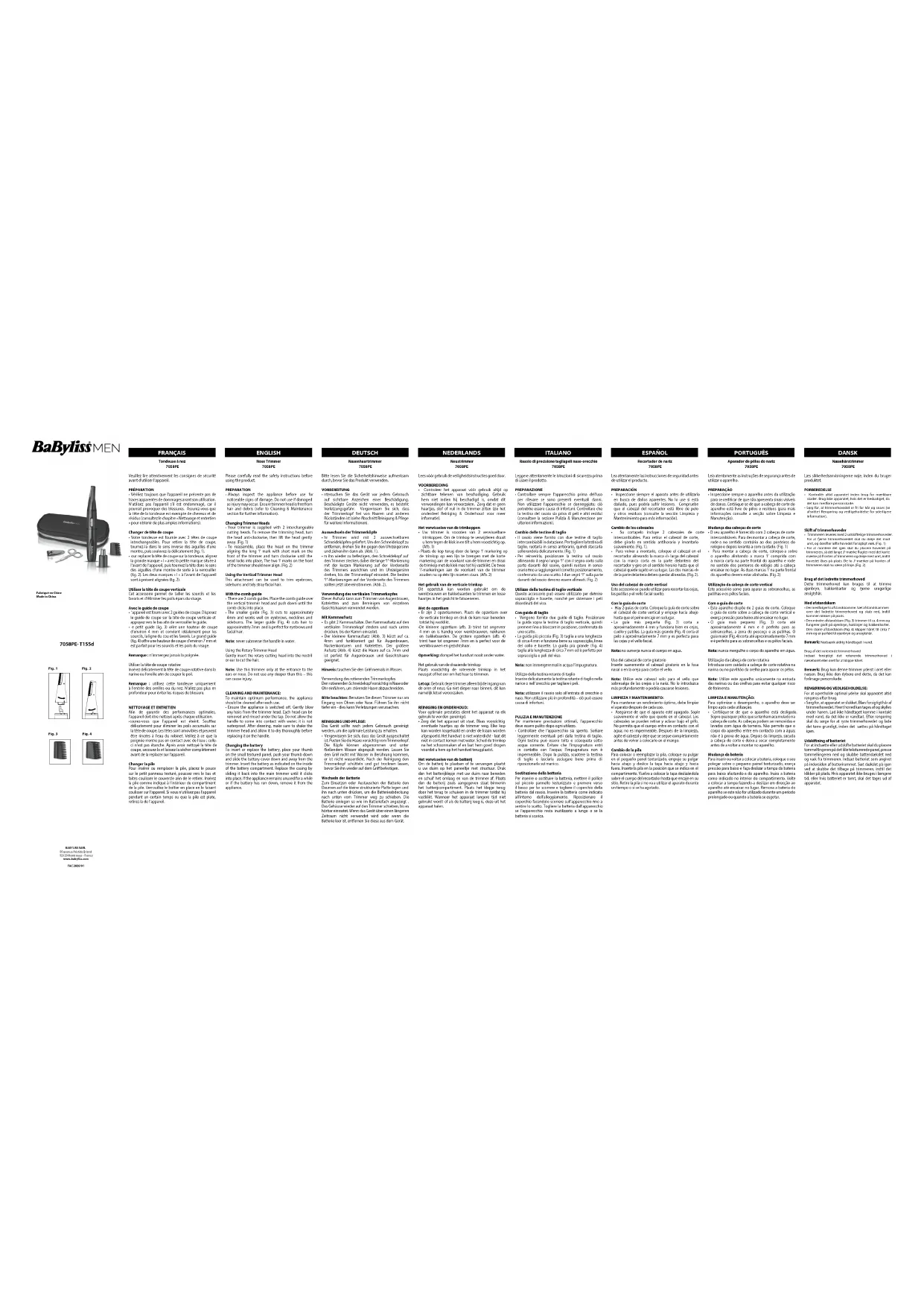 - ssurez-vous que l’appareil est éteint. Souez délicatement pour éliminer les poils accumulés sur la tête de coupe. Les têtes sont amovibles et peuvent être rincées à l’eau du robinet. Veillez à ce que la poignée n’entre pas en contact avec de l’eau ; celle- ci n’est pas étanche. Après avoir nettoyé la tête de coupe, secouez-la et laissez-la sécher complètement avant de la replacer sur l’appareil. Changer la pile Pour insérer ou remplacer la pile, placez le pouce sur le petit panneau texturé, poussez vers le bas et faites coulisser le couvercle an de le retirer. Insérez la pile comme indiqué à l’intérieur du compartiment de la pile. Verrouillez le boîtier en place en le faisant coulisser sur l’appareil. Si vous n’utilisez pas l’appareil pendant un certain temps ou que la pile est plate, retirez-la de l’appareil. Rasoio di precisione tagliapeli naso-orecchie 7058PE Leggere attentamente le istruzioni di sicurezza prima di usare il prodotto. PREPARAZIONE
