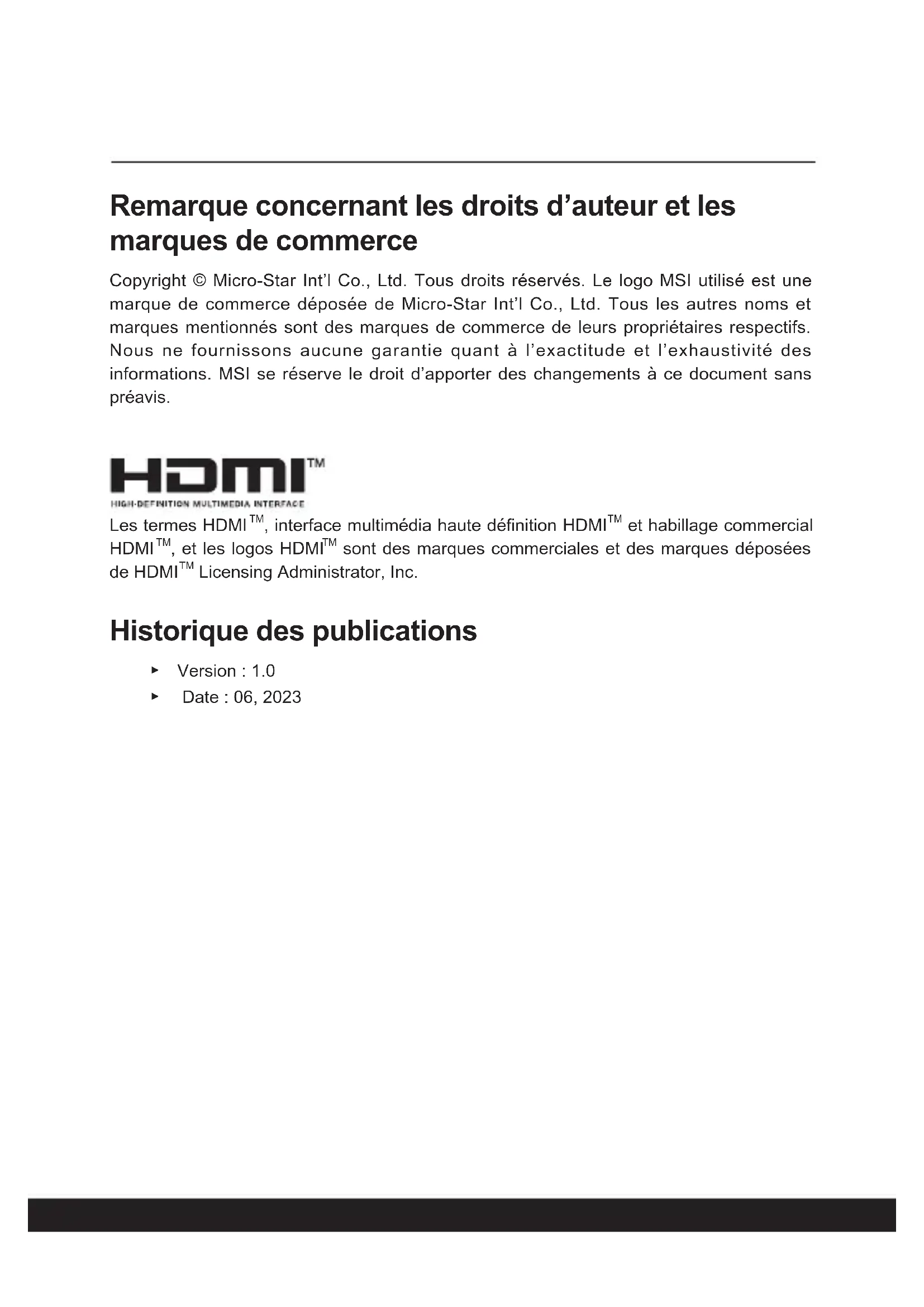 Licensing Administrator, Inc. Historique des publications ▶ Version : 1.0 ▶ Date : 06, 20231-6 1-7 Déclaration FCC-B sur les interférences de radiofréquence Cet appareil a subi des tests de contrôle et a été déclaré conforme aux restrictions imposées aux appareils numériques de classe B, par la section 15 de la réglementation FCC. Ces restrictions sont destinées à assurer une protection raisonnable contre les interférences indésirables lorsque l’appareil est utilisé dans un environnement résidentiel. Ce matériel génère, exploite et peut émettre des fréquences radioélectriques. En outre, en cas d’installation ou d’utilisation non conforme aux instructions, il risque de provoquer des interférences indésirables avec les communications radioélectriques. Cependant, rien ne garantit qu’aucune interférence ne se produise dans certaines installations particulières. Si cet équipement provoque des interférences indésirables avec les réceptions radio et TV (ce que vous pouvez déterminer en allumant et en éteignant l’appareil), nous vous engageons vivement à y remédier en prenant l’une des mesures suivantes : ▶ Réorientez ou déplacez l’antenne de réception. ▶ Augmentez la distance séparant l’appareil du récepteur. ▶ Raccordez l’appareil à une prise de courant située sur un circuit différent de celui du récepteur. REMARQUES ▶ Les changements ou modifications qui ne sont pas expressément approuvés par la partie responsable de la conformité aux normes peuvent annuler le droit de l’utilisateur à utiliser l’appareil. ▶ Les câbles blindés et les cordons d’alimentation CA, s’il y en a, doivent être utilisés de manière à être conformes aux limitations sur les émissions. Conditions FCC Cet appareil est conforme aux dispositions de la section 15 de la réglementation FCC. Son utilisation est soumise aux deux conditions suivantes : ▶ Cet appareil ne doit pas générer d'interférences nuisibles. ▶ Cet appareil doit accepter toute interférence reçue, même celles qui sont susceptibles d'entraîner un fonctionnement indésirable.1-6 1-7 Conformité CE Ce périphérique est conforme aux exigences essentielles de sécurité et aux autres dispositions relatives mises en place par les Directives Européennes. Réglementations de batterie Union européenne : Les piles, les batteries et les accumulateurs ne doivent pas être jetés comme des déchets domestiques non triés. Veuillez faire appel au système de collecte public pour faire recycler ou détruire votre batterie en conformité avec les réglementations locales.
