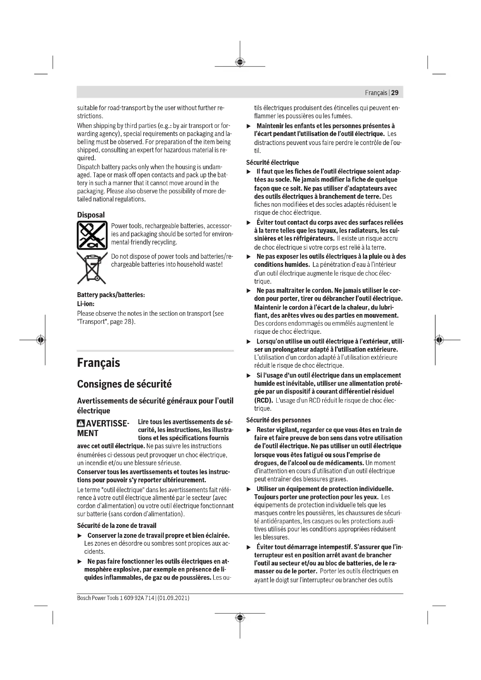 After-Sales Service and Application Service Our after-sales service responds to your questions concern- ing maintenance and repair of your product as well as spare parts. You can find explosion drawings and information on spare parts at: www.bosch-pt.com The Bosch product use advice team will be happy to help you with any questions about our products and their accessor- ies. In all correspondence and spare parts orders, please always include the 10‑digit article number given on the nameplate of the product. Malaysia Robert Bosch Sdn. Bhd.(220975-V) PT/SMY No. 8A, Jalan 13/6 46200 Petaling Jaya Selangor Tel.: (03) 79663194 Toll-Free: 1800 880188 Fax: (03) 79583838 E-Mail: kiathoe.chong@my.bosch.com www.bosch-pt.com.my You can find further service addresses at: www.bosch-pt.com/serviceaddresses Transport The contained lithium-ion batteries are subject to the Dan- gerous Goods Legislation requirements. The batteries are 1 609 92A 714 | (01.09.2021) Bosch Power ToolsFrançais | 29 suitable for road-transport by the user without further re- strictions. When shipping by third parties (e.g.: by air transport or for- warding agency), special requirements on packaging and la- belling must be observed. For preparation of the item being shipped, consulting an expert for hazardous material is re- quired. Dispatch battery packs only when the housing is undam- aged. Tape or mask off open contacts and pack up the bat- tery in such a manner that it cannot move around in the packaging. Please also observe the possibility of more de- tailed national regulations. Disposal Power tools, rechargeable batteries, accessor- ies and packaging should be sorted for environ- mental-friendly recycling. Do not dispose of power tools and batteries/re- chargeable batteries into household waste! Battery packs/batteries: Li-ion: Please observe the notes in the section on transport (see "Transport", page28). Français Consignes de sécurité Avertissements de sécurité généraux pour l’outil électrique AVERTISSE- MENT Lire tous les avertissements de sé- curité, les instructions, les illustra- tions et les spécifications fournis avec cet outil électrique. Ne pas suivre les instructions énumérées ci-dessous peut provoquer un choc électrique, un incendie et/ou une blessure sérieuse. Conserver tous les avertissements et toutes les instruc- tions pour pouvoir s'y reporter ultérieurement. Le terme "outil électrique" dans les avertissements fait réfé- rence à votre outil électrique alimenté par le secteur (avec cordon d’alimentation) ou votre outil électrique fonctionnant sur batterie (sans cordon d’alimentation). Sécurité de la zone de travail u Conserver la zone de travail propre et bien éclairée. Les zones en désordre ou sombres sont propices aux ac- cidents. u Ne pas faire fonctionner les outils électriques en at- mosphère explosive, par exemple en présence de li- quides inflammables, de gaz ou de poussières. Les ou- tils électriques produisent des étincelles qui peuvent en- flammer les poussières ou les fumées. u Maintenir les enfants et les personnes présentes à l’écart pendant l’utilisation de l’outil électrique. Les distractions peuvent vous faire perdre le contrôle de l’ou- til. Sécurité électrique u Il faut que les fiches de l’outil électrique soient adap- tées au socle. Ne jamais modifier la fiche de quelque façon que ce soit. Ne pas utiliser d’adaptateurs avec des outils électriques à branchement de terre. Des fiches non modifiées et des socles adaptés réduisent le risque de choc électrique. u Éviter tout contact du corps avec des surfaces reliées à la terre telles que les tuyaux, les radiateurs, les cui- sinières et les réfrigérateurs. Il existe un risque accru de choc électrique si votre corps est relié à la terre. u Ne pas exposer les outils électriques à la pluie ou à des conditions humides. La pénétration d‘eau à l’intérieur d’un outil électrique augmente le risque de choc élec- trique. u Ne pas maltraiter le cordon. Ne jamais utiliser le cor- don pour porter, tirer ou débrancher l’outil électrique. Maintenir le cordon à l’écart de la chaleur, du lubri- fiant, des arêtes vives ou des parties en mouvement. Des cordons endommagés ou emmêlés augmentent le risque de choc électrique. u Lorsqu’on utilise un outil électrique à l’extérieur, utili- ser un prolongateur adapté à l’utilisation extérieure. L’utilisation d’un cordon adapté à l’utilisation extérieure réduit le risque de choc électrique. u Si l'usage d'un outil électrique dans un emplacement humide est inévitable, utiliser une alimentation proté- gée par un dispositif à courant différentiel résiduel (RCD). L'usage d'un RCD réduit le risque de choc élec- trique. Sécurité des personnes u Rester vigilant, regarder ce que vous êtes en train de faire et faire preuve de bon sens dans votre utilisation de l’outil électrique. Ne pas utiliser un outil électrique lorsque vous êtes fatigué ou sous l’emprise de drogues, de l’alcool ou de médicaments. Un moment d’inattention en cours d’utilisation d’un outil électrique peut entraîner des blessures graves. u Utiliser un équipement de protection individuelle. Toujours porter une protection pour les yeux. Les équipements de protection individuelle tels que les masques contre les poussières, les chaussures de sécuri- té antidérapantes, les casques ou les protections audi- tives utilisés pour les conditions appropriées réduisent les blessures. u Éviter tout démarrage intempestif. S’assurer que l’in- terrupteur est en position arrêt avant de brancher l’outil au secteur et/ou au bloc de batteries, de le ra- masser ou de le porter. Porter les outils électriques en ayant le doigt sur l’interrupteur ou brancher des outils Bosch Power Tools 1 609 92A 714 | (01.09.2021)30 | Français électriques dont l’interrupteur est en position marche est source d’ac