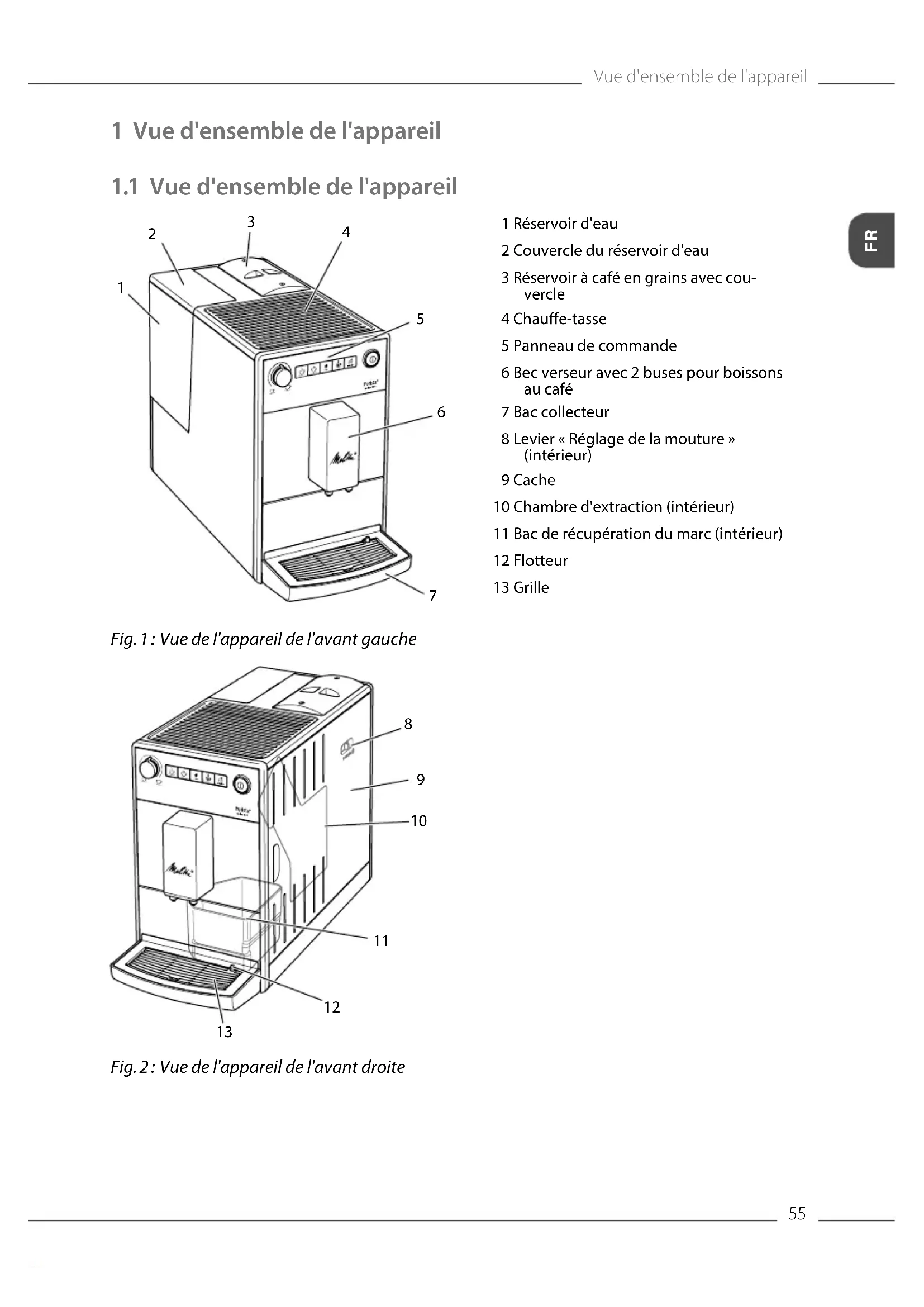 Fig. 2 : Vue de l'appareil de l'avant droite 1 Réservoir d'eau 2 Couvercle du réservoir d'eau 3 Réservoir à café en grains avec cou- vercle 4 Chaue-tasse 5 Panneau de commande 6 Bec verseur avec 2 buses pour boissons au café 7 Bac collecteur 8 Levier «Réglage de la mouture» (intérieur) 9 Cache 10 Chambre d'extraction (intérieur) 11 Bac de récupération du marc (intérieur) 12 Flotteur 13 GrilleVue d'ensemble de l'appareil