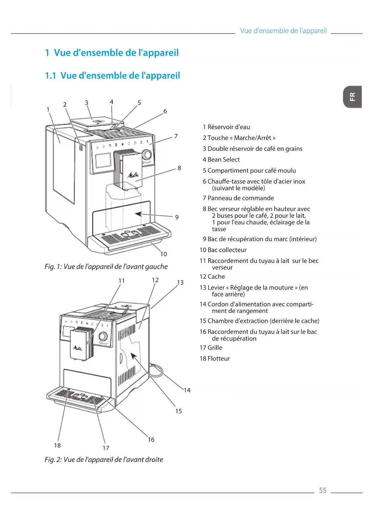 Fig. 2: Vue de l'appareil de l'avant droite 1 Réservoir d'eau 2 Touche «Marche/Arrêt» 3 Double réservoir de café en grains 4 Bean Select 5 Compartiment pour café moulu 6 Chaue-tasse avec tôle d'acier inox (suivant le modèle) 7 Panneau de commande 8 Bec verseur réglable en hauteur avec 2buses pour le café, 2pour le lait, 1pour l'eau chaude, éclairage de la tasse 9 Bac de récupération du marc (intérieur) 10 Bac collecteur 11 Raccordement du tuyau à lait sur le bec verseur 12 Cache 13 Levier «Réglage de la mouture» (en face arrière) 14 Cordon d'alimentation avec comparti- ment de rangement 15 Chambre d'extraction (derrière le cache) 16 Raccordement du tuyau à lait sur le bac de récupération 17 Grille 18 FlotteurVue d'ensemble de l'appareil