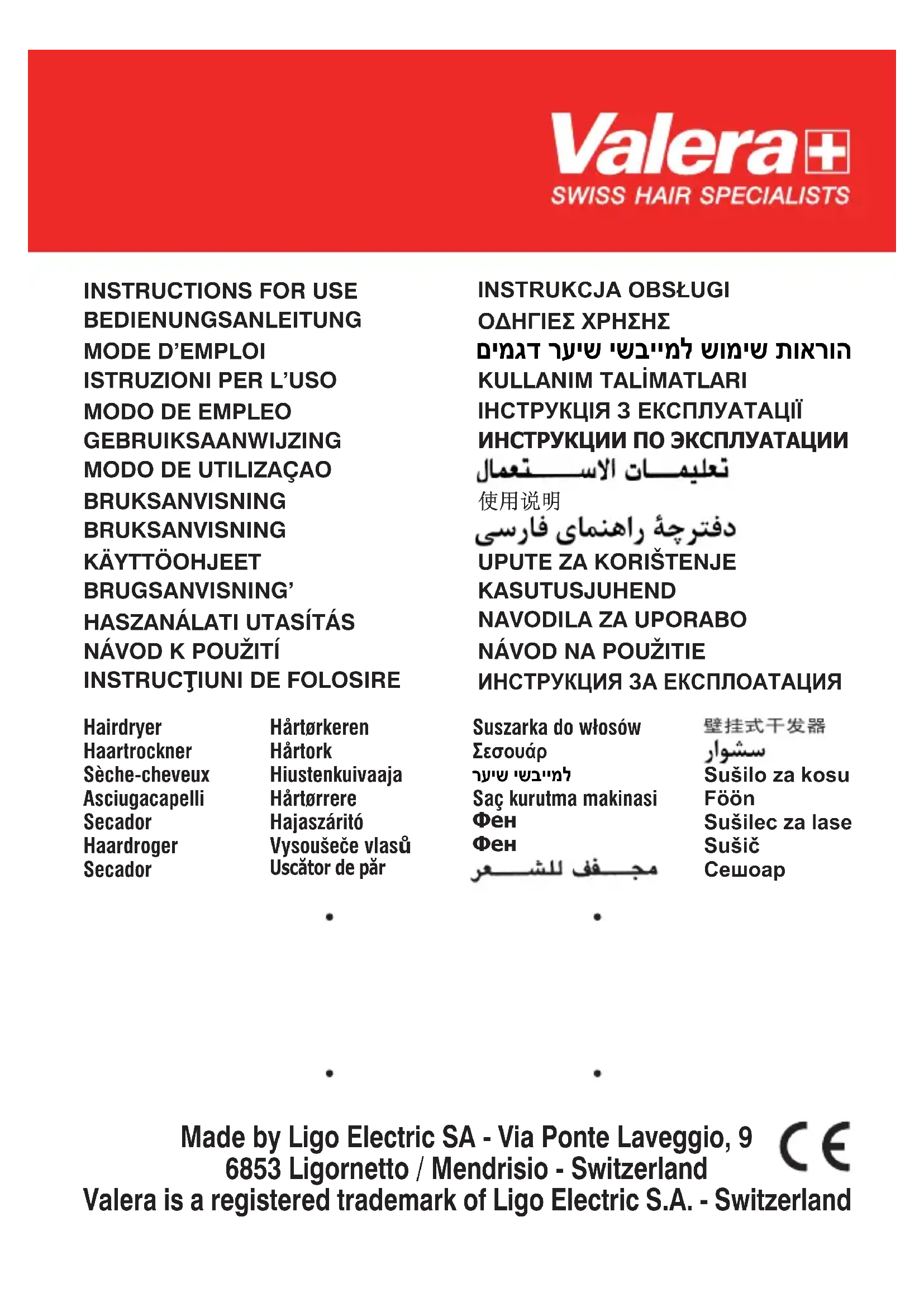 Débranchez toujours votre appareil avant de le nettoyer! Vous pouvez nettoyer l’appareil à l’aide d’un chiffon imbibé d’eau. Mais ne l’immergez ni dans l’eau ni dans tout autre liquide! Protégez votre appareil de la poussière. Si nécessaire, nettoyez la grille d’aération de celui-ci à l’aide d’une brosse ou d’un pinceau. ATTENTION: Il est formellement interdit de nettoyer les sèche- cheveux avec des liquides, des détergents, des solvants, de l'alcool et des produits chimiques. Sous réserve de modifications 00060713_19-03_Layout 1 29/01/2019 11:19 Pagina 1213 ISTRUZIONI PER L’USO - Istruzioni originali Leggere attentamente queste istruzioni per l’uso. Disponibili anche su www.valera.com