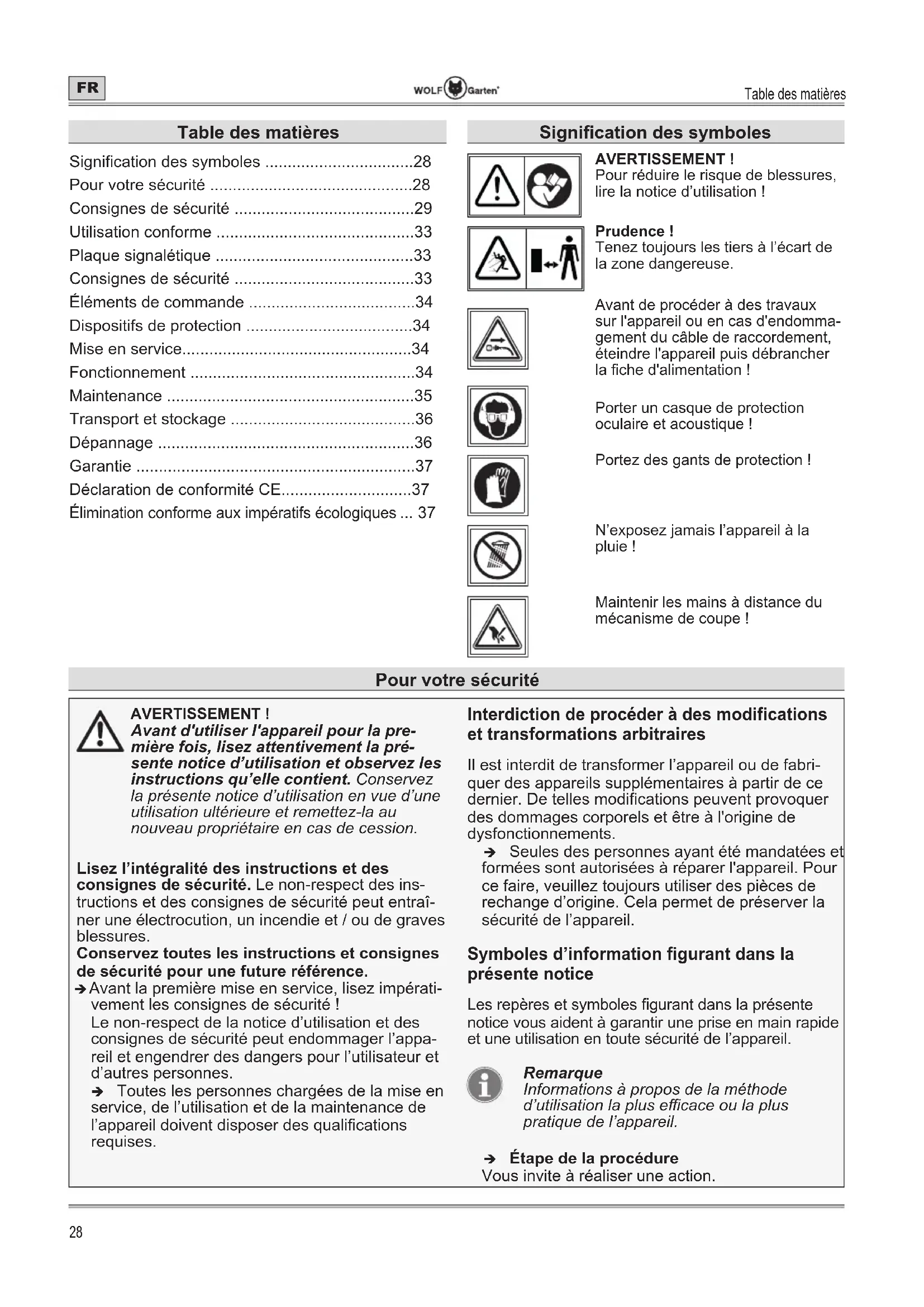 Signication des symboles AVERTISSEMENT ! Pour réduire le risque de blessures, lire la notice d’utilisation ! Prudence ! Tenez toujours les tiers à l’écart de la zone dangereuse. Avant de procéder à des travaux sur l'appareil ou en cas d'endomma- gement du câble de raccordement, éteindre l'appareil puis débrancher la che d'alimentation ! Porter un casque de protection oculaire et acoustique ! Portez des gants de protection ! N’exposez jamais l’appareil à la pluie ! Maintenir les mains à distance du mécanisme de coupe ! Pour votre sécurité AVERTISSEMENT ! Avant d'utiliser l'appareil pour la pre- mière fois, lisez attentivement la pré- sente notice d’utilisation et observez les instructions qu’elle contient. Conservez la présente notice d’utilisation en vue d’une utilisation ultérieure et remettez-la au nouveau propriétaire en cas de cession. Lisez l’intégralité des instructions et des consignes de sécurité. Le non-respect des ins- tructions et des consignes de sécurité peut entraî- ner une électrocution, un incendie et / ou de graves blessures. Conservez toutes les instructions et consignes de sécurité pour une future référence. Î Avant la première mise en service, lisez impérati- vement les consignes de sécurité ! Le non-respect de la notice d’utilisation et des consignes de sécurité peut endommager l’appa- reil et engendrer des dangers pour l’utilisateur et d’autres personnes. Î Toutes les personnes chargées de la mise en service, de l’utilisation et de la maintenance de l’appareil doivent disposer des qualications requises. Interdiction de procéder à des modifications et transformations arbitraires Il est interdit de transformer l’appareil ou de fabri- quer des appareils supplémentaires à partir de ce dernier. De telles modications peuvent provoquer des dommages corporels et être à l'origine de dysfonctionnements. Î Seules des personnes ayant été mandatées et formées sont autorisées à réparer l'appareil. Pour ce faire, veuillez toujours utiliser des pièces de rechange d’origine. Cela permet de préserver la sécurité de l’appareil. Symboles d’information figurant dans la présente notice Les repères et symboles gurant dans la présente notice vous aident à garantir une prise en main rapide et une utilisation en toute sécurité de l’appareil. Remarque Informations à propos de la méthode d’utilisation la plus ecace ou la plus pratique de l’appareil. Î Étape de la procédure Vous invite à réaliser une action.Pour votre sécurité