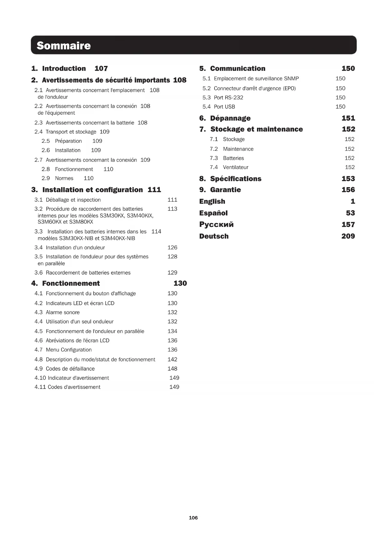 Si l'onduleur ne fonctionne pas correctement, identifiez le problème en utilisant le tableau ci-dessous. Symptôme Cause possible Solution Aucune indication ni alarme sur l'affichage avant, même si l'alimentation secteur est normale. La puissance d'entrée CA n'est pas connectée correctement ou de façon sûre. Vérifiez pour vous assurer que le câble d'entrée est fermement connecté au secteur. L'icône et le code d'avertissement clignotent sur l'écran LCD. L'alarme émet un bip toutes les secondes. La fonction d'arrêt d'urgence est activée. À ce stade, le commutateur d'arrêt d'urgence est mis sur « OFF » (Arrêt) ou le cavalier est ouvert. Réglez le circuit sur la position fermée pour désactiver la fonction Arrêt d'urgence (EPO). Les icônes et clignotent sur l'écran LCD. L'alarme émet un bip toutes les secondes. Les batteries externes ou internes sont mal raccordées. Assurez-vous que toutes les batteries soient raccordées correctement et en toute sécurité. Les icônes et clignotent sur l'écran LCD. L'alarme émet un bip deux fois par seconde. L'onduleur est surchargé. Retirez les charges excessives de la sortie de l'onduleur. L'onduleur est surchargé. Les dispositifs connectés à l'onduleur sont directement alimentés par le réseau électrique via la dérivation. Retirez les charges excessives de la sortie de l'onduleur. Après des surcharges successives, l'onduleur est verrouillé en mode Dérivation. Les appareils connectés sont directement alimentés par le secteur. Retirez les charges excessives de la sortie de l'onduleur, puis éteignez-le et redémarrez-le. Le code de défaillance est 43. L'icône apparait sur l'écran LCD. L'alarme bipe en continu. L'onduleur est surchargé depuis trop longtemps et devient défaillant. L'onduleur s'éteint automatiquement. Retirez les charges excessives de la sortie de l'onduleur et redémarrez-le. Les codes de défaillance sont 14, 15, 16, 17, 18 ou 19, l'icône apparait sur l'écran LCD. L'alarme bipe en continu. L'onduleur s'arrête automatiquement à cause d'un court-circuit sur sa sortie Contrôlez le câblage de sortie et vérifiez si les dispositifs connectés sont en statut de court-circuit. D'autres codes de défaillances apparaissent sur l'écran LCD. L'alarme bipe en continu. Une défaillance interne de l'onduleur s'est produite Contactez votre revendeur. La durée d'autonomie des batteries est plus courte que la valeur nominale. Les batteries ne sont pas complètement chargées. Chargez les batteries pendant au moins 7 heures, puis contrôlez leur capacité. Si le problème persiste, contactez votre revendeur. Les batteries sont défectueuses. Contactez votre revendeur pour les remplacer. Les icônes et clignotent sur l'écran LCD. L'alarme émet un bip toutes les secondes. Le ventilateur est verrouillé ou ne fonctionne pas, ou la température de l'onduleur est trop élevée. Vérifiez les ventilateurs et notifiez votre revendeur. Le code d'avertissement 02 et l'icône clignotent sur l'écran LCD. L'alarme émet un bip toutes les secondes. Le câble neutre d'entrée est déconnecté. Vérifiez et corrigez la connexion du neutre d'entrée. Si la connexion est correcte et que l'avertissement s'affiche encore, veuillez vous référer à la section 4.7. Pour entrer dans le menu de vérification de perte de neutre, veuillez d'abord vérifier que le paramètre 3 est sur « CHE ». Si c'est le cas, appuyez sur la touche « Entrée » pour que « CHE » clignote, puis appuyez de nouveau sur « Entrée » pour éteindre l'alarme. Si l'avertissement est toujours présent, vérifiez les fusibles d'entrée de L2 et L3. Le fusible d'entrée de L2 ou L3 est cassé. Remplacez le fusible.152