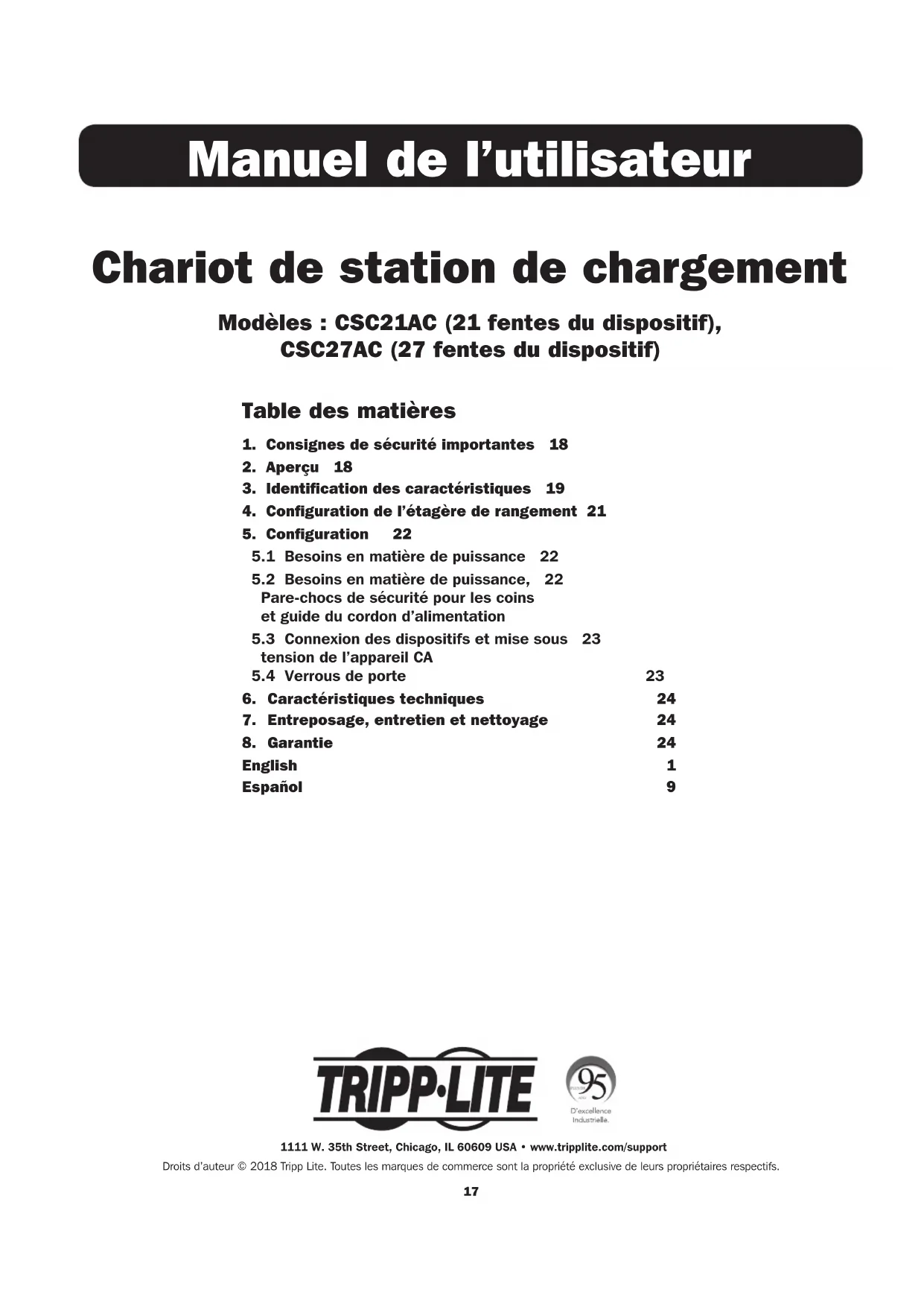 1111 W. 35th Street, Chicago, IL 60609 USA • www.tripplite.com/support17 Chariot de station de chargement Modèles : CSC21AC (21 fentes du dispositif), CSC27AC (27 fentes du dispositif) Manuel de l’utilisateur 1111 W. 35th Street, Chicago, IL 60609 USA • www.tripplite.com/support Droits d’auteur © 2018 Tripp Lite. Toutes les marques de commerce sont la propriété exclusive de leurs propriétaires respectifs. Table des matières