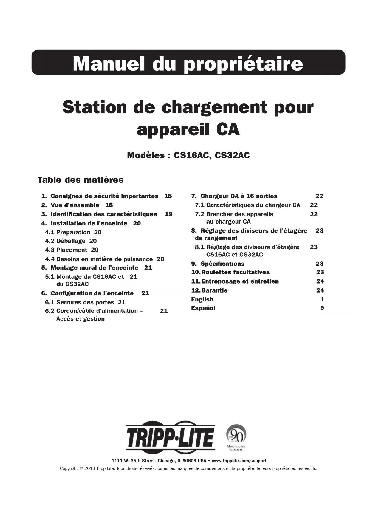 English 1 Español 9 Station de chargement pour appareil CA Modèles : CS16AC, CS32AC Manuel du propriétaire 1111 W. 35th Street, Chicago, IL 60609 USA • www.tripplite.com/support Copyright © 2014 Tripp Lite. Tous droits réservés.Toutes les marques de commerce sont la propriété de leurs propriétaires respectifs.18