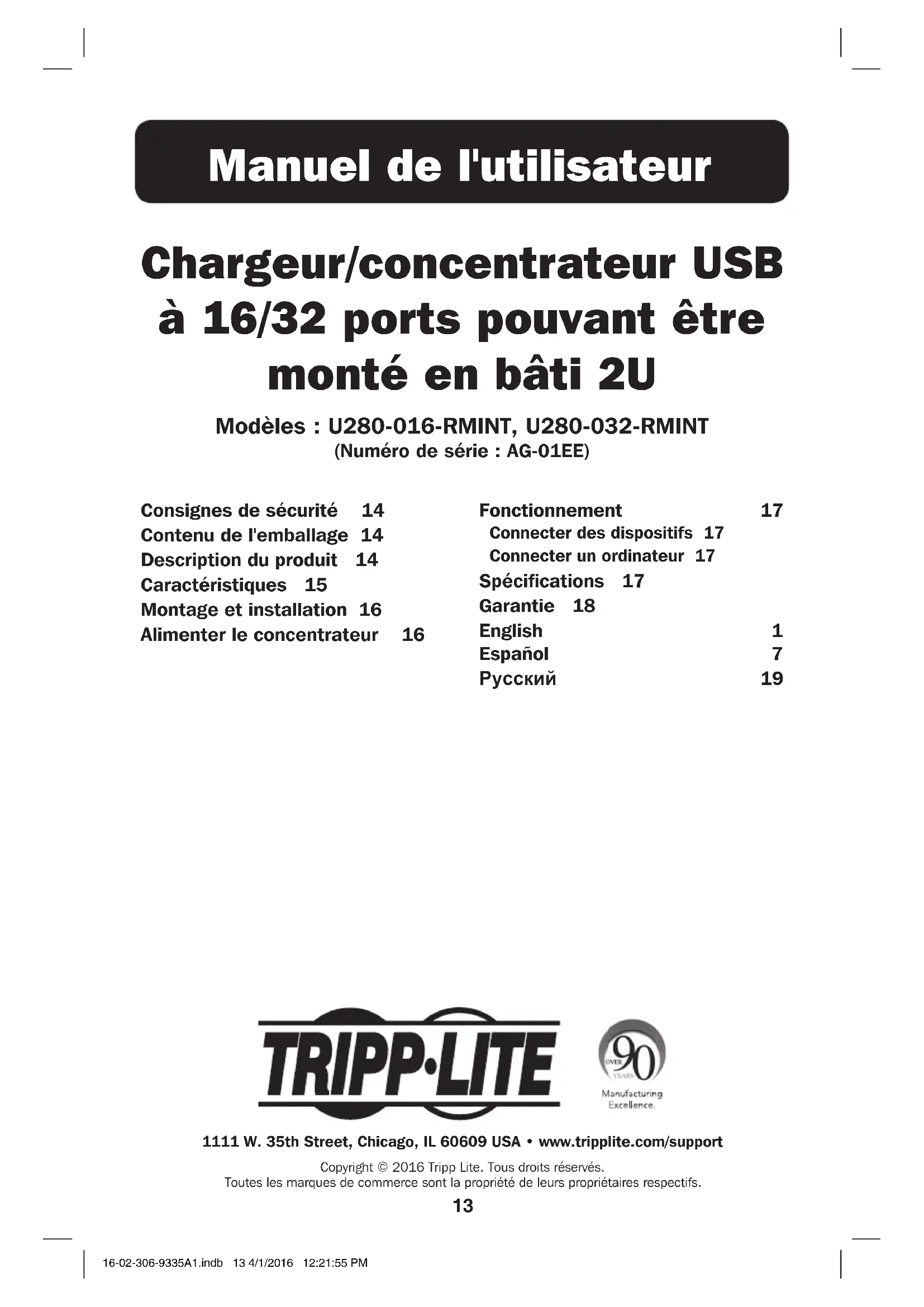 16-02-306-9335A1.indb 12 4/1/2016 12:21:53 PM13 Manuel de l'utilisateur Chargeur/concentrateur USB à 16/32 ports pouvant être monté en bâti 2U Modèles : U280-016-RMINT, U280-032-RMINT (Numéro de série : AG-01EE) 1111 W. 35th Street, Chicago, IL 60609 USA • www.tripplite.com/support Copyright © 2016 Tripp Lite. Tous droits réservés. Toutes les marques de commerce sont la propriété de leurs propriétaires respectifs. Consignes de sécurité 14 Contenu de l'emballage 14 Description du produit 14 Caractéristiques 15 Montage et installation 16 Alimenter le concentrateur 16 Fonctionnement 17 Connecter des dispositifs 17 Connecter un ordinateur 17 Spécifications 17 Garantie 18 English 1 Español 7 Русский 19 16-02-306-9335A1.indb 13 4/1/2016 12:21:55 PM14