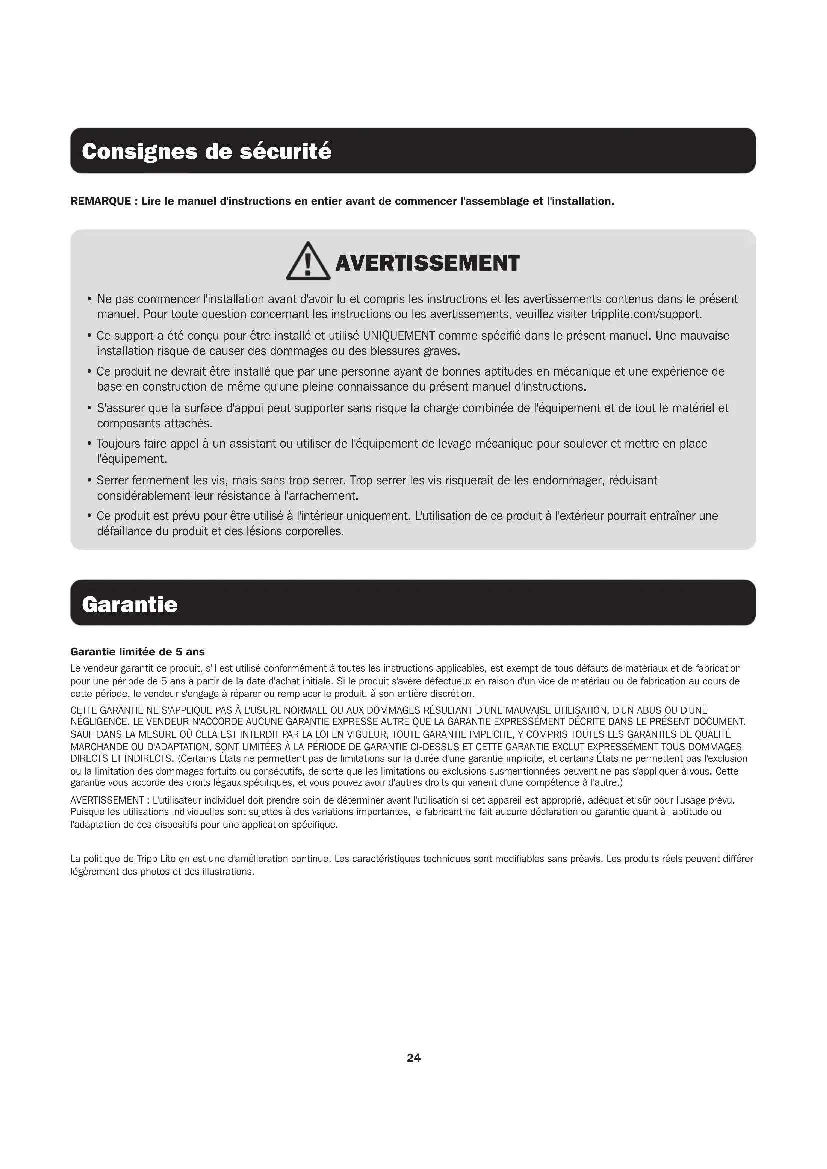 - Ne pas commencer l'installation avant d'avoir lu et compris les instructions et les avertissements contenus dans le présent manuel. Pour toute question concernant les instructions ou les avertissements, veuillez visiter tripplite.com/support.