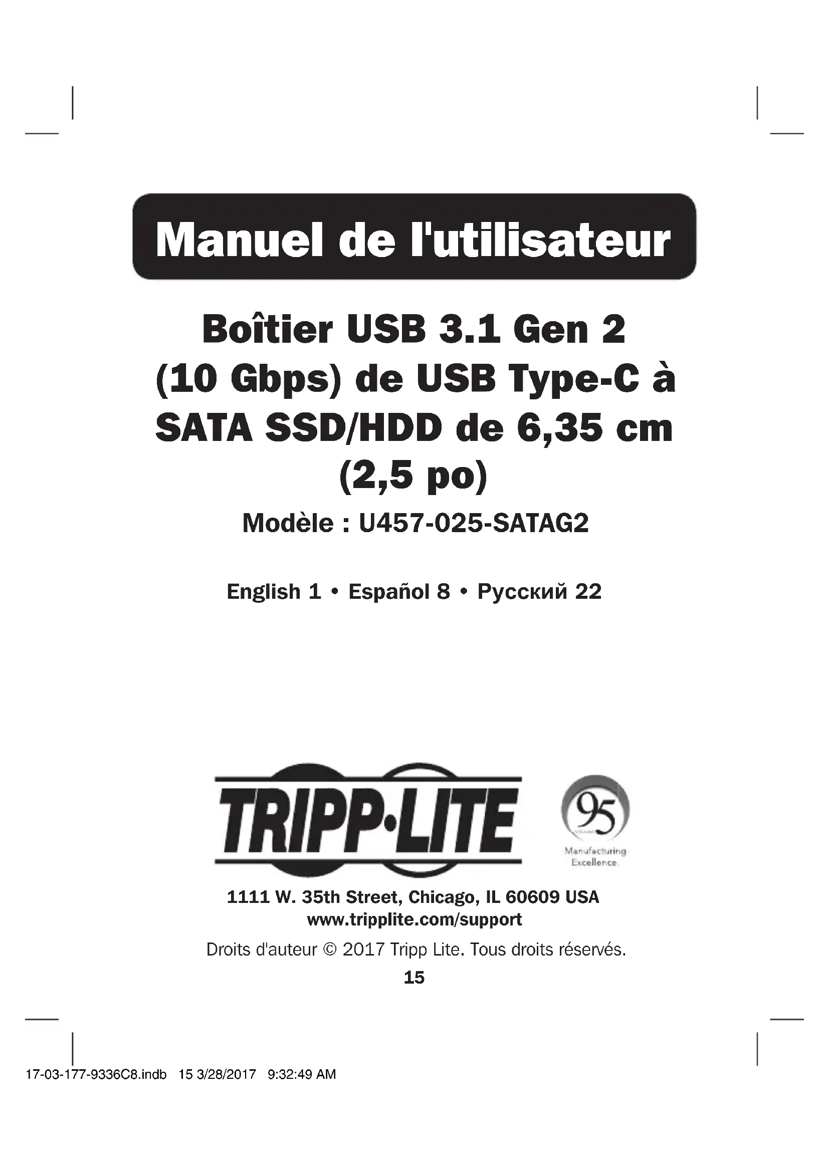 - De retourner le nouvel équipement afin qu'il soit recyclé à la fin de sa vie utile. Il n'est pas recommandé d'utiliser cet équipement pour des appareils de survie où une défaillance de cet équipement peut, selon toute vraisemblance, entraîner la défaillance de l’appareil de maintien de la vie ou affecter de façon majeure sa sécurité ou son efficacité. La politique de Tripp Lite en est une d'amélioration continue. Les caractéristiques techniques sont sujettes à changement sans préavis. 1111 W. 35th Street, Chicago, IL 60609 USA www.tripplite.com/support 17-03-177-9336C8.indb 21 3/28/2017 9:32:49 AM22 Руководство пользователя Корпус для жесткого диска/ твердотельного накопителя с разъемами USB 3.1 Gen 2 (10 Гбит/с) USB Type-C и 2.5” SATA Модель: U457-025-SATAG2 English 1 • Español 8 • Français 15 1111 W. 35th Street, Chicago, IL 60609 USA www.tripplite.com/support Охраняется авторским правом © 2017 Tripp Lite. Перепечатка запрещается. 17-03-177-9336C8.indb 22 3/28/2017 9:32:49 AM23 Содержимое упаковки Характеристики продукта