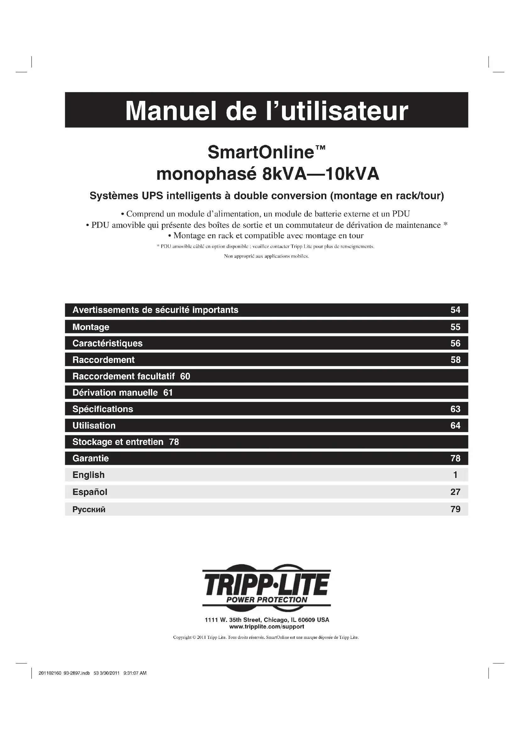 - PDU amovible câblé en option disponible ; veuillez contacter Tripp Lite pour plus de renseignements.Non approprié aux applications mobiles. Avertissements de sécurité importants 54 Montage 55 Raccordement 58 Caractéristiques 56 Utilisation 64 Stockage et entretien 78 Garantie 78 Raccordement facultatif 60 Dérivation manuelle 61 Spécifications 63 English 1 Español 27 Ðóññêèé 79 201102160 93-2897.indb 53 3/30/2011 9:31:07 AM54 Avertissements de sécurité importants VEUILLEZ CONSERVER CES INSTRUCTIONS. Le présent manuel contient des consignes et avertissements importants qui doivent être suivis tout au long de l’installation et des travaux de maintenance de tous Systèmes UPS Tripp Lite SmartOnline, en montage en rack/tour, et de leurs batteries. Ne pas tenir compte de ces mises en garde pourrait affecter votre garantie. Avertissements concernant l’emplacement de l’UPS