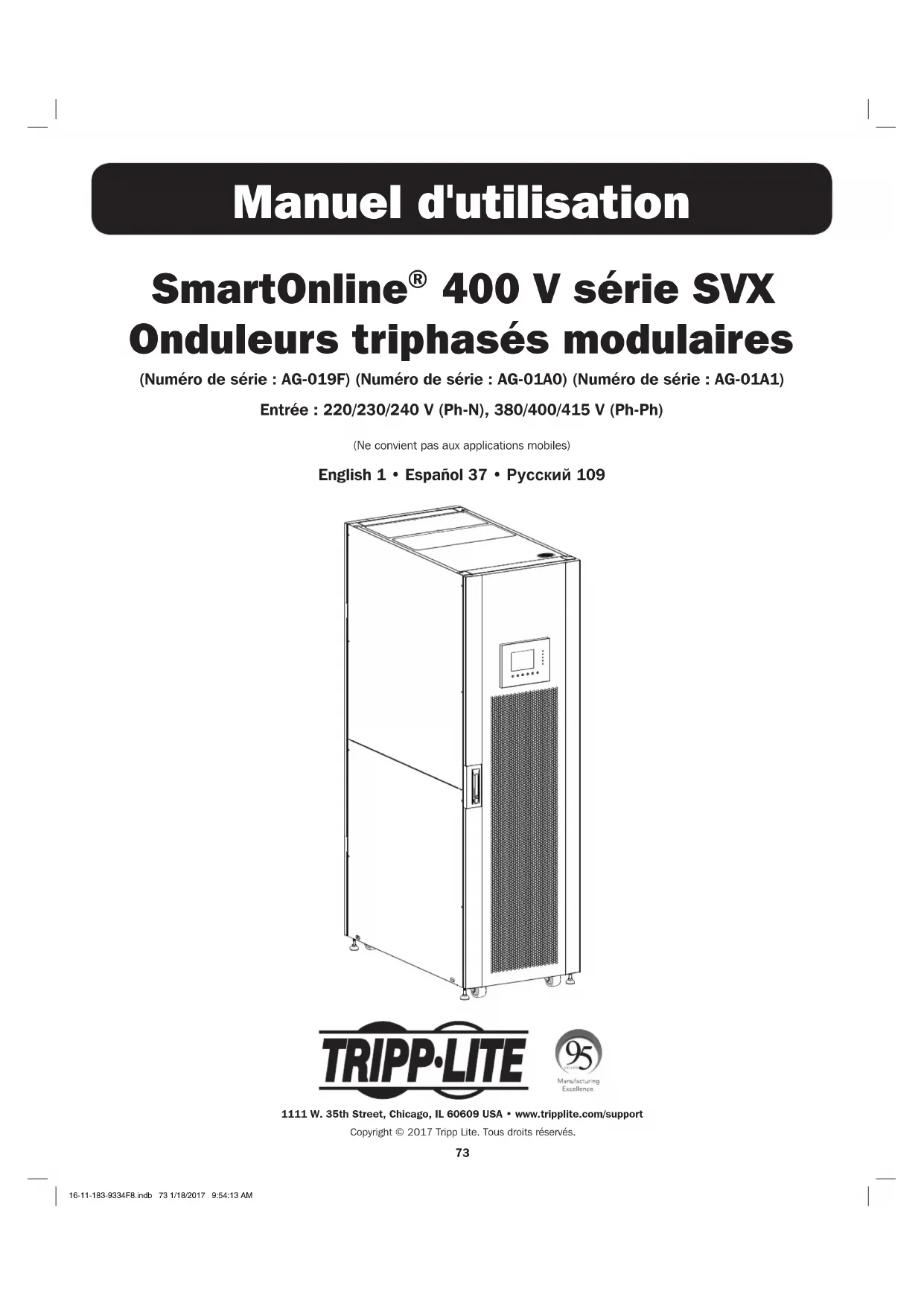 400 V série SVX Onduleurs triphasés modulaires (Numéro de série : AG-019F) (Numéro de série : AG-01A0) (Numéro de série : AG-01A1) Entrée : 220/230/240 V (Ph-N), 380/400/415 V (Ph-Ph) (Ne convient pas aux applications mobiles) English 1 • Español 37 • Русский 109 1111 W. 35th Street, Chicago, IL 60609 USA • www.tripplite.com/supportCopyright © 2017 Tripp Lite. Tous droits réservés.16-11-183-9334F8.indb 73 1/18/2017 9:54:13 AM74 Sommaire
