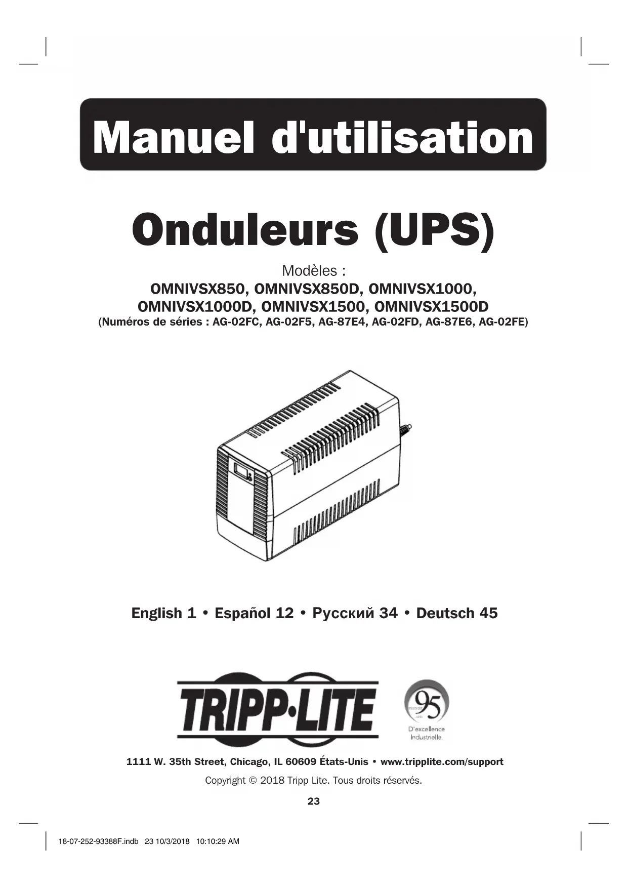 (Numéros de séries : AG-02FC, AG-02F5, AG-87E4, AG-02FD, AG-87E6, AG-02FE) Manuel d'utilisation 1111 W. 35th Street, Chicago, IL 60609 États-Unis • www.tripplite.com/support Copyright © 2018 Tripp Lite. Tous droits réservés. English 1 • Español 12 • Русский 34 • Deutsch 45 18-07-252-93388F.indb 23 10/3/2018 10:10:29 AM24
