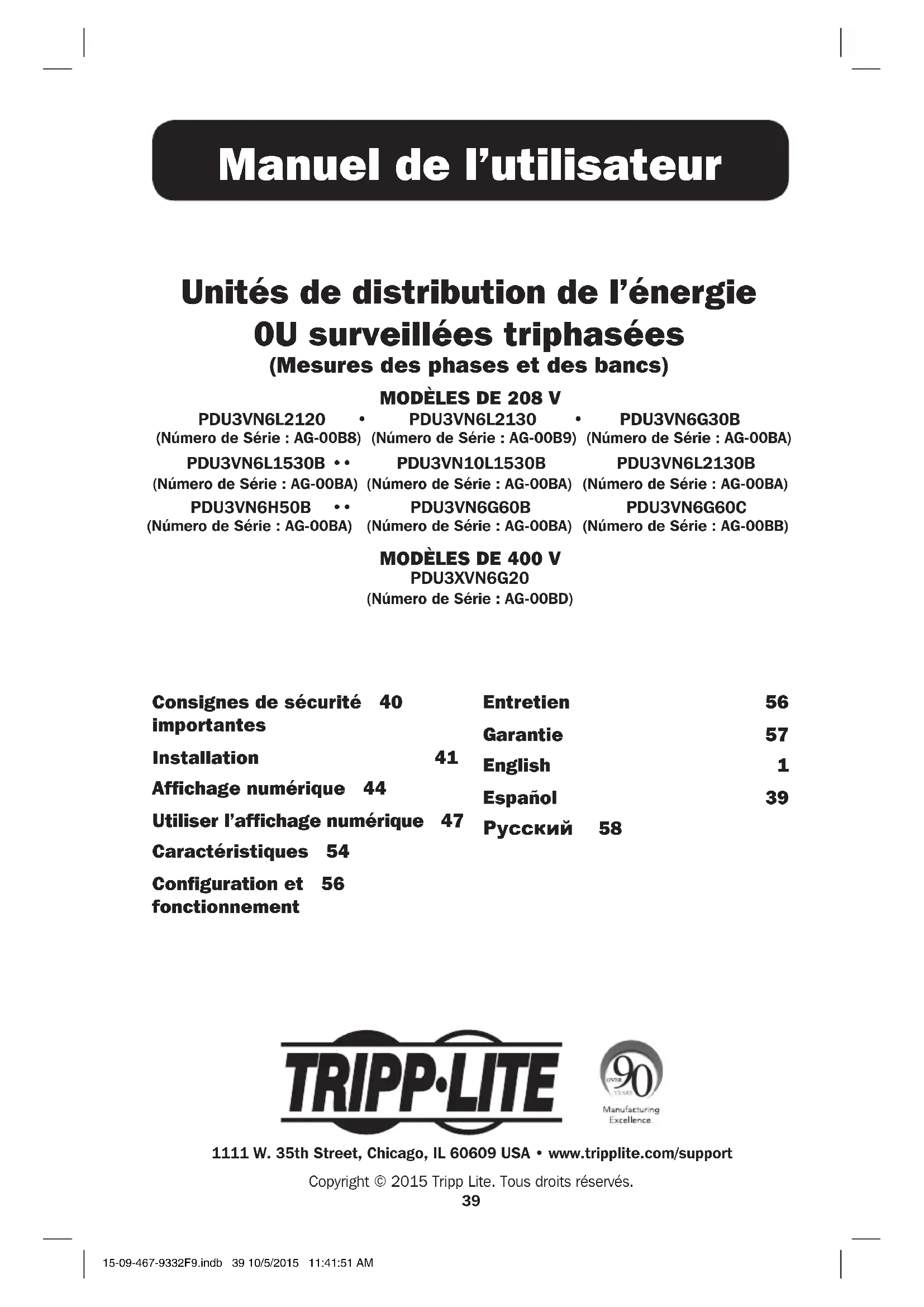 (Número de Série : AG-00BD) Consignes de sécurité 40 importantes Installation 41 Affichage numérique 44 Utiliser l’affichage numérique 47 Caractéristiques 54 Configuration et 56 fonctionnement Entretien 56 Garantie 57 English 1 Español 39 Русский 58 1111 W. 35th Street, Chicago, IL 60609 USA • www.tripplite.com/supportCopyright © 2015 Tripp Lite. Tous droits réservés.