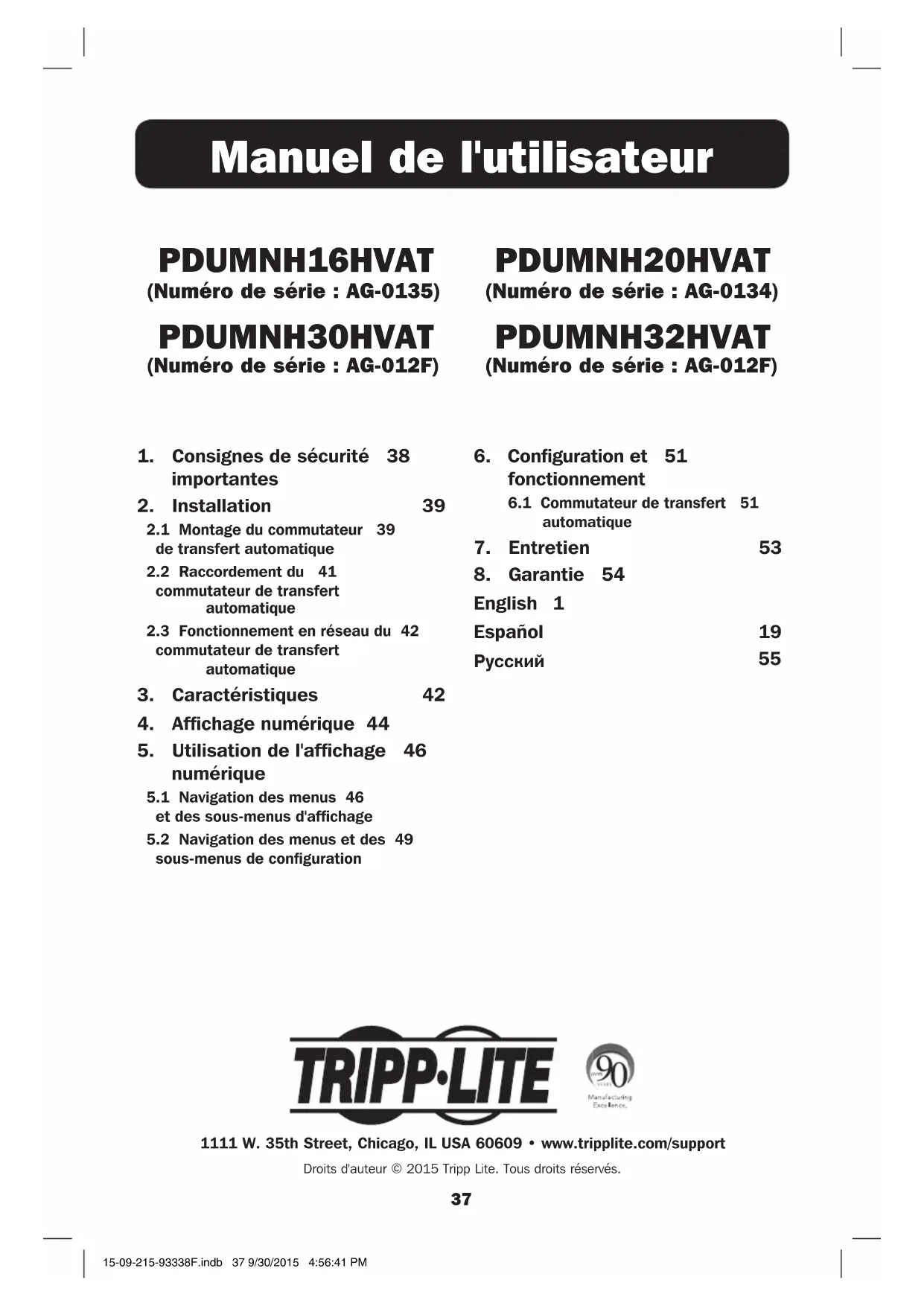 Manuel de l'utilisateur 1111 W. 35th Street, Chicago, IL USA 60609 • www.tripplite.com/supportDroits d'auteur © 2015 Tripp Lite. Tous droits réservés. PDUMNH16HVAT (Numéro de série : AG-0135) PDUMNH30HVAT (Numéro de série : AG-012F) PDUMNH20HVAT (Numéro de série : AG-0134) PDUMNH32HVAT (Numéro de série : AG-012F) 15-09-215-93338F.indb 37 9/30/2015 4:56:41 PM38