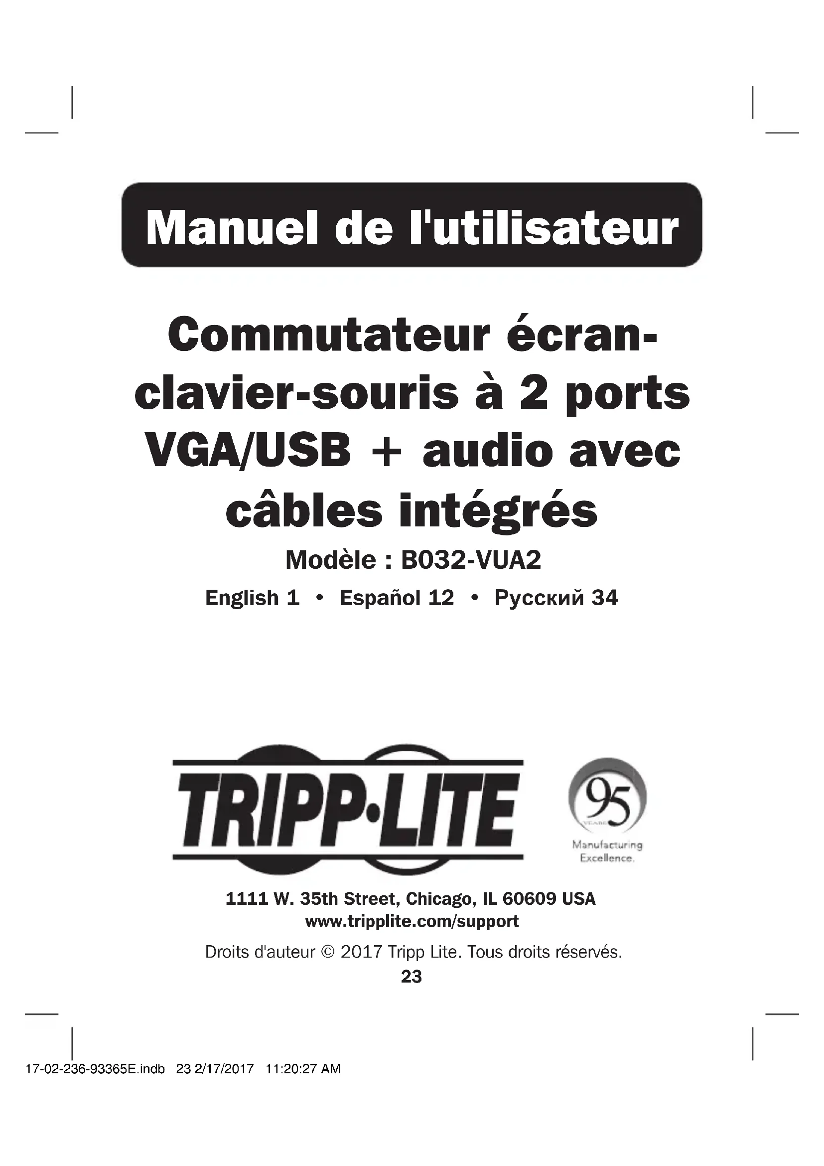 - De retourner le nouvel équipement afin qu'il soit recyclé à la fin de sa vie utile. Il n'est pas recommandé d'utiliser cet équipement pour des appareils de survie où une défaillance de cet équipement peut, selon toute vraisemblance, entraîner la défaillance de l’appareil de maintien de la vie ou affecter de façon majeure sa sécurité ou son efficacité. La politique de Tripp Lite en est une d'amélioration continue. Les caractéristiques techniques sont sujettes à changement sans préavis. 1111 W. 35th Street, Chicago, IL 60609 USA www.tripplite.com/support 17-02-236-93365E.indb 33 2/17/2017 11:20:28 AM34 Руководство пользователя 2-портовый КВМ- переключатель с разъемами VGA/USB и аудиоканалом Модель: B032-VUA2 English 1 • Español 12 • Français 23 1111 W. 35th Street, Chicago, IL 60609 USA www.tripplite.com/support Охраняется авторским правом © 2017 Tripp Lite. Перепечатка запрещается. 17-02-236-93365E.indb 34 2/17/2017 11:20:28 AM35 Характеристики продукта Содержимое упаковки