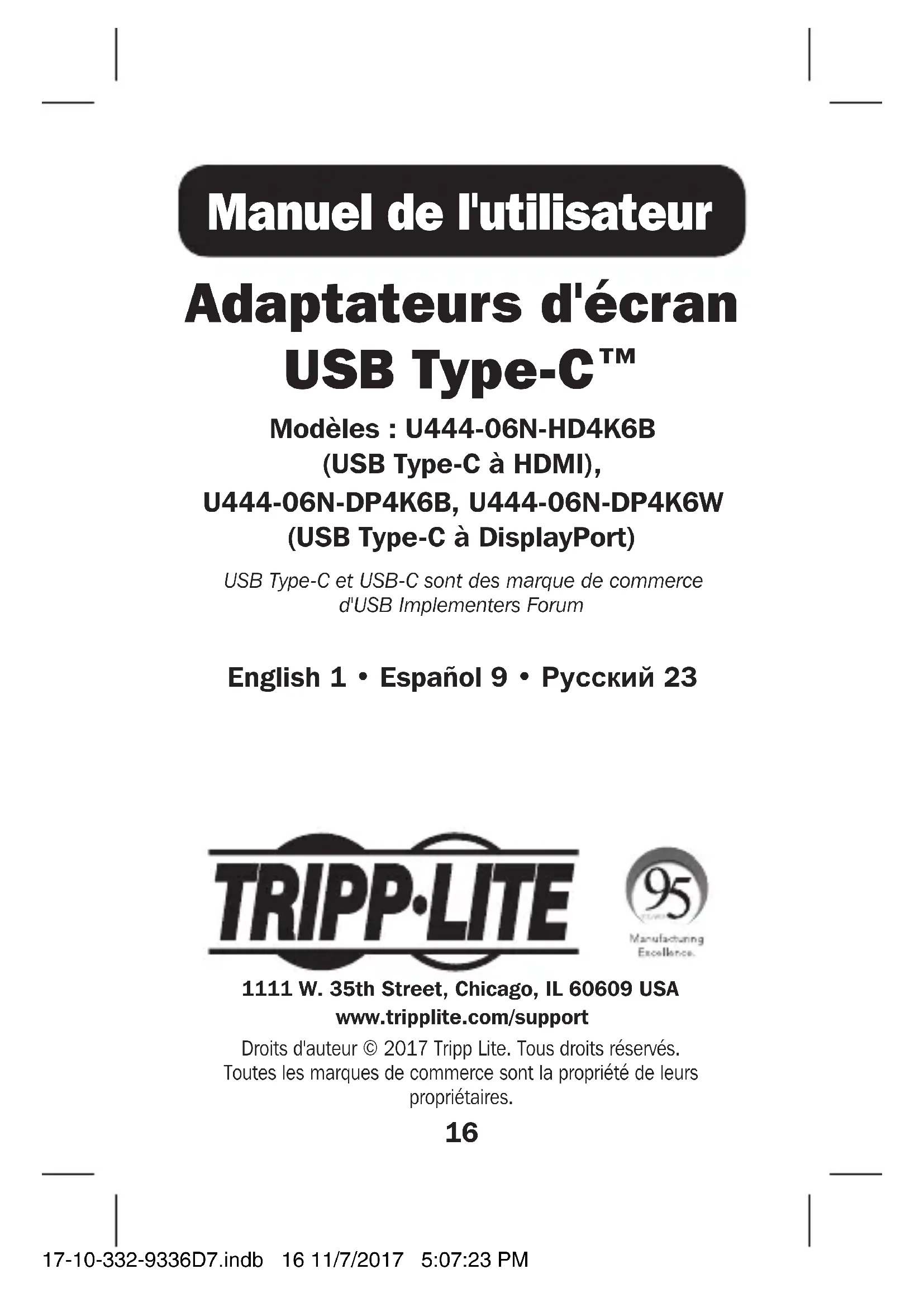- De retourner le nouvel équipement afin qu'il soit recyclé à la fin de sa vie utile. Il n'est pas recommandé d'utiliser cet équipement pour des appareils de survie où une défaillance de cet équipement peut, selon toute vraisemblance, entraîner la défaillance de l’appareil de maintien de la vie ou affecter de façon majeure sa sécurité ou son efficacité. La politique de Tripp Lite en est une d'amélioration continue. Les caractéristiques techniques sont sujettes à changement sans préavis. Garantie 1111 W. 35th Street, Chicago, IL 60609 USA www.tripplite.com/support 17-10-332-9336D7.indb 22 11/7/2017 5:07:23 PM23 Руководство пользователя Адаптеры для дисплеев с разъемами USB Type-C™ Модели: U444-06N-HD4K6B (USB Type-C / HDMI), U444-06N-DP4K6B, U444-06N-DP4K6W (USB Type-C / DisplayPort) USB Type-C и USB-C являются торговыми знаками компании USB Implementers Forum 1111 W. 35th Street, Chicago, IL 60609 USA www.tripplite.com/support Охраняется авторским правом © 2017 Tripp Lite. Перепечатка запрещается. Все торговые знаки являются собственностью своих владельцев. English 1 • Español 9 • Français 17 17-10-332-9336D7.indb 23 11/7/2017 5:07:23 PM24 Характеристики продукта