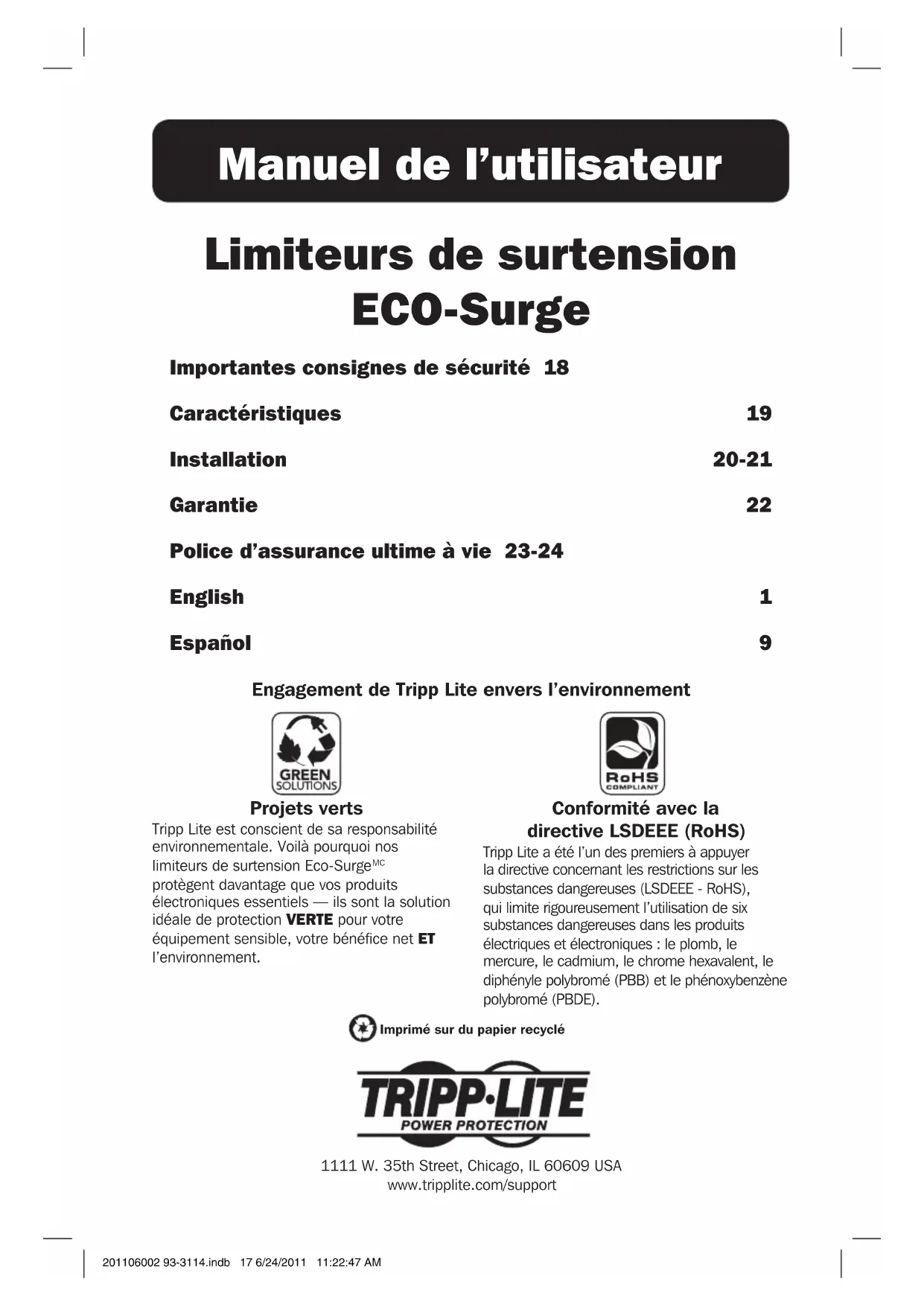 Manuel de l’utilisateur Limiteurs de surtension ECO-Surge Importantes consignes de sécurité 18 Caractéristiques 19 Installation 20-21 Garantie 22 Police d’assurance ultime à vie 23-24 English 1 Español 9 Engagement de Tripp Lite envers l’environnement 1111 W. 35th Street, Chicago, IL 60609 USA www.tripplite.com/support Projets verts Tripp Lite est conscient de sa responsabilité environnementale. Voilà pourquoi nos limiteurs de surtension Eco-Surge