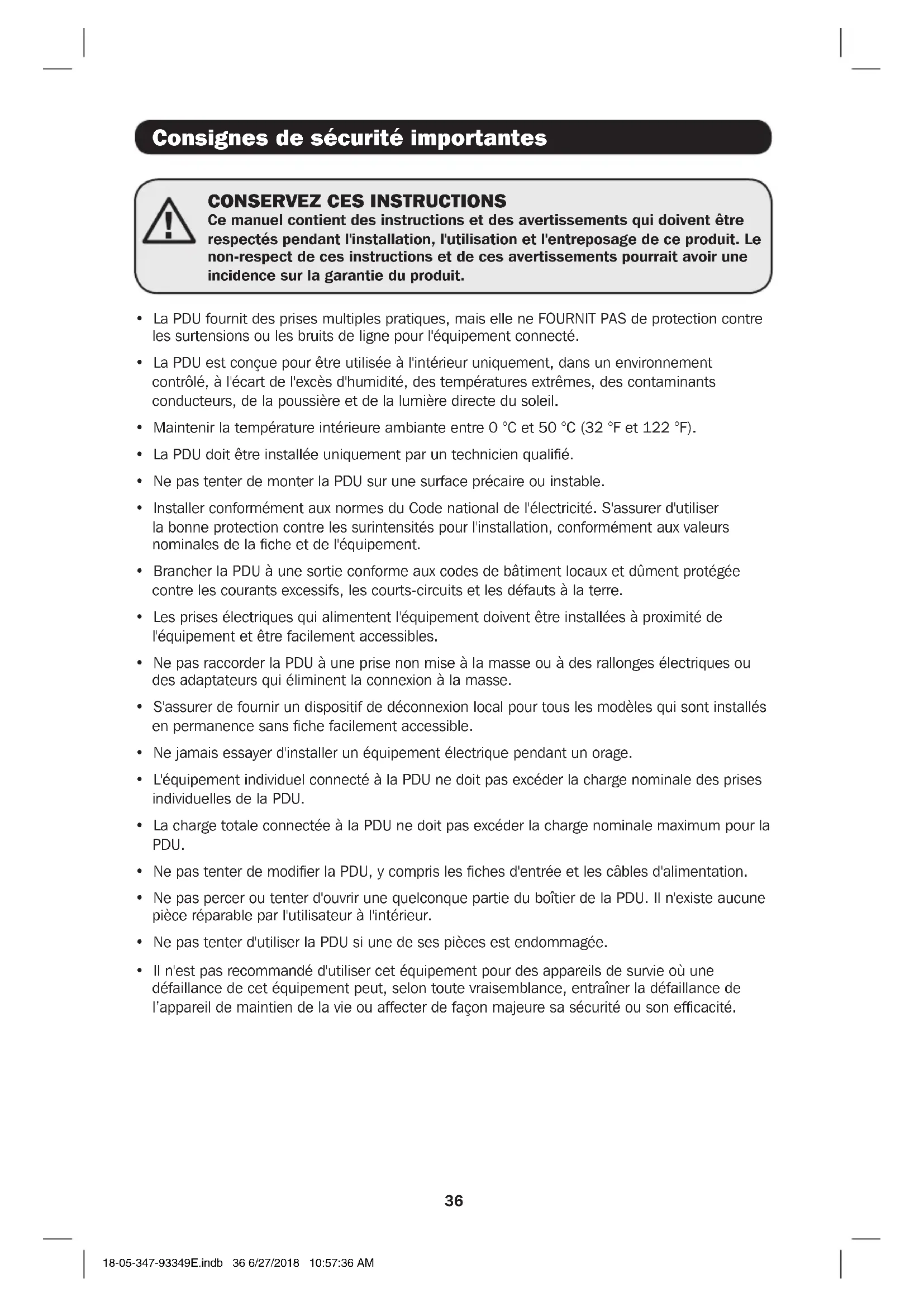 - L'équipement individuel connecté à la PDU ne doit pas excéder la charge nominale des prises individuelles de la PDU.