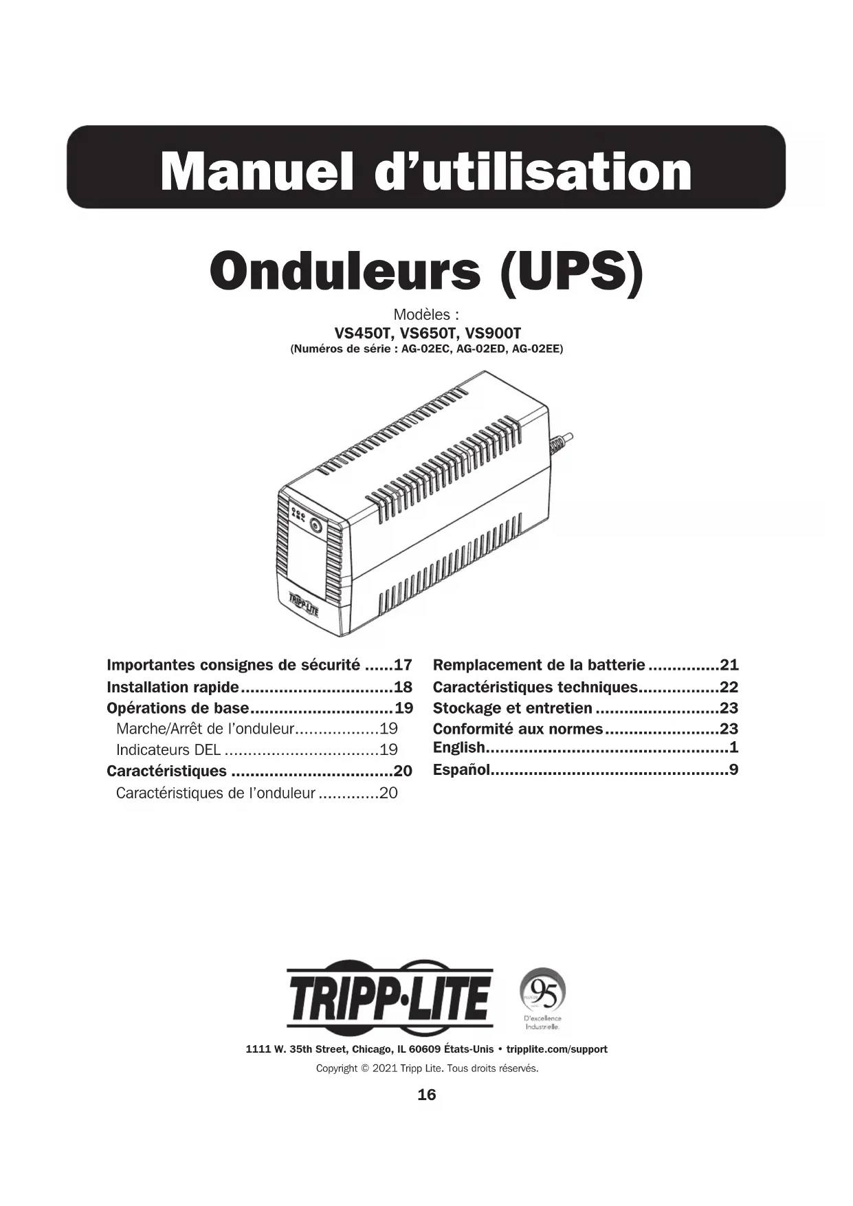 Modèle VS900T illustré21 Remplacement de la batterie Dans des conditions normales, la batterie d’origine de votre onduleur durera plusieurs années. Le remplacement de la batterie ne doit être effectué que par du personnel qualifié. Reportez-vous aux Avertissements concernant la batterie pour des informations complètes concernant la sécurité des batteries. Le VS450T nécessite une batterie de remplacement de 12V DC, 4.5 Ah. Le VS650T nécessite une batterie de remplacement de 12V DC, 7 Ah. Le VS950T nécessite une batterie de remplacement de 12V DC, 7 Ah. Pour tout complément d’information sur les commandes et la comptabilité des batteries de remplacement, consultez la page www.tripplite. com/products/battery-finder. Le remplacement de batterie doit être effectué en utilisant la même quantité et le même type de batterie : batterie au plomb scellée de 12 V CC à 6 cellules conforme à la norme UL 1989. ATTENTION : Risque de danger électrique. Avant de remplacer des batteries, retirez tout bijou conducteur, y compris tout(e) chaîne, montre et bague. La puissante énergie passant dans les matériaux conducteurs peut causer de graves brûlures.22 Caractéristiques techniques Modèle VS450T VS650T VS900T Tension(s) nominale(s) d'entrée et plage 120V~, 89-145V~ 120V~, 89-145V~ 120V~, 89-145V~ Fréquence d'entrée nominale et tolérance 50/60 Hz (+/- 5 Hz) 50/60 Hz (+/- 5 Hz) 50/60 Hz (+/- 5 Hz) Tension de sortie nominale 120 V~ sinusoïdale en mode en ligne et 120 V~ à modulation de largeur d'impulsion en mode batterie 120 V~ sinusoïdale en mode en ligne et 120 V~ à modulation de largeur d'impulsion en mode batterie 120 V~ sinusoïdale en mode en ligne et 120 V~ à modulation de largeur d'impulsion en mode batterie Fréquence de sortie nominale 50/60 Hz (+/-0,5 Hz) 50/60 Hz (+/-0,5 Hz) 50/60 Hz (+/-0,5 Hz) Régulation de tension de sortie en mode en ligne 120 V~ (+ 9 %/- 12 %) 120 V~ (+ 9 %/- 12 %) 120 V~ (+ 9 %/- 12 %) Régulation de tension de sortie en mode batterie 120V~ (+/-10%) 120V~ (+/-10%) 120V~ (+/-10%) Puissance nominale de sortie en W/VA : 240W / 450VA 360W / 650VA 480 W/900 VA Forme d'onde de tension de sortie Sinusoïdale en mode en ligne et quasi-sinusoïdale (à modulation de largeur d'impulsion) en mode batterie Sinusoïdale en mode en ligne et quasi-sinusoïdale (à modulation de largeur d'impulsion) en mode batterie Sinusoïdale en mode en ligne et quasi-sinusoïdale (à modulation de largeur d'impulsion) en mode batterie Intensité maximale de sortie @ P.F. 3.8A @ 120V~ 5,4 A @ 120 V~ 7,5 A @ 120 V~ P.F. = 0,53 P.F. = 0,55 P.F. = 0,53 Efficacité avec la charge nominale 95% 95% 95% Altitude de fonctionnement maximum à 100 % de la puissance nominale 2 000 m [6 562 pi] au-dessus du niveau de la mer 2 000 m [6 562 pi] au-dessus du niveau de la mer 2 000 m [6 562 pi] au-dessus du niveau de la mer Capacité de surcharge en ligne 110 % @ 5 minutes 110 % @ 5 minutes 110 % @ 5 minutes Capacité de surcharge en mode batterie 110 % @ 5 minutes 110 % @ 5 minutes 110 % @ 5 minutes Limitation de courant Entrée 5 A Entrée 7 A Entrée 10 A Durée d'autonomie à pleine charge 0,5 minute @ 240 W 0,5 minute @ 360 W 0,5 minute @ 480 W Temps de recharge de la batterie 8 heures 8 heures 8 heures Temps de transfert 6 millisecondes typiques (6 millisecondes max.) 6 millisecondes typiques (6 millisecondes max.) 6 millisecondes typiques (6 millisecondes max.) Prises 3x prises 5-15R avec batterie de secours, régulation et surtension; 1x sortie 5-15R pour surtensions seulement 4x prises 5-15R avec batterie de secours, régulation et surtension; 2x sorties 5-15R pour surtensions seulement 4x prises 5-15R avec batterie de secours, régulation et surtension; 2x sorties 5-15R pour surtensions seulement Courant d'entrée maximum 5 A 6A 10 A23 Stockage Pour éviter de décharger la batterie, tous les équipements connectés doivent être éteints et débranchés de l’onduleur. Appuyez sur le bouton pendant une seconde, puis débranchez l’onduleur du secteur. Votre onduleur sera alors complètement hors tension (désactivé) et prêt à être rangé. Si vous envisagez de stocker votre onduleur pendant une période prolongée, rechargez complètement les batteries tous les trois mois. Branchez l’onduleur à une prise secteur alimentée, allumez-le en appuyant sur le bouton pendant une seconde et laissez les batteries se recharger pendant 4 à 6 heures. Si les batteries de votre onduleur restent déchargées trop longtemps, elles peuvent subir une perte permanente de capacité. Entretien Tripp Lite propose divers programmes de garantie étendue et d’entretien sur site. Pour plus de détails, veuillez visiter le site tripplite.com/support. Avant de renvoyer votre produit pour réparation, procédez comme suit : 1. Passez en revue les procédures d’installation et d’utilisation de ce manuel pour vous assurer que le problème ne provient pas d’une interprétation incorrecte des instructions. 2. Si le problème persiste, ne contactez pas et ne retournez pas immédiatement le produit à votre revendeur. Au lieu de cela, visitez le site tripplite.com/support. 3. Si le problème nécessite une réparation, rendez-vous sur le site tripplite.com/support et cliquez sur le lien « Retour du produit ». Vous pourrez alors demander un numéro d’autorisation de retour de matériel (RMA), exigé pour toute réparation. Ce simple formulaire en ligne vous demandera de fournir la référence et le numéro de série de votre appareil, ainsi que d’autres renseignements sur l’acheteur. Le numéro RMA et les consignes d’expédition vous seront envoyés par courriel. Tout dommage (direct, indirect, spécial ou consécutif) au produit encouru lors de l’expédition à Tripp Lite ou à un centre de service agréé Tripp Lite ne sera pas couvert par la garantie. Les frais de transport des produits envoyés à Tripp Lite ou à un centre de service agréé Tripp Lite doivent être pay