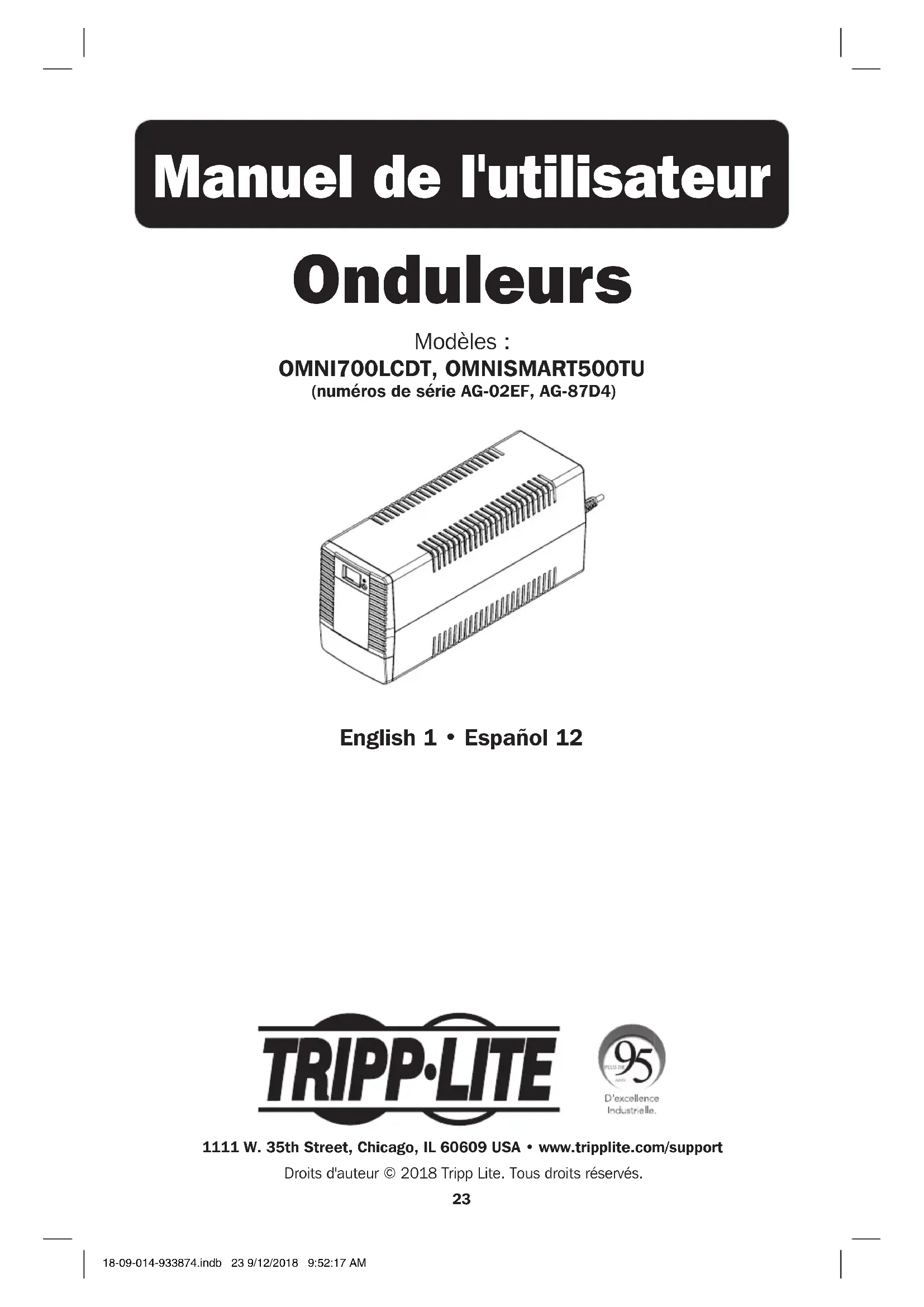 (numéros de série AG-02EF, AG-87D4) Manuel de l'utilisateur 1111 W. 35th Street, Chicago, IL 60609 USA • www.tripplite.com/support Droits d'auteur © 2018 Tripp Lite. Tous droits réservés. English 1 • Español 12 18-09-014-933874.indb 23 9/12/2018 9:52:17 AM24 CONSERVER CES INSTRUCTIONS. Ce manuel contient des instructions et des avertissements qui doivent être respectés pendant l'installation, l'utilisation et l'entreposage de ce produit. Tout manquement à ces avertissements peut affecter la garantie. Mises en garde concernant le placement de l'onduleur