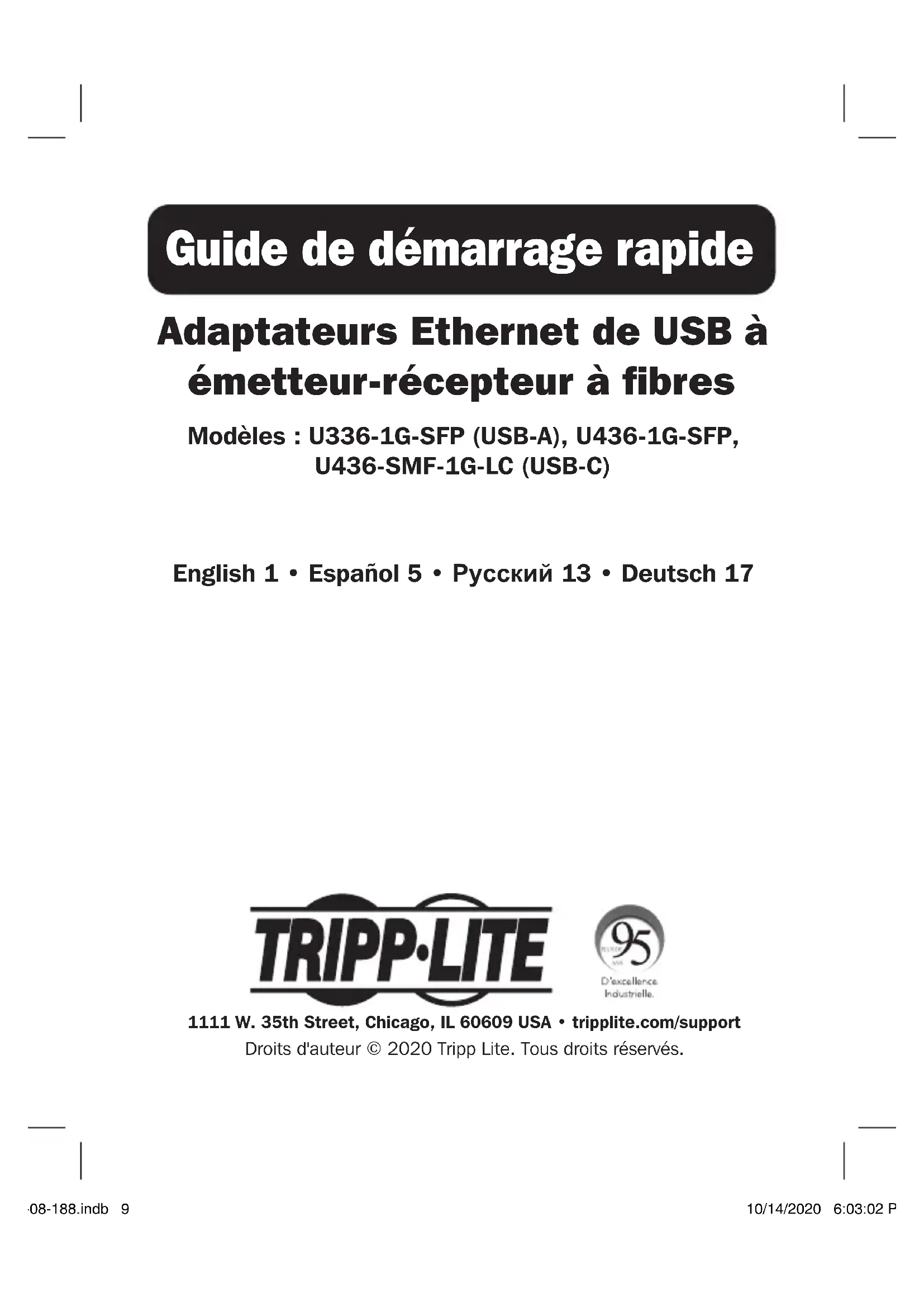 Le voyant à DEL clignotera pendant le transfert des données. L'emballage comprend Configuration requise Installation 20-08-188.indb 1120-08-188.indb 11 10/14/2020 6:03:02 PM10/14/2020 6:03:02 PM12 1111 W. 35th Street, Chicago, IL 60609 USA • tripplite.com/support 20-08-188 93-3D07_RevA Caractéristiques techniques U336-1G-SFP U436-1G-SFP U436-SMF-1G-LC Connecteur d'entrée USB-A (mâle) USB-C (mâle) USB-C (mâle) Connecteur de sortie Port pour émetteur- récepteur SFP ouvert (femelle) Port pour émetteur- récepteur SFP ouvert (femelle) Module de l'émetteur- récepteur SM SFP LC Bande passante 1 000 Mbps 1 000 Mbps 1 000 Mbps Distance max. 5 km (Singlemode); 550 m (Multimode) 5 km (Singlemode); 550 m (Multimode) 5 km (Singlemode) Longueur d'onde 1 310 nm 1 310 nm 1 310 nm Type de fibres Ouvrir Ouvrir Singlemode (SM) Version USB USB 3.0 (5 Gbps) USB Type C (5 Gbps) USB Type C (5 Gbps) Compatibilité du réseau Fiber Channel IEEE 302.3z et ANSI Fiber Channel IEEE 302.3z et ANSI Fiber Channel IEEE 302.3z et ANSI Plage de températures de fonctionnement 0 à 55 °C (32 à 131 °F) 0 à 55 °C (32 à 131 °F) 0 à 55 °C (32 à 131 °F) Plage de températures d'entreposage 0 à 60 °C (32 à 140 °F) 0 à 60 °C (32 à 140 °F) 0 à 60 °C (32 à 140 °F) Humidité relative 5 à 90 % HR 5 à 90 % HR 5 à 90 % HR Garantie limitée de 3 ans TRIPP LITE garantit que ses produits sont exempts de vices de matériaux et de fabrication pendant une période de trois (3) ans à partir de la date d'achat initiale. La responsabilité de TRIPP LITE, en vertu de la présente garantie, se limite à la réparation ou au remplacement (à sa seule discrétion) de ces produits défectueux. Pour obtenir une réparation sous la présente garantie, vous devez obtenir un numéro d'autorisation de retour de matériel (RMA) auprès de TRIPP LITE ou d'un centre de réparation reconnu par TRIPP LITE. Les produits doivent être retournés à TRIPP LITE ou à un centre de réparation reconnu par TRIPP LITE en port prépayé et être accompagnés d'une brève description du problème et d'un justificatif de la date et du lieu d'achat. Cette garantie ne s'applique pas au matériel ayant été endommagé suite à un accident, à une négligence ou à une application abusive, ou ayant été altéré ou modifié d'une façon quelconque. SAUF INDICATION CONTRAIRE DANS LES PRÉSENTES, TRIPP LITE N'ÉMET AUCUNE GARANTIE, EXPRESSE OU TACITE, Y COMPRIS DES GARANTIES DE QUALITÉ COMMERCIALE ET D'ADAPTATION À UN USAGE PARTICULIER. Certains États n'autorisant pas la limitation ni l'exclusion de garanties tacites, les limitations ou exclusions susmentionnées peuvent ne pas s'appliquer à l'acheteur. À L'EXCEPTION DES DISPOSITIONS CI-DESSUS, TRIPP LITE NE POURRA EN AUCUN CAS ÊTRE TENUE RESPONSABLE DE DOMMAGES DIRECTS, INDIRECTS, SPÉCIAUX, FORTUITS OU CONSÉCUTIFS RÉSULTANT DE L'UTILISATION DE CE PRODUIT, MÊME SI AYANT ÉTÉ AVISÉE DE L'ÉVENTUALITÉ DE TELS DOMMAGES. Plus précisément, Tripp Lite ne pourra être tenue responsable de coûts, tels que perte de bénéfices ou de recettes, perte de matériel, impossibilité d'utilisation du matériel, perte de logiciel, perte de données, frais de produits de remplacement, réclamations d'un tiers ou autres. 20-08-188.indb 1220-08-188.indb 12 10/14/2020 6:03:02 PM10/14/2020 6:03:02 PM13 Приемопередающие Ethernet-адаптеры USB — оптоволокно Модели: U336-1G-SFP (USB-A), U436-1G-SFP, U436-SMF-1G-LC (USB-C) 1111 W. 35th Street, Chicago, IL 60609 USA • tripplite.com/support Охраняется авторским правом © 2020 Tripp Lite. Перепечатка запрещается. Краткое руководство пользователя English 1 • Español 5 • Français 9 • Deutsch 17 20-08-188.indb 1320-08-188.indb 13 10/14/2020 6:03:02 PM10/14/2020 6:03:02 PM14 Мод. U336-1G-SFP: