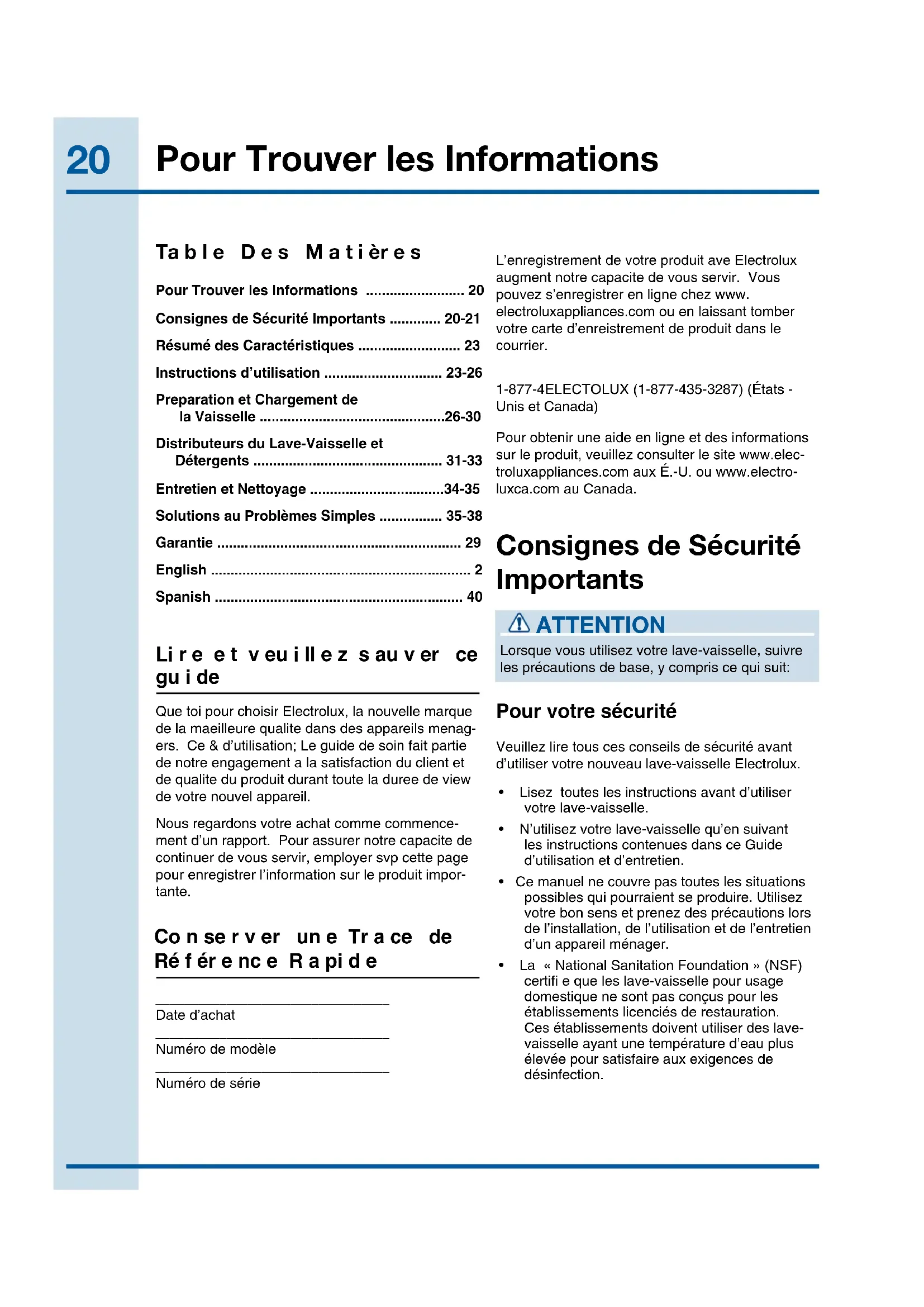 - Lisez toutes les instructions avant d’utiliser votre lave-vaisselle.• N’utilisez votre lave-vaisselle qu’en suivant les instructions contenues dans ce Guide d’utilisation et d’entretien.• Ce manuel ne couvre pas toutes les situations possibles qui pourraient se produire. Utilisez votre bon sens et prenez des précautions lors de l’installation, de l’utilisation et de l’entretien d’un appareil ménager.• La « National Sanitation Foundation » (NSF) certifi e que les lave-vaisselle pour usage domestique ne sont pas conçus pour les établissements licenciés de restauration. Ces établissements doivent utiliser des lave-vaisselle ayant une température d’eau plus élevée pour satisfaire aux exigences de désinfection. Pour votre sécurité21 Consignes de Sécurité Importants