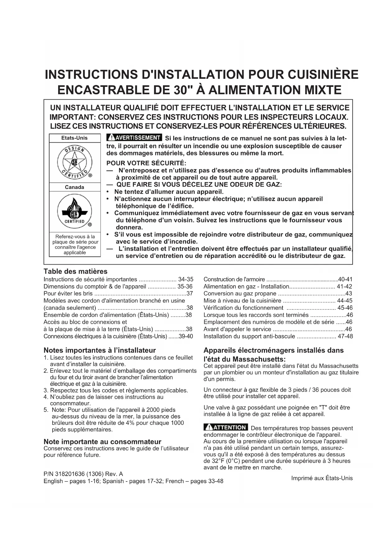 - Installation du support anti-bascule -48 Appareils électroménagers installés dans l'état du Massachusetts: Cet appareil peut être installé dans l'état du Massachusetts par un plombier ou un monteur d'installation au gaz titulaire d'un permis. Un connecteur à gaz exible de 3 pieds / 36 pouces doit être utilisé pour installer cet appareil. Une valve à gaz possédant une poignée en "T" doit être installée à la ligne de gaz reliée à cet appareil. Des températures trop basses peuvent endommager le contrôleur électronique de l'appareil. Au cours de la première utilisation ou lorsque l'appareil n'a pas été utilisé pendant un certain temps, assurez- vous qu'il a été exposé à des températures au dessus de 32°F (0°C) pendant une durée supérieure à 3 heures avant de le mettre en marche. Si les instructions de ce manuel ne sont pas suivies à la let‑ tre, il pourrait en résulter un incendie ou une explosion susceptible de causer des dommages matériels, des blessures ou même la mort. POUR VOTRE SÉCURITÉ: — N’entreposezetn’utilisezpasd’essenceoud’autresproduitsinammables à proximité de cet appareil ou de tout autre appareil. — QUE FAIRE SI VOUS DÉCELEZ UNE ODEUR DE GAZ: p. 47