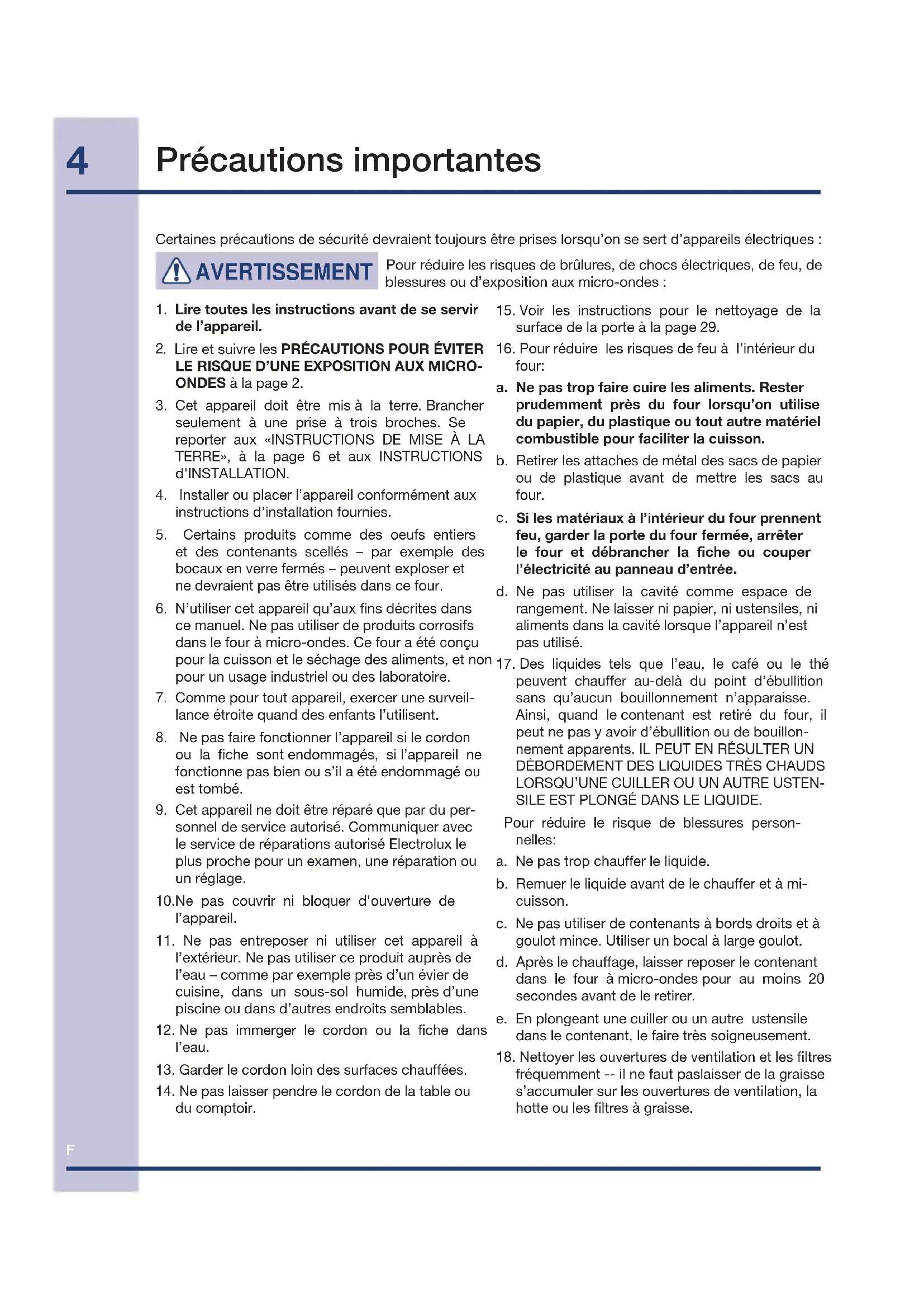Certaines précautions de sécurité devraient toujours être prises lorsqu’on se sert d’appareils électriques : AVERTISSEMENT Pour réduire les risques de brûlures, de chocs électriques, de feu, de blessures ou d’exposition aux micro-ondes :