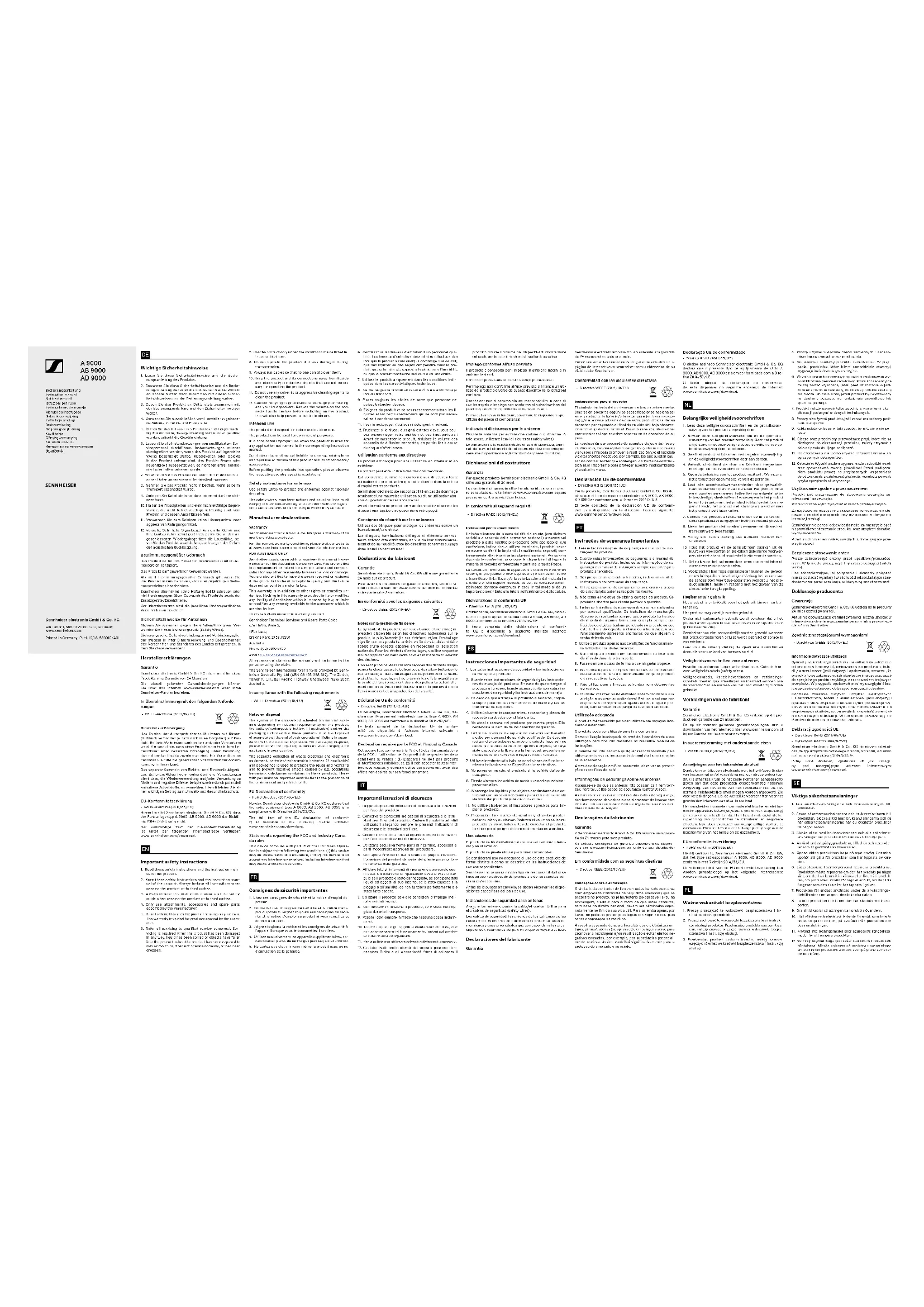 - Directive RoHS (2011/65/UE) Le soussigné, Sennheiser electronic GmbH & Co. KG, dé- clare que l’équipement radioélectrique du type A 9000, AB 9000, AD 9000 est conforme à la directive 2014/53/UE. Le texte complet de la déclaration UE de confor- mité est disponible à l’adresse internet suivante : www.sennheiser.com/download. Declaration requise par la FCC et l’Industry Canada Cet appareil est conforme à la Partie 15 des réglementations de la FCC. L’utilisation de l’appareil doit respecter les deux conditions suivantes : (1) L’appareil ne doit pas produire d’interférences nuisibles, et, (2) il doit accepter toutes inter- ferences reçues, y compris celles qui pourraient avoir des effets non désirés sur son fonctionnement.
