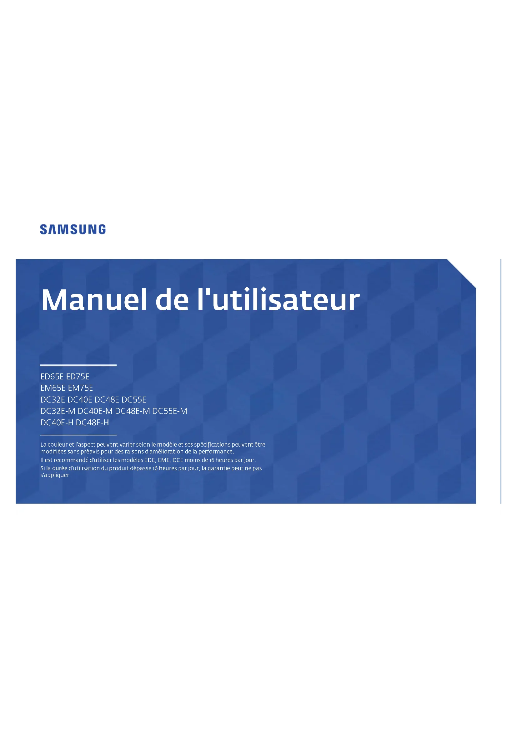 Manuel de l'utilisateur La couleur et l'aspect peuvent varier selon le modèle et ses spécifications peuvent être modifiées sans préavis pour des raisons d'amélioration de la performance. Il est recommandé d'utiliser les modèlesEDE, EME, DCE moins de 16heures par jour. Si la durée d'utilisation du produit dépasse 16heures par jour, la garantie peut ne pas s'appliquer. ED65E ED75E EM65E EM75E DC32E DC40E DC48E DC55E DC32E-M DC40E-M DC48E-M DC55E-M DC40E-H DC48E-HTable des matières Avant l'utilisation Avis de droit d'auteur 6 Consignes de sécurité 7 Symboles 7 Nettoyage 7 Rangement 8 Électricité et sécurité 8 Installation de l'appareil 9 Fonctionnement 11 Préparation Vérification des composants 15 Composants 15 Pièces 16 Panneau de configuration 16 Arrière de l'appareil 18 Arrière de l'appareil 19 Dispositif antivol 20 Télécommande 21 Avant d'installer l'appareil (guide d'installation) 23 Alternance entre portrait et paysage 23 Ventilation 23 Installation du support mural 24 Préparation préalable à l'installation du support mural 24 Installation du nécessaire de support mural 24 Spécifications du nécessaire de support mural (VESA) 25 Télécommande (RS232C) 26 Connexion du câble 26 Connexion 29 Codes de commande 30 Connexion et utilisation d’un périphérique source Avant la connexion 39 Points à vérifier avant la connexion 39 Connexion à un PC 39 Connexion à l'aide d'un câble D-SUB (type analogique) 39 Connexion à l'aide d'un câble DVI (type numérique) 40 Connexion à l'aide d'un câble HDMI-DVI 40 Connexion à l'aide d'un câble HDMI 41 Connexion à un périphérique vidéo 42 Connexion à l'aide d'un câble AV 42 Connexion à l'aide du câble composant 42 Connexion à l'aide d'un câble HDMI-DVI 43 Connexion à l'aide d'un câble HDMI 44 Connexion à un système audio 44 Branchement de l'antenne 45 Connexion du câble LAN 45 Branchement du HDBase-T 46 Modification de la source d'entrée 47 Source 47 Utilisation du contrôle multiécran Installation/Désinstallation du contrôle multiécran 48 Installation de l'appareil 48 Désinstallation 48 Connexion à MDC 49 Utilisation de MDC via RS-232C (normes de transmission de données série) 49 Utilisation de MDC via Ethernet 50 Réglage de l'écran Image Mode 51 Si la source d'entrée est PC, DVI, HDMI(PC) 51 Si la source d'entrée est TV, AV, Composantes, HDMI(AV ) 51 Contre-jour / Contraste / Luminosité / Netteté / Couleur / Teinte (V/R)