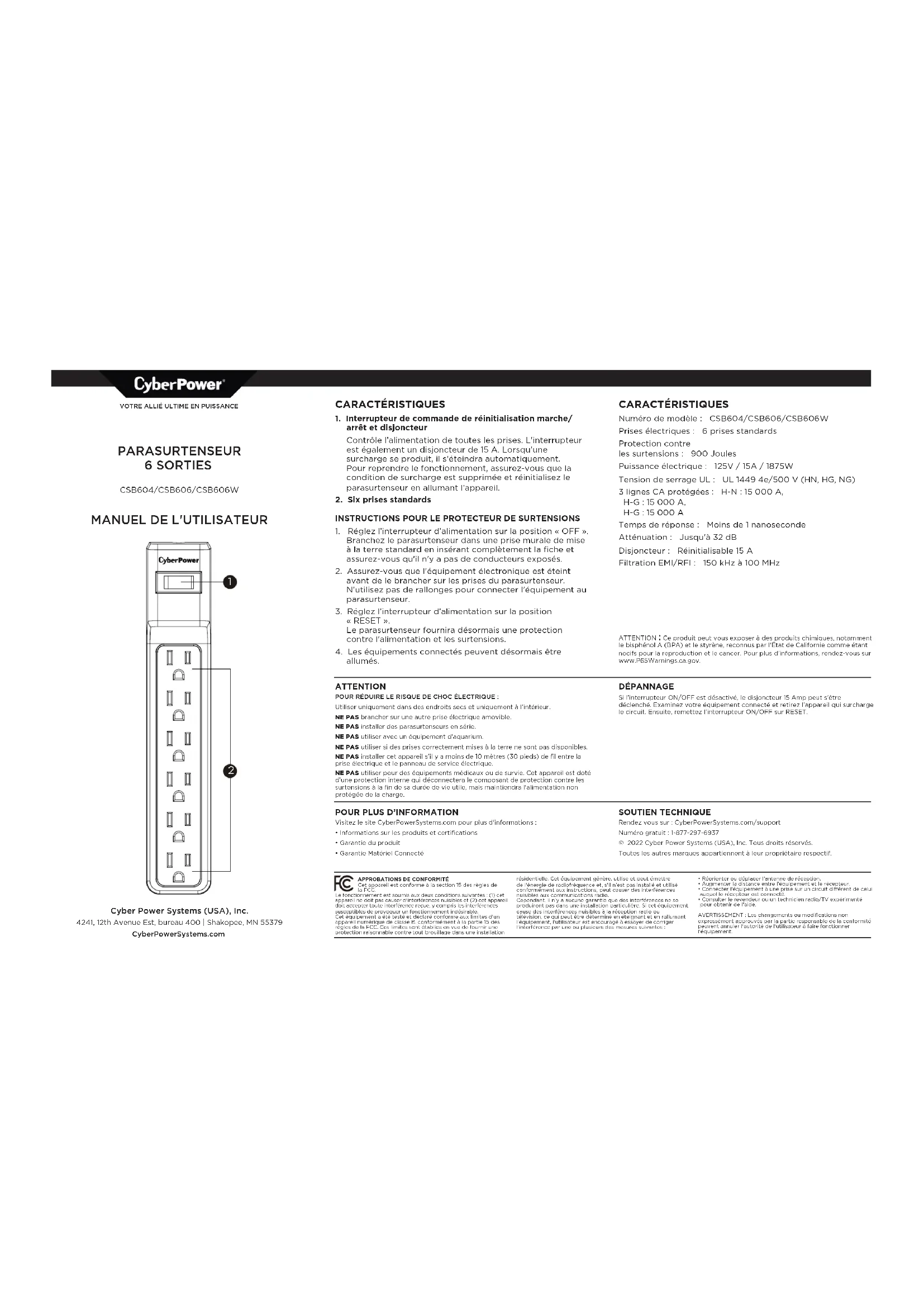 Cyber Power Systems (USA), Inc. 4241, 12th Avenue Est, bureau 400 | Shakopee, MN 55379 CyberPowerSystems.com CARACTÉRISTIQUES Numéro de modèle : CSB604/CSB606/CSB606W Prises électriques : 6 prises standards Protection contre les surtensions : 900 Joules Puissance électrique : 125V / 15A / 1875W Tension de serrage UL: UL 1449 4e/500 V (HN, HG, NG) 3 lignes CA protégées: H-N : 15000 A, H-G: 15000 A, H-G: 15000 A Temps de réponse : Moins de 1 nanoseconde Atténuation : Jusqu'à 32 dB Disjoncteur: Réinitialisable 15 A Filtration EMI/RFI: 150 kHz à 100 MHz ATTENTION: Ce produit peut vous exposer à des produits chimiques, notamment le bisphénol A (BPA) et le styrène, reconnus par l'État de Californie comme étant nocifs pour la reproduction et le cancer. Pour plus d'informations, rendez-vous sur www.P65Warnings.ca.gov.