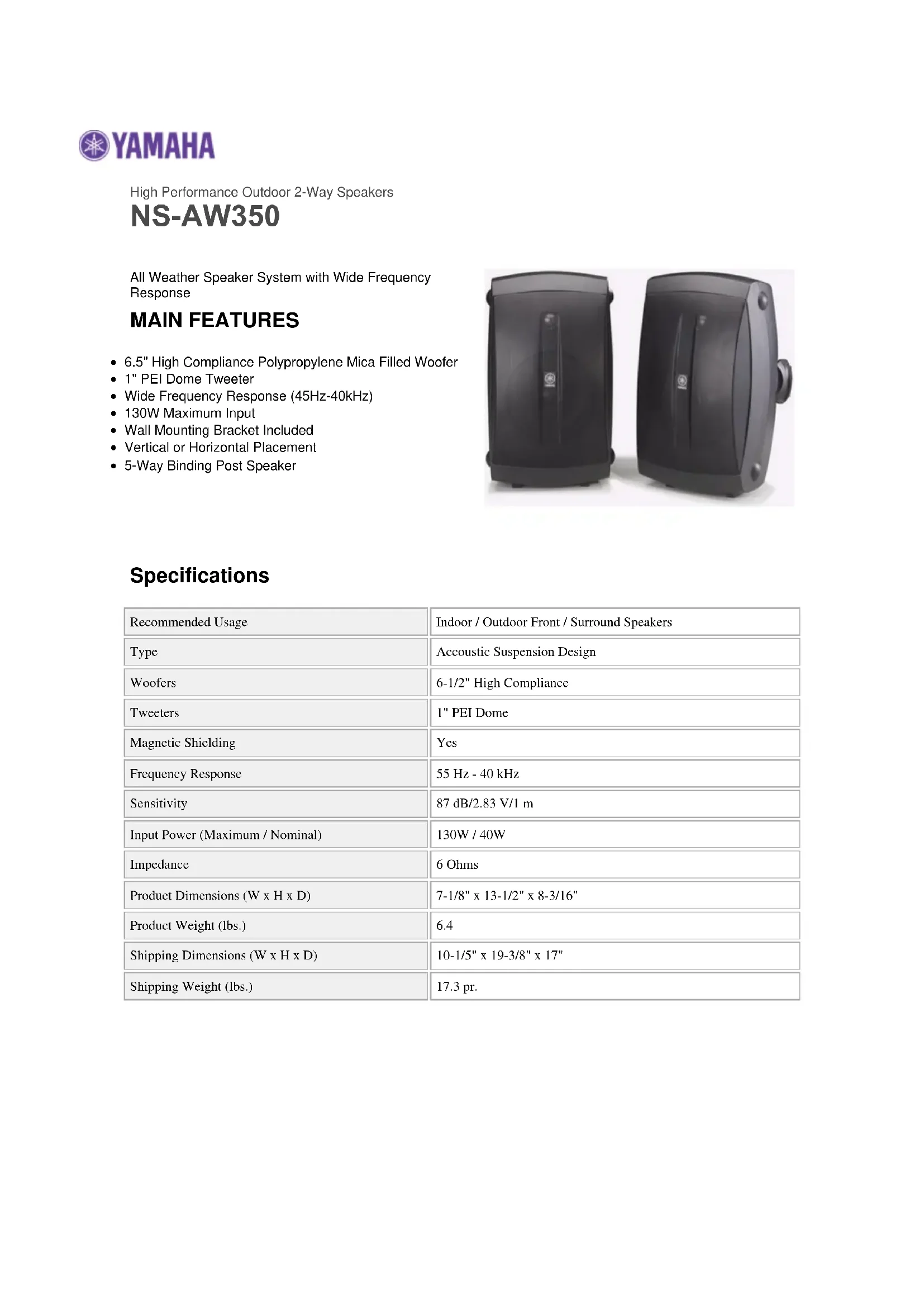 Le YAMAHA NSAW350 a une puissance nominale de 100 Watts, ce qui permet une excellente qualité sonore à des volumes élevés.