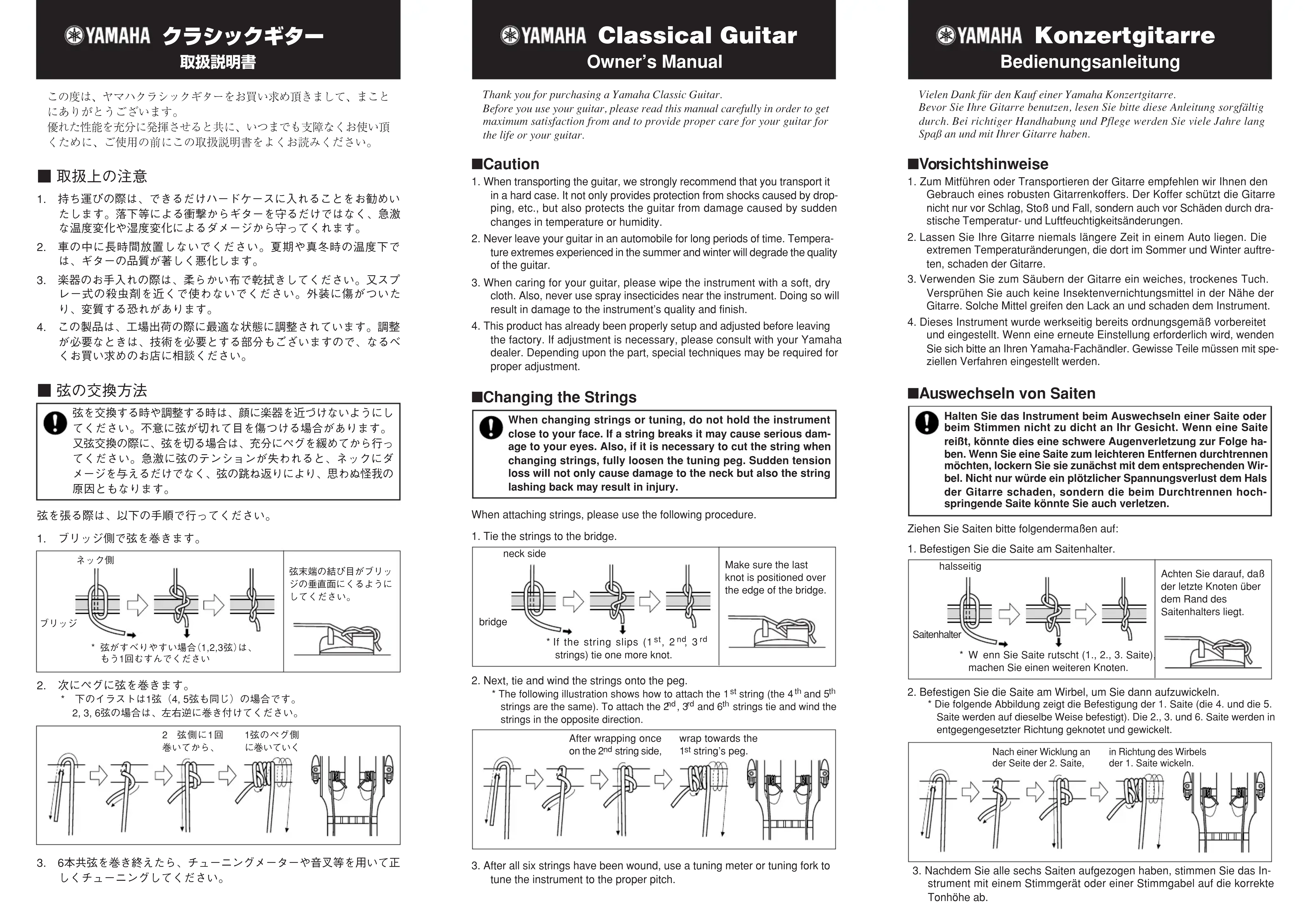 - La ilustración siguiente muestra cómo se coloca la 1.ª cuerda (las cuerdas4.ª y 5.ª se colocan igual). Para colocar las cuerdas 2.ª, 3.ª y 6.ª, ate y en-rolle las cuerdas en la dirección opuesta. Guitare classique Mode d'emploi Nous vous remercions d'avoir fait l'achat d'une guitare classique Yamaha. Avant d'utiliser votre guitare, veuillez lire entièrement et attentivement la présente notice de manière à obtenir un maximum de satisfaction de votre instrument et pouvoir lui assurer un entretien approprié pour toute sa durée d'utilisation. ■ Précaution 1. Lorsque vous devez déplacer votre guitare, nous vous recommandons vive-ment de la transporter dans un étui dur. Non seulement vous la protégerezcontre les chocs, les chutes, etc., mais vous la mettrez aussi à l'abri des brus-ques changements de température ou d'humidité.2. Ne laissez jamais votre guitare dans une voiture toutes vitres relevées pendantde longs moments. En effet, la température qui peut être très élevée en été etmême en hiver dans une voiture risque d'affecter la qualité de votre guitare.3. Lorsque vous transportez votre guitare, veuillez soigneusement l'essuyer avecun morceau d'étoffe souple et sèche. Par ailleurs, sachez que vous ne devezjamais pulvériser de produits insecticides à proximité de votre instrument. Lefait de pulvériser des produits insecticides près de votre instrument risque d'af-fecter la qualité de votre guitare et sa finition.4. Cet instrument a été préparé et réglé avant même de quitter l'usine et si desréglages sont nécessaires, veuillez vous renseigner auprès du distributeurYamaha. Selon la pièce concernée, des techniques spéciales peuvent s'avérernécessaires pour faire les réglages qui s'imposent. ■ Remplacement des cordes Lorsque vous devez remplacer ou accorder des cordes, ne te- nez jamais votre instrument près du visage. En effet, si la corde casse, vous risquez de vous blesser les yeux. Par ailleurs, si vous devez sectionner une corde au moment de remplacer tou- tes les cordes, desserrez complètement la cheville au préalable. Non seulement la libération brutale de la tension de la corde risque d'endommager le manche de la guitare mais la corde cin- glant après son sectionnement peut vous blesser. Procédez de la façon indiquée ci-dessous pour remonter les cordes.