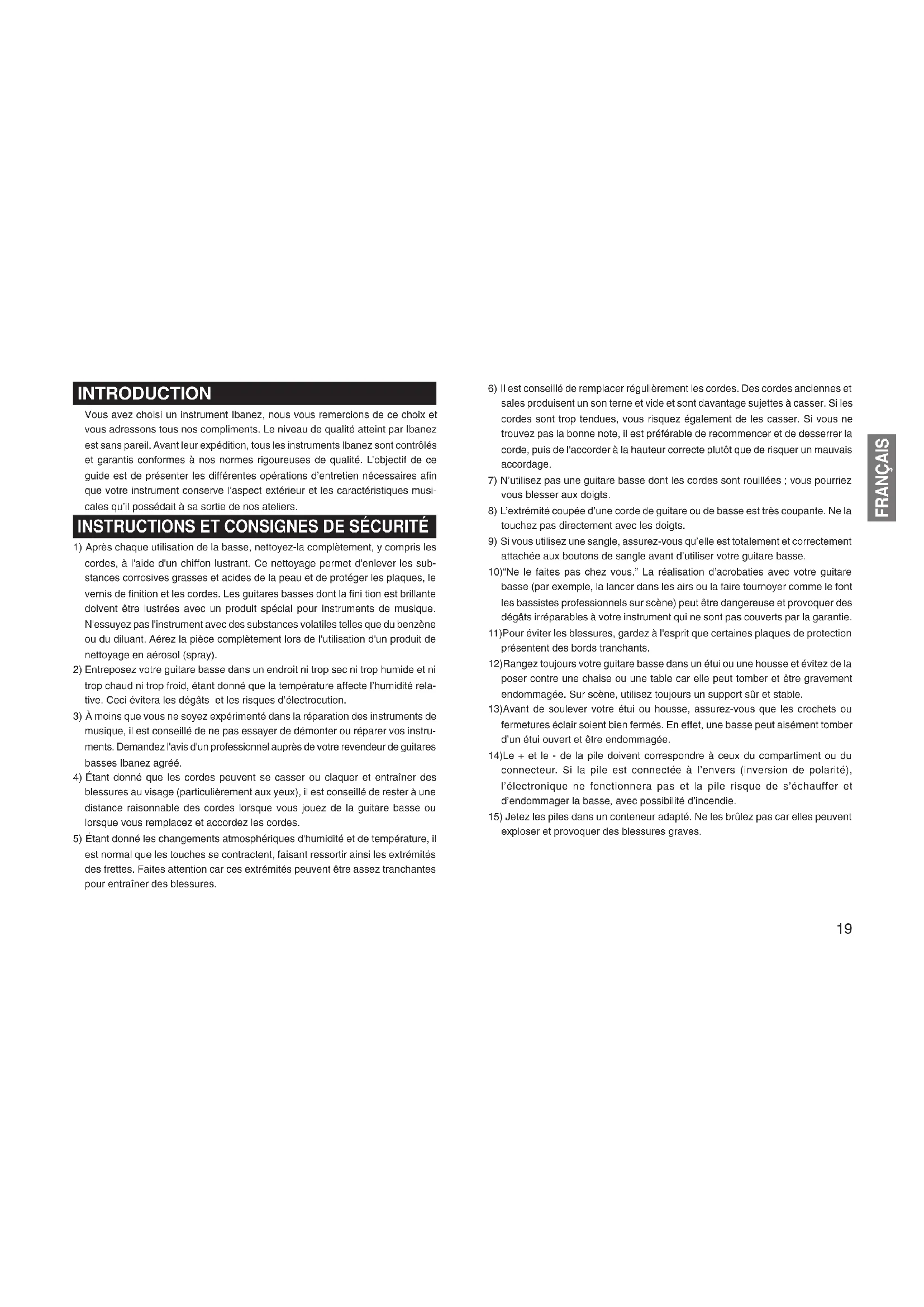 musique, il est conseillé de ne pas essayer de démonter ou réparer vos instru- ments. Demandez l'avis d'un professionnel auprès de votre revendeur de guitares basses Ibanez agréé.