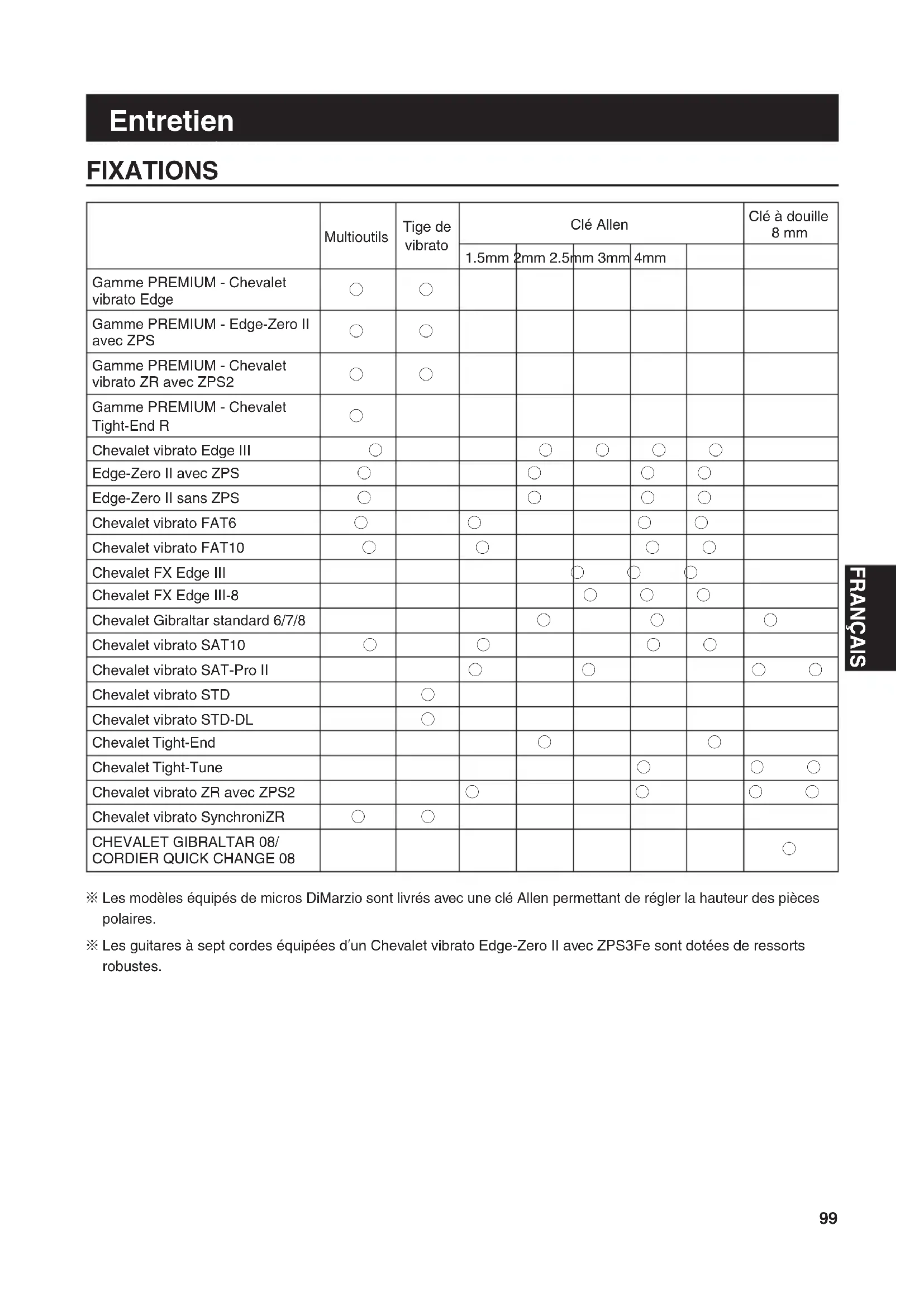 Les modèles équipés de micros DiMarzio sont livrés avec une clé Allen permettant de régler la hauteur des pièces ※ polaires. Les guitares à sept cordes équipées dʼun Chevalet vibrato Edge-Zero II avec ZPS3Fe sont dotées de ressorts ※ robustes.