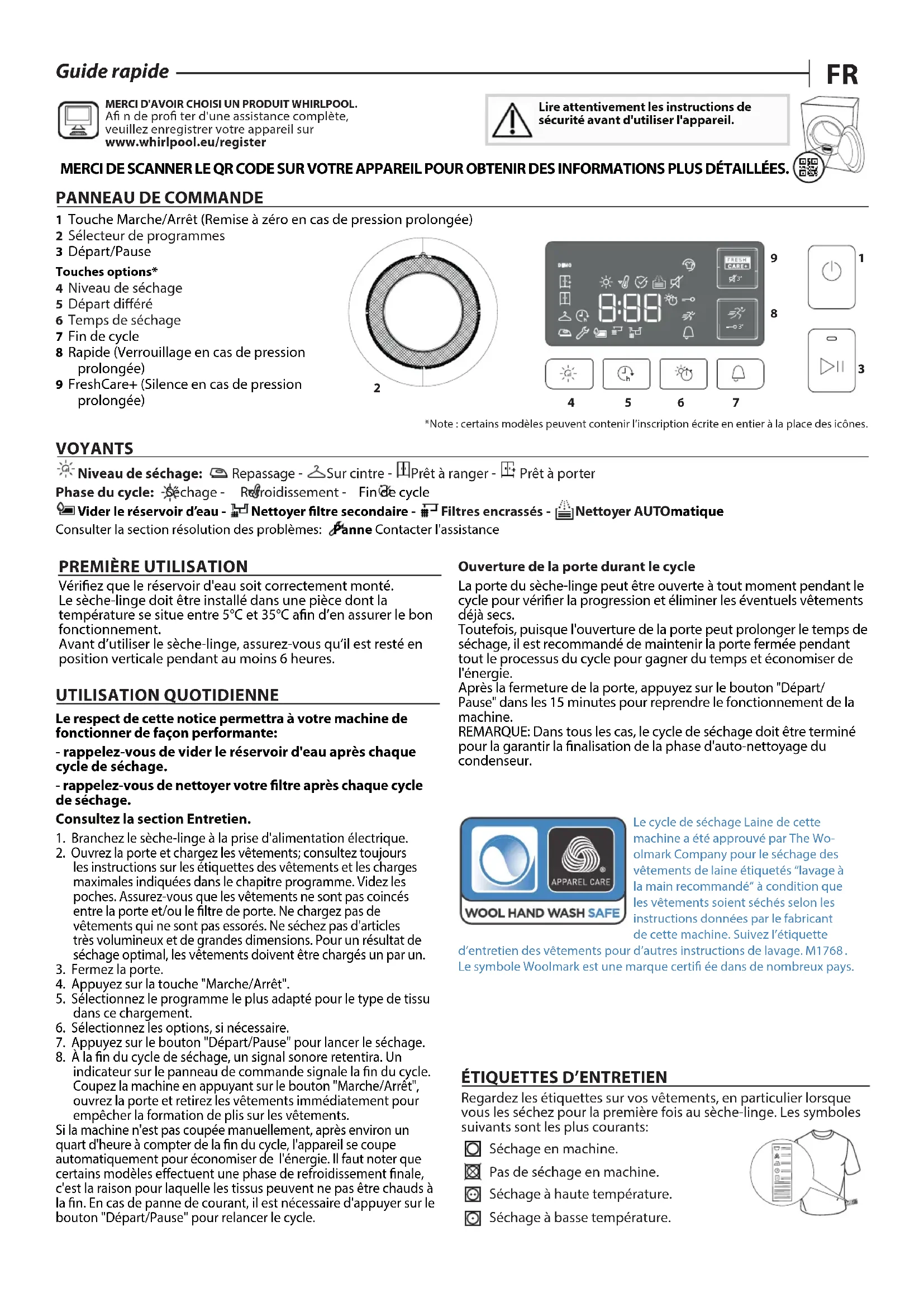 En cas de mauvais fonctionnement, avant de contacter l’assistance, contrôler le tableau ci-dessous. Les anomalies sont souvent de petite importance et elles peuvent être résolues en quelques minutes. Anomalie Cause possible Solution Les temps de séchage sont trop longs. Négligence dans la maintenance. Consulter la section Nettoyage et entretien et e ectuer les opérations indiquées. Le linge est trop humide. E ectuer un cycle de lavage avec un essorage important (tours minute plus élevés) pour éliminer le plus d’eau possible. Température ambiante.La durée du séchage pourra être supérieure si la température de la pièce se situe hors de la plage 14-30°C.Le programme, les temps et/ou le niveau de séchage programmés ne sont pas adéquats pour le type ou pour la quantité de charge introduite dans le sèche-linge. Consulter la section Programmes et options pour trouver le programme et les options les plus adéquats au type de charge e ectuée.Le sèche-linge pourrait être surchargé. Consulter la section Programmes et véri er la charge maximum admise pour chaque programme. Le sèche-linge ne s’allume pas. La touche Marche/Arrêt n'a pas été enfoncée. Appuyez sur la touche Marche/Arrêt. La che n’a pas été branchée dans la prise de courant. Brancher la che dans la prise de courant.La prise de courant est endommagée.Essayer de brancher un autre appareil électroménager dans la même prise. Ne pas utiliser de dispositifs électriques de branchement à la prise tels que des adaptateurs ou des rallonges. Une coupure de courant électrique s’est véri ée.Attendez que l'alimentation électrique soit rétablie et relancez le fusible si nécessaire. Le sèche-linge ne démarre pas. La porte n'a pas été fermée correctement. Fermer la porte. On a programmé un départ di éré pour le démarrage du cycle. Sur les machines avec cette fonction : attendre la n du départ di éré programmé ou éteindre la machine pour la réinitialiser. Consulter la section Options. La touche Départ/Pause n’a pas été enclenchée. Appuyer sur la touche Départ/Pause.Sur les machines munies de la fonction Verrouillage touches, cette option a été actionnée.Consultez le chapitre Options. Si le Verrouillage a été sélectionné, désactivez-le. L'extinction de la machine ne désactivera pas cette option.Les vêtements sont mouillés à la n du cycle.Faible charge. Le programme automatique n'a pas détecté l'humidité nale requise et le sèche-linge achèvera le programme et s'arrêtera. Si cela se produit, il su t de sélectionner une courte durée de séchage supplémentaire ou de sélectionner une option extra-dry (ultra-sec) si elle est disponible. Grosses charges ou tissus plus lourds. Les niveaux de séchage peuvent être modi és en fonction de la nition de séchage souhaitée. Le niveau "Prêt à porter" est recommandé pour les a aires que vous souhaitez porter directement à la n du cycle.Le cycle de séchage a été mis en pause et n'a pas été réactivé dans les 15 minutes, provoquant ainsi l'arrêt de la machine. Le cycle de séchage doit être réinitialisé et relancé.Une panne de courant peut s'être produite, provoquant l'arrêt de la machine.Le cycle de séchage doit être réinitialisé et relancé. Voyants lumineux allumés ou clignotant Réservoir d'eau Le réservoir d'eau est plein. Vider le réservoir d'eau. Consulter la section Nettoyage et entretien. Filtre de porte Anomalie dans le ux d’air nécessaire pour le fonctionnement de la machine. Nettoyer le ltre de porte et contrôler que la grille d'entrée d'air soit libre. Si ces opérations ne sont pas e ectuées correctement, le sèche-linge peut subir des dommages. Consulter la section Nettoyage et entretien. Filtre inférieur* Le ltre inférieur a besoin d’être nettoyé. Nettoyer le ltre inférieur. Consulter la section Nettoyage et entretien. La présence du symbole de la clé anglaise indique une anomalie.Les capteurs de la machine ont relevé une anomalie. Éteindre le sèche-linge et le débrancher du réseau électrique. Ouvrir immédiatement la porte et extraire le linge, de façon à ce que la chaleur puisse se dissipée. Attendre 15 minutes. Rebrancher le sèche-linge au réseau électrique, charger le linge dans le tambour et lancer le cycle de séchage. Si le problème persiste, contacter le Service d’Assistance et communiquer les lettres et les numéros qui clignotent sur l’a cheur. Par exemple F3 et E2. *Note : certains modèles sont autonettoyants; non munis de ltre inférieur. Consulter la section Nettoyage et entretien.DANK U WEL VOOR UW AANKOOP VAN EEN WHIRLPOOL PRODUCTVoor verdere assistentie kunt u het apparaat registeren op. www.whirlpool.eu/register De bedrijfsregels, standaarddocumentatie, bestellen van onderdelen en aanvullende productinformatie kunt u vinden door: